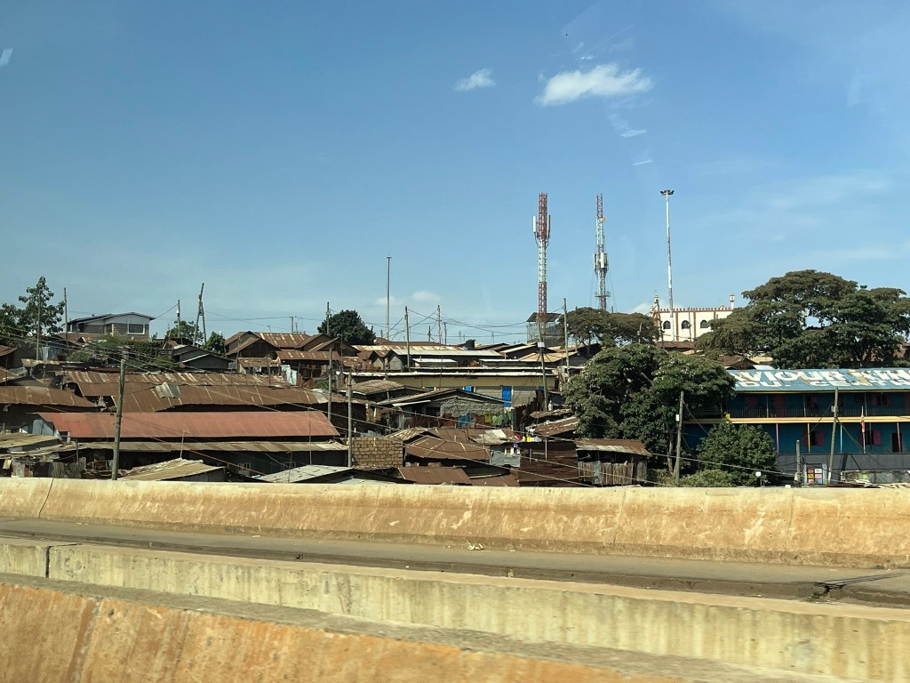 On the drive back to the hotel we left the well-groomed suburbs of Karen and heading back into the city crossing through what is said to be the largest slum in Africa – Kibera. A patchwork sea of rusting corrugated iron roofs. A maze of hundreds of narrow alleys only a local resident could navigate. But at least from what I could see as we passed by, a lot of life and energy. All down the side of the highway were shacks set up as restaurants, barbers, fruit stands and every other kind of necessity for daily living. I’m glad we saw that part of Nairobi as I don’t expect my city tour tomorrow will visit this area and I think its important to see the difficult parts of a city landscape. You can’t pretend its not there and it’s better to see it with your own eyes and better understand it, than have a fake image of what a slum looks like in your mind.