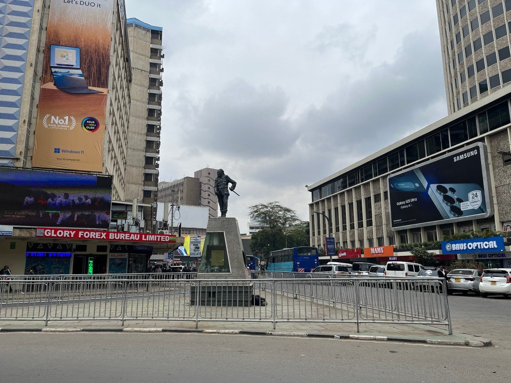 Next up was a monument to Dedan Kimathi – a key military leader in the Mau Mau resistance against British colonial rule in the 1950’s. Although the resistance was not successful, it changed Kenya’s path and accelerated political reform. The guide said usually the statue was holding a rifle but it seemed to have disappeared since the the protests last month. This gave me an excellent opportunity to learn from a local what the protests were about. Our guide explained that they had been happening since last year and were related to unhappiness with the current government who have been raising taxes and not solving serious unemployment issues for the younger generations whilst the individuals of the government flaunt enormous wealth, buying helicopters and wearing expensive designer clothing. The groups supporting the protests have been very organised, with protests happening each Tuesday and Thursday over a long period of time, bringing the city frequently to a standstill.