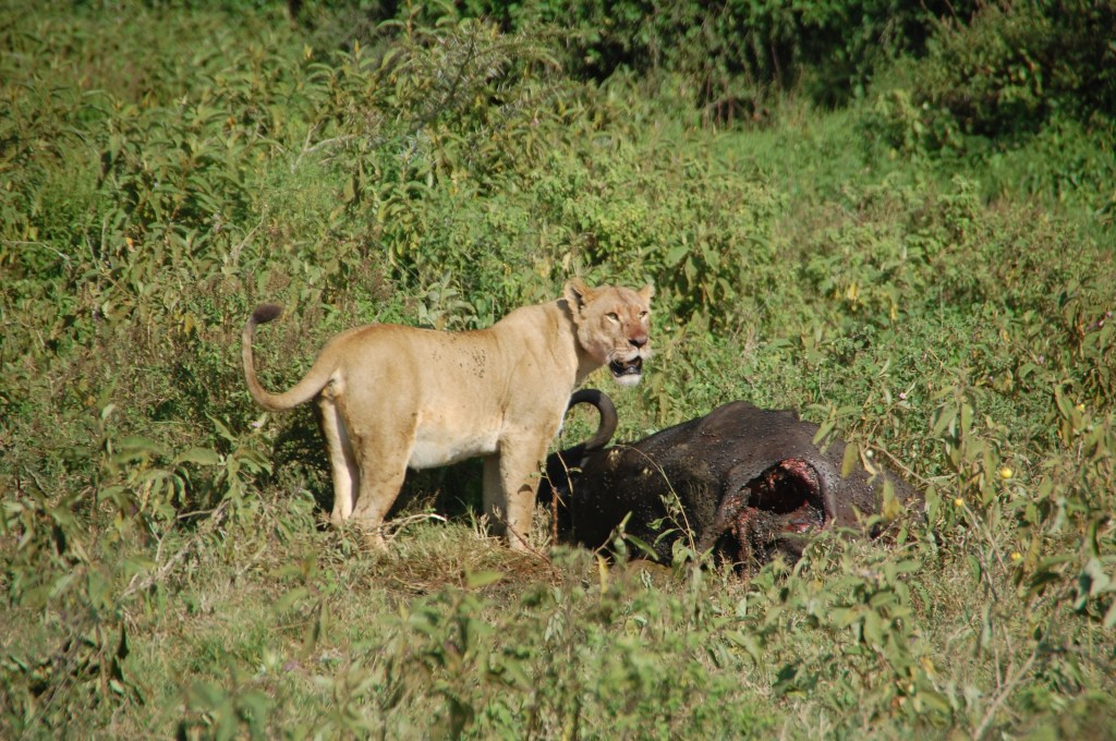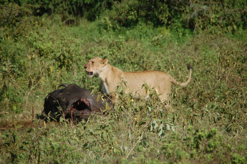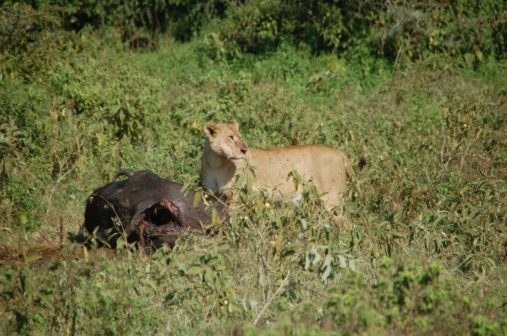 Mid-way through this morning’s game drive we came across a water buffalo carcass just off the side of the track in the brush. We quickly parked up, knowing that this was likely a fresh kill from the night before by a pride of lions and that they wouldn’t be far away. We knew it was fresh because the vultures and hyenas had not yet arrived on the scene to devour the parts of the animal the lions are not interested in. We knew we might have to wait a little while for the lions to emerge from wherever it was they were hiding, but were happy to watch and wait. And to our surprise within a couple of minutes of parking a lioness emerged from a shady set of bushes and continued to eat the buffalo. We could also see that there was at least 1 male and 1 female lion back in the bushes who occasionally stood up and moved around but didn’t come out into the open. They must have eaten a lot of the animal last night and this morning as we could see main body of the carcass had been hollowed out already.