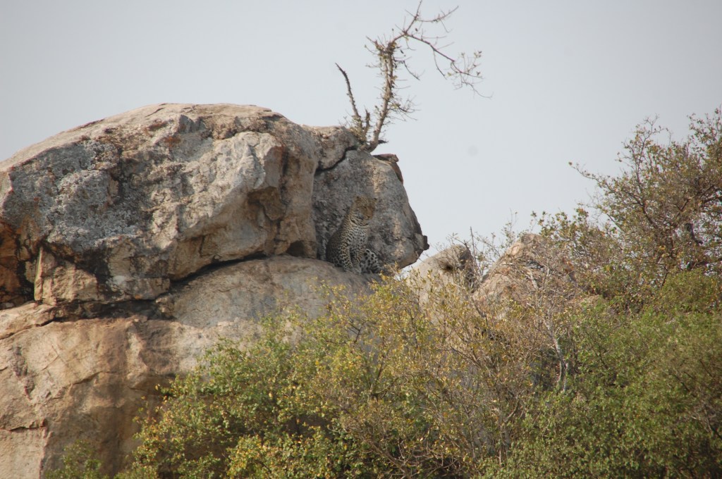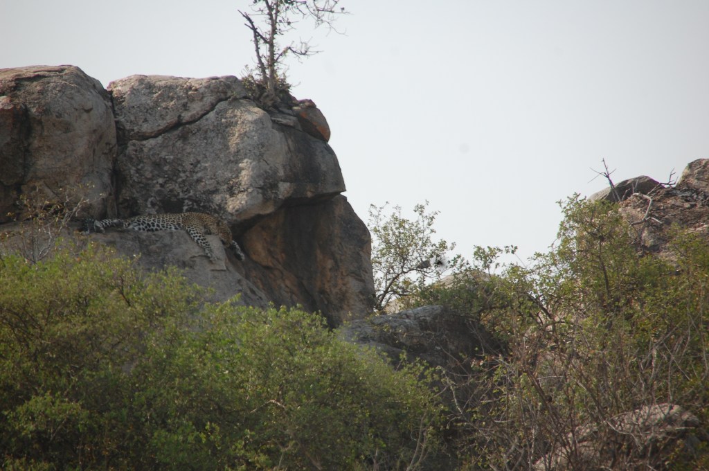 We had been scanning trees for the last couple of days, especially ones with big, fat, horizontal branches that the leopard might retreat to with a kill. But no luck so far. So when we saw a group of land cruisers stopping at a Kopje granite outcrop this morning and all looking at something way up high in a crevice, I did not think it might be a leopard. But luck was on our side and it was a female leopard stretched out along a thin lip of rock jutting out near the top of the Kopje with its huge paws drooped over the side.