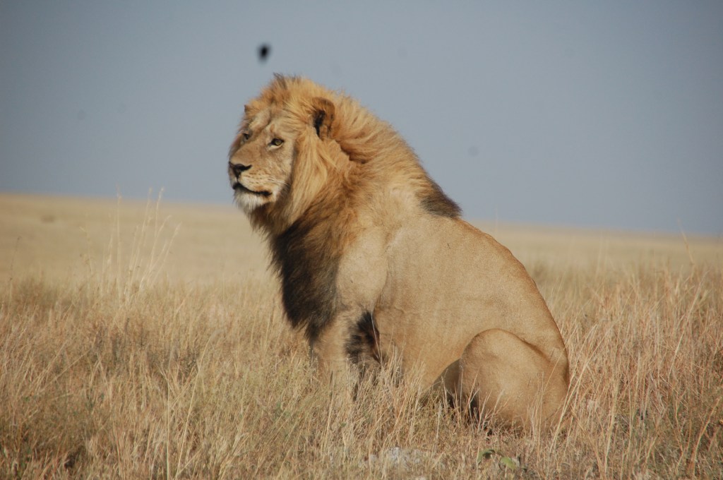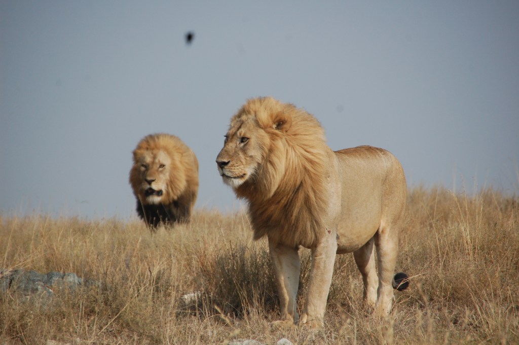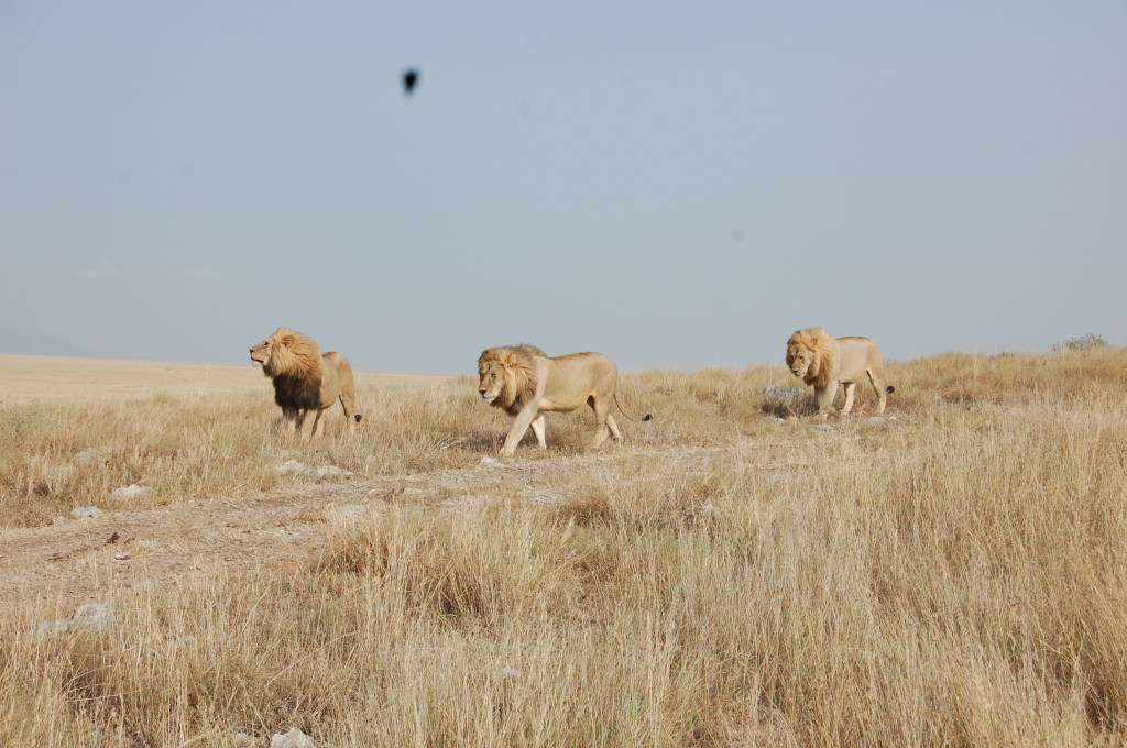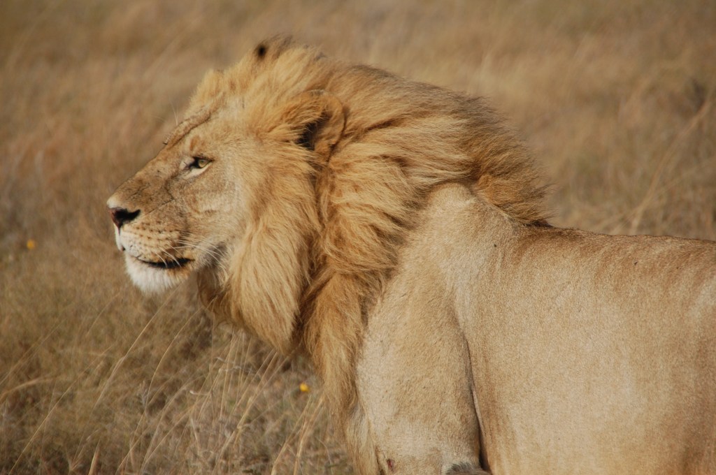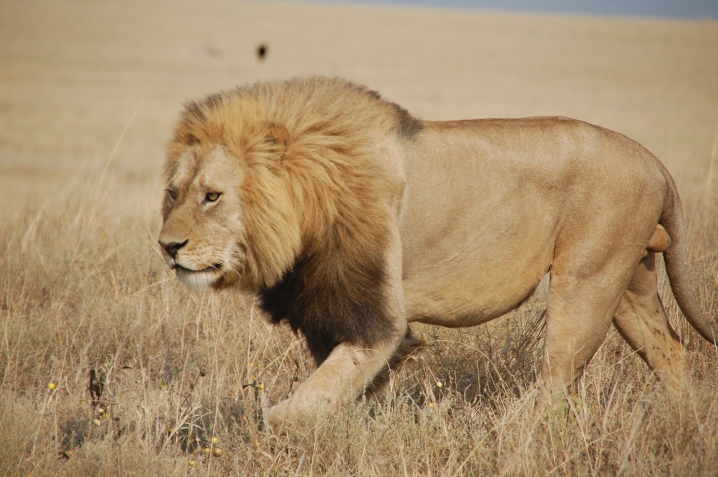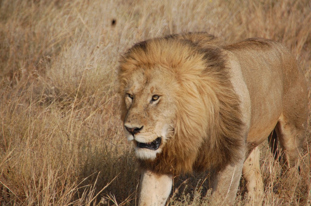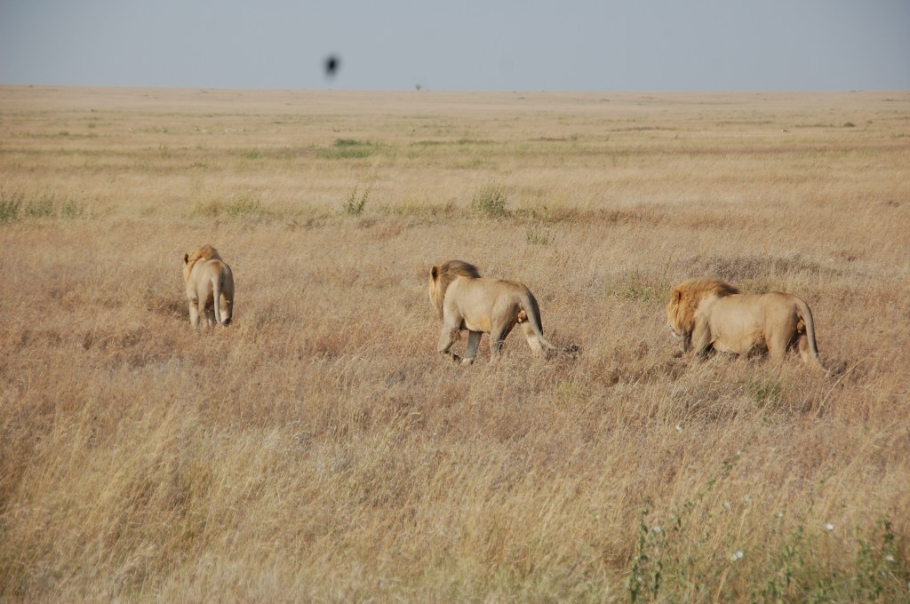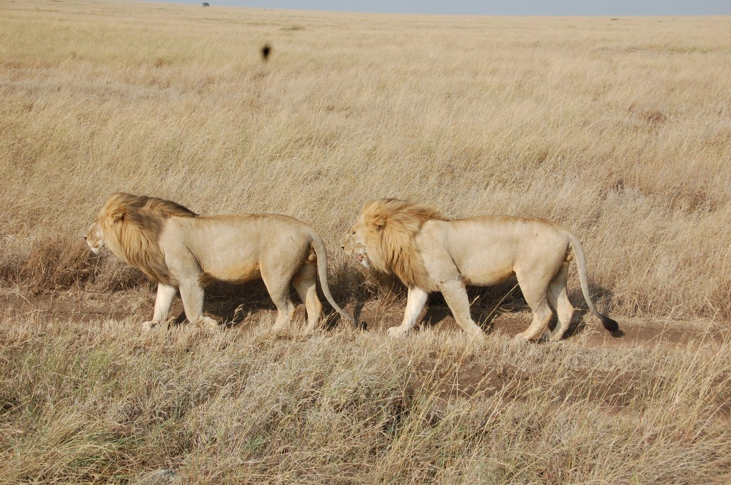 As we slowly made our way out of the Serengeti on penultimate game drive of the trip we came across three huge male lions – brothers. They were on the move, slowly walking in a line across the open grassland. They would occasionally stop, survey the land around them and mark their territory. They had likely been out patrolling last night and were now on their way back to join their pride. The wind was quite strong and it meant the lions huge manes were swept back making them look like they were posing for a hair conditioning advert.