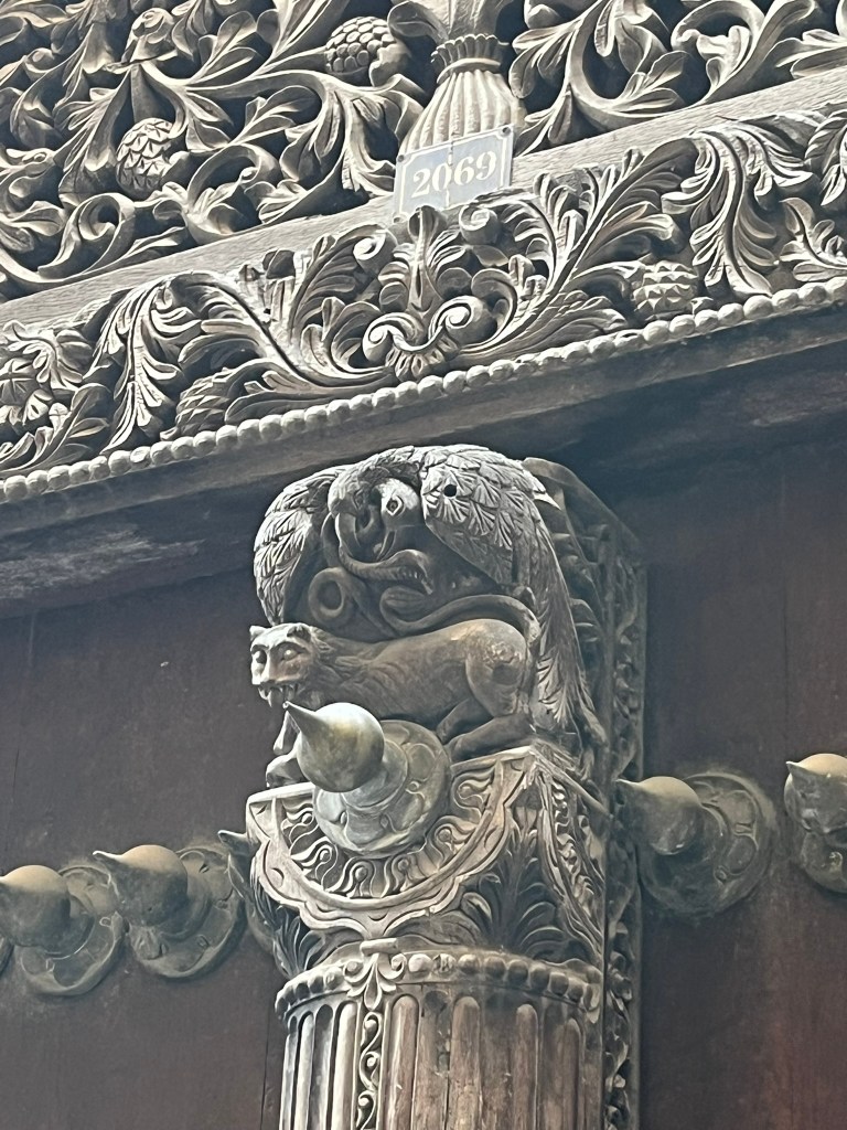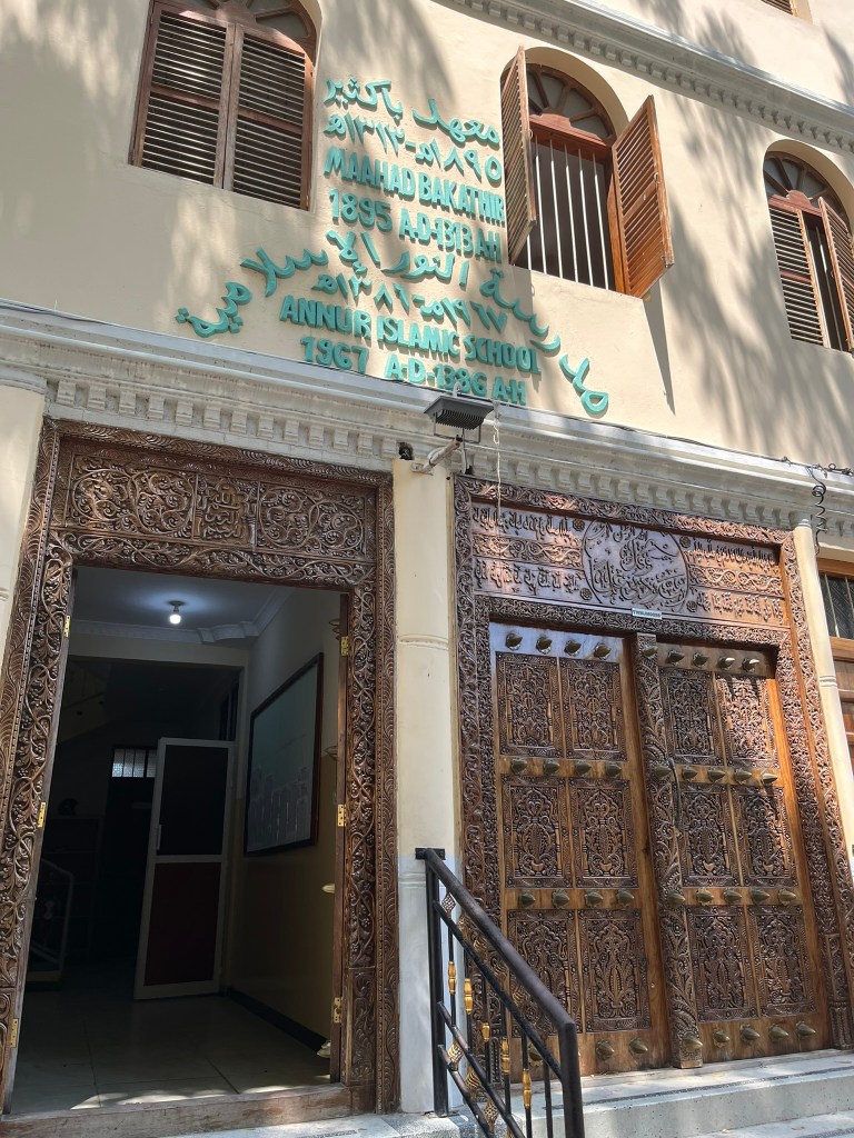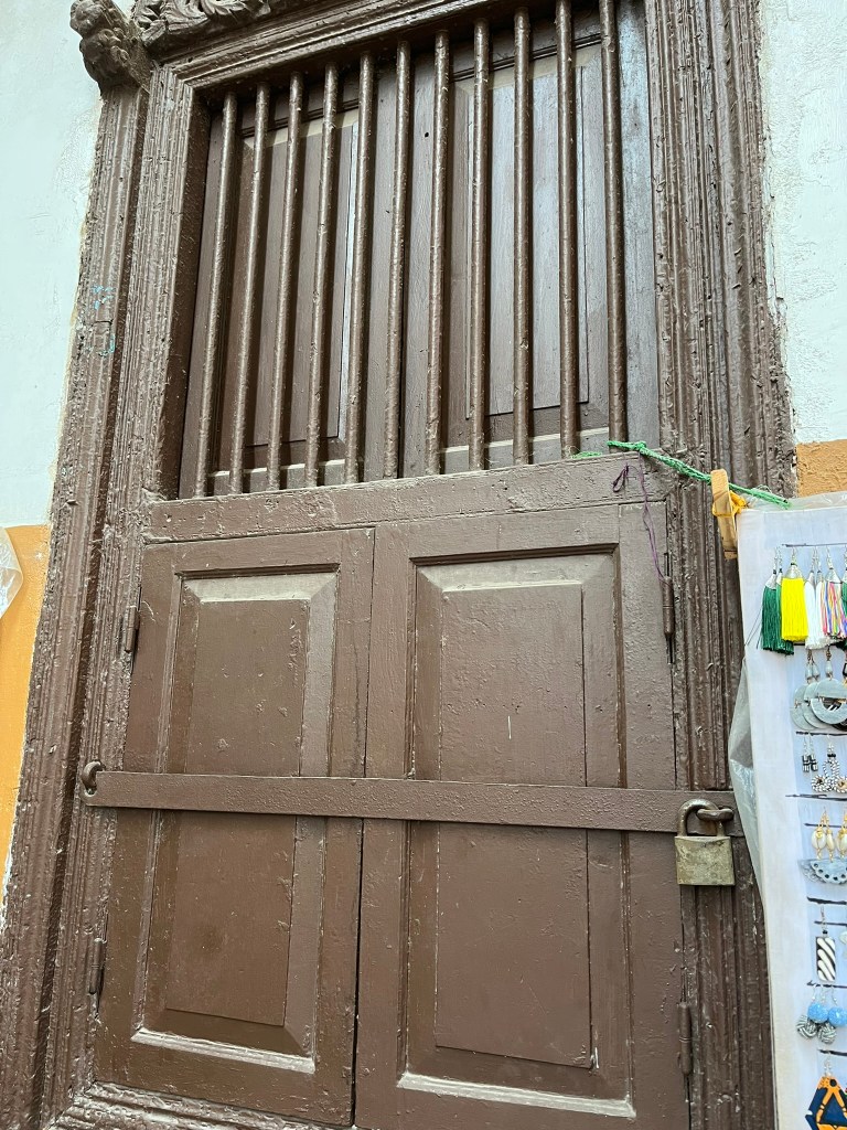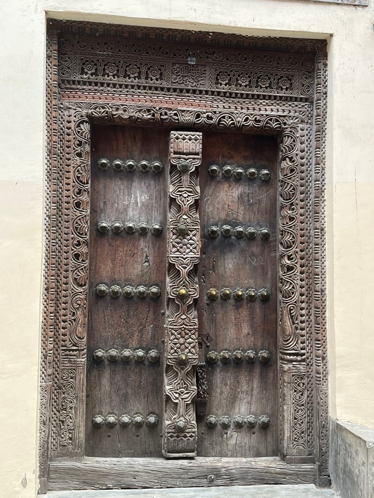 I won’t go into the details of every style of door. But just cover the basics. Rectangular frames with simple geometric designs and a plain lintel were Swahili. Arab and Omani-style were tall and rectangular with rich carved panels and Quranic inscriptions. Indian-Gujarati-style are square, sometimes with arches, and heavy brass studs. The studs come from those used in India meant to protect against war elephants but here in Stone Town are to depict the wealth and power of the individual that owned the property. British style windows would have stained glass. Swahili-style windows on the other hand would have slatted shutters that could be opened and closed. The carvings on each door reflect the profession of the owner.