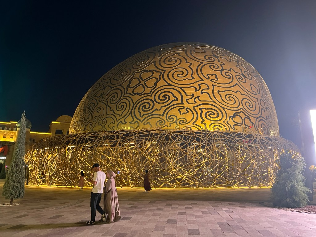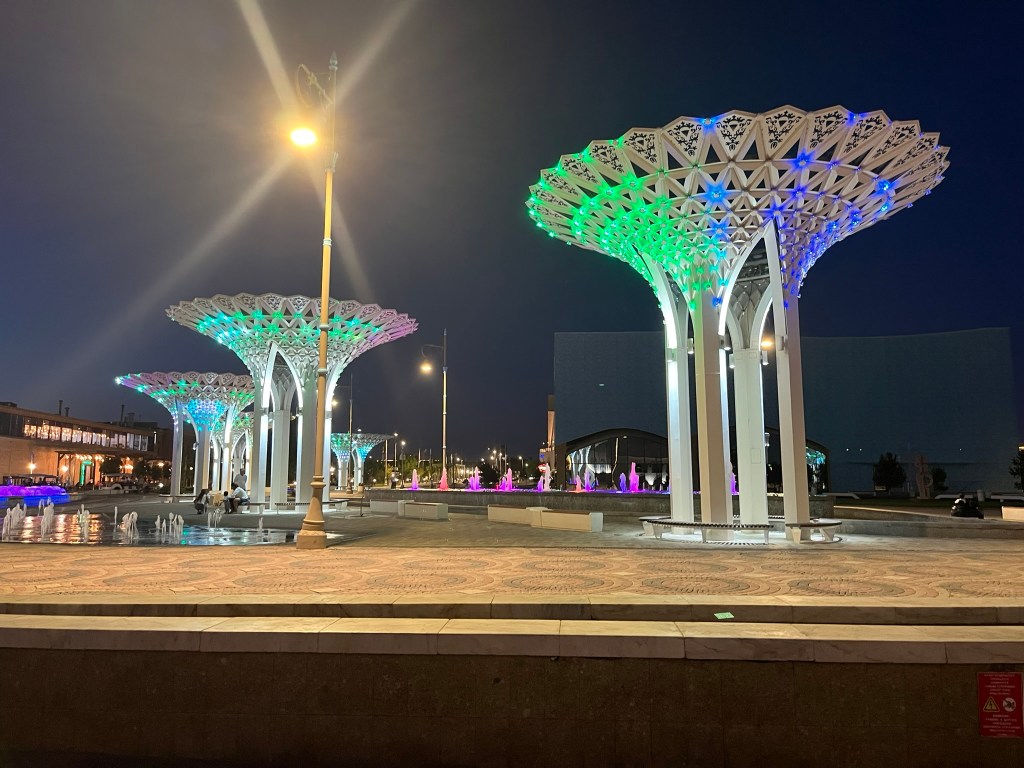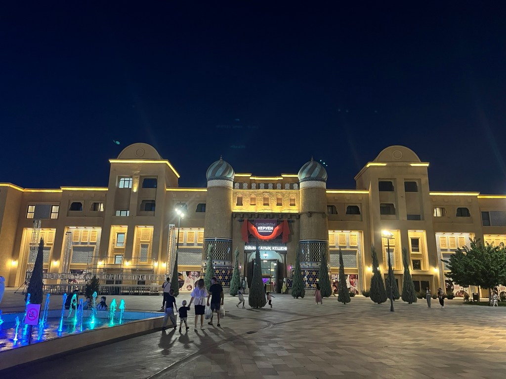 This evening we visited modern Turkestan which has been heavily invested in, transforming it into a tourist and cultural hub. A modern caravanserai complex has been built close to the ancient mausoleum, meant to give the sense of what it was like during the days of the Silk Road. Although it is modern, it is a nice development with lots of families still out late at night letting their kids play in the light-up fountains, outdoor dining and shops to explore.