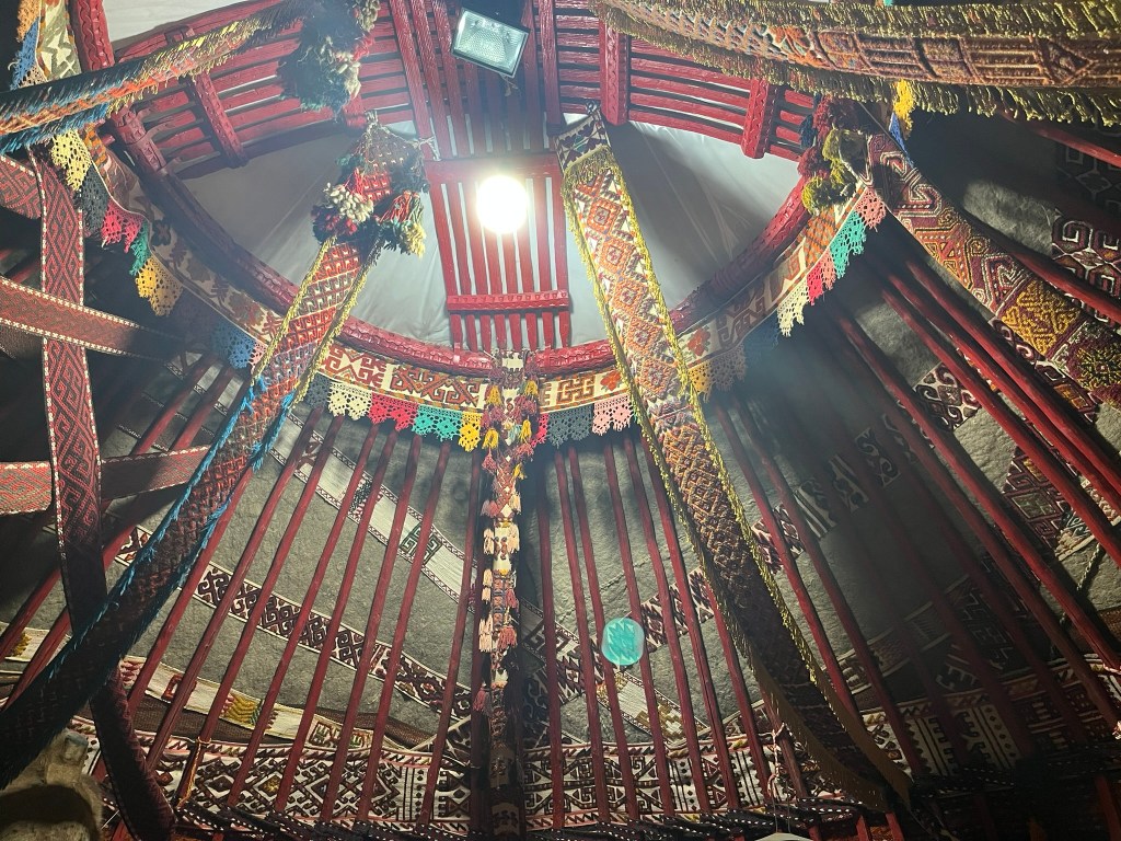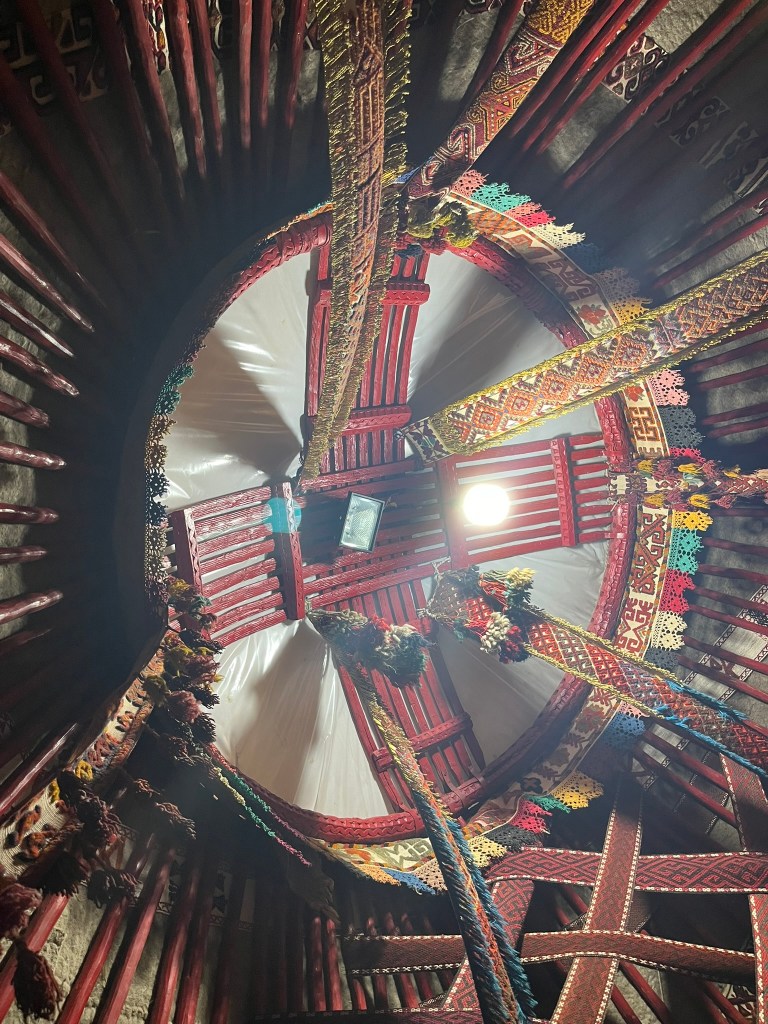 We then spent some time sitting inside a yurt. The structure is formed of a lattice wall that can easily collapse if the tribe is moving, the roof poles connect with the lattice wall and slope upwards to create the dome shape and finally the most important piece, the shanyrak, or round wooden ring where the roof poles slot in. The centre of the roof is open, allowing sunlight in and smoke out. The shanyrak is very important in Kazakh culture and is even their national emblem.