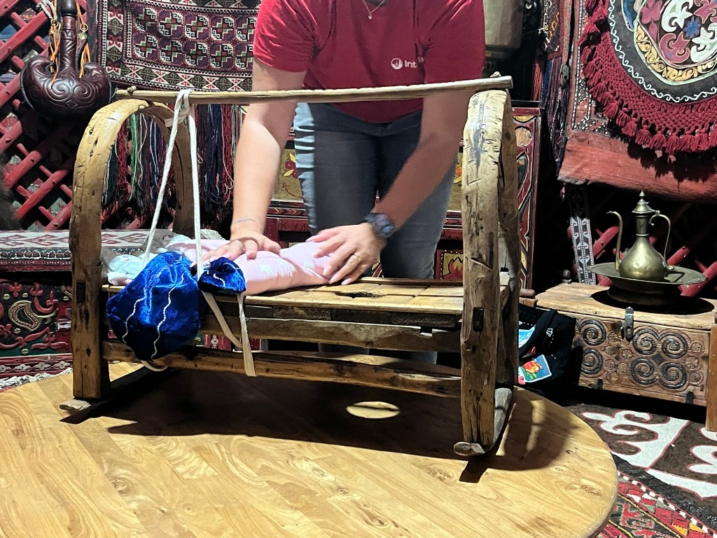 Traditionally the space is divided into the right-side for men, where they can store their hunting gear, weapons and tools. And the left side for women, providing storage for kitchen equipment and a cradle. Our guide showed us the unique way Kazakhs have designed their cradles to suit their nomadic lifestyle, with straps to tie the baby in and a hole in the bottom for babies to use as a toilet, ideal for taking them on long horse rides. A cradle is a precious item for Kazakh nomads and would be passed through the generations as a family heirloom.