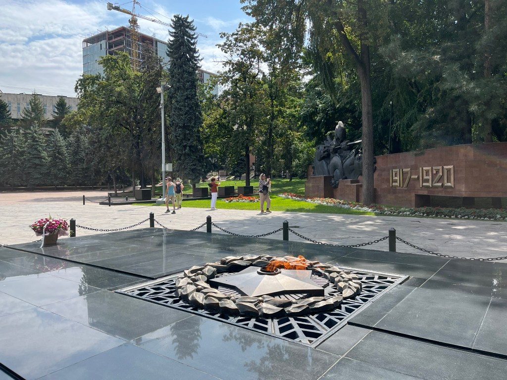 We first headed into 28 Panfilov Guardsmen Park, located in the center of the city. It has 3 key historical sights. The park is named after a unit of Kazakh soldiers who heroically died to stop Hitler from reaching Moscow during WWII. There is a memorial area in the newer part of the park that has an absolutely incredible granite sculpture commemorating the Panfilov Guardsmen. We arrived from behind the statue and as we turned the corner to see its full extent we were all in awe. It really evokes the sense of power and urgency of people at war. The memorial area also has statues for those that died during the October (Bolshevik) Revolution and the Afghanistan war.