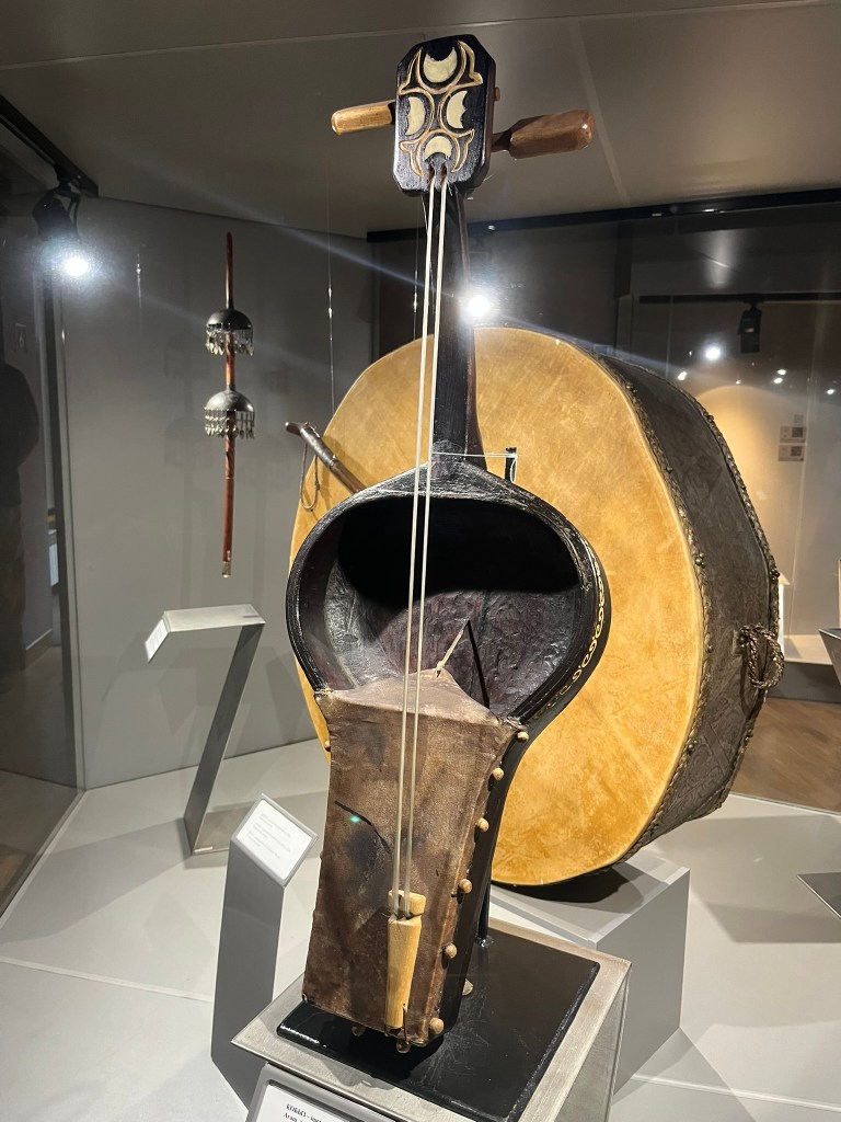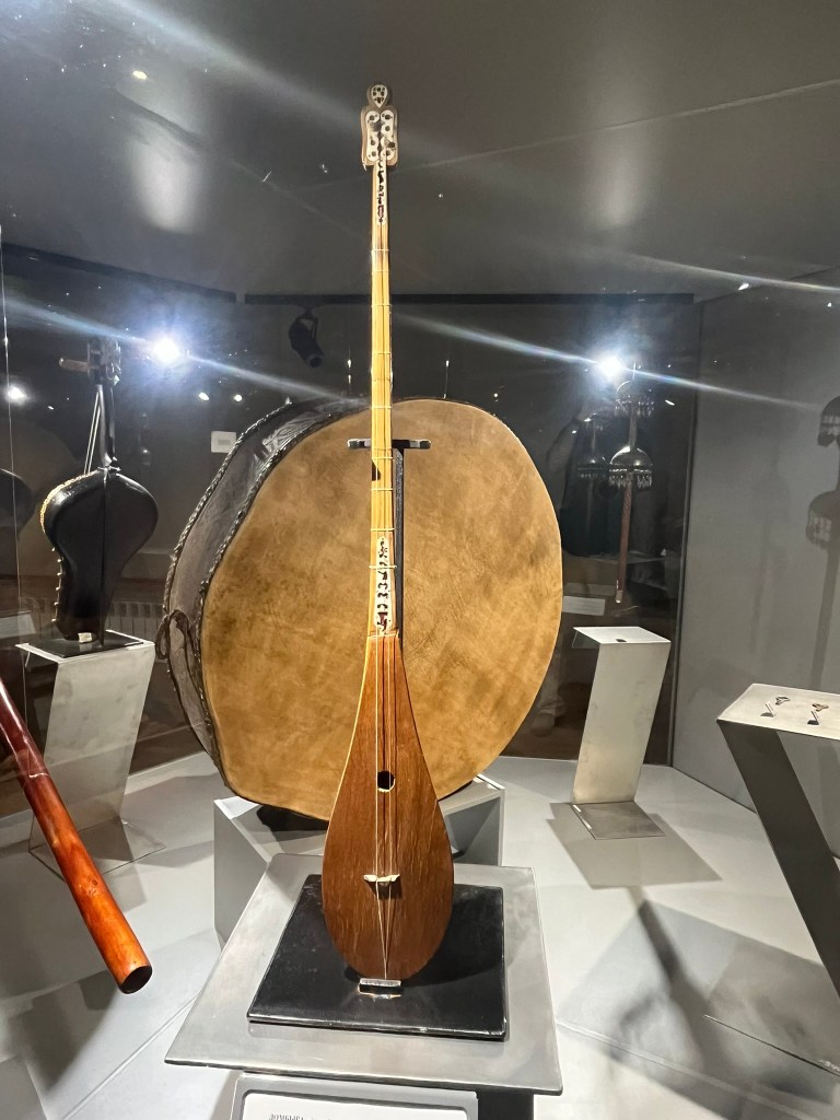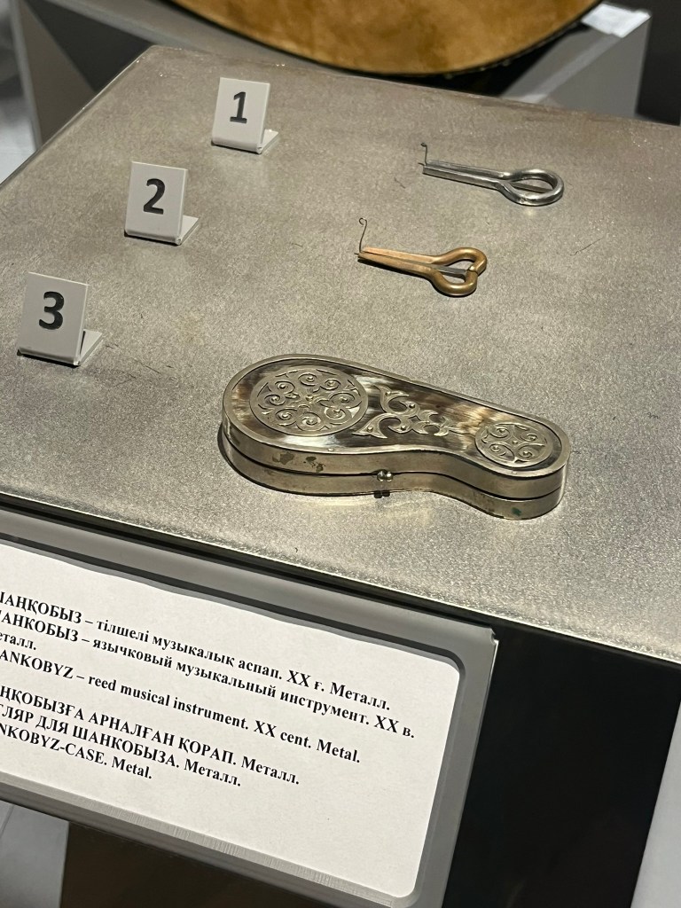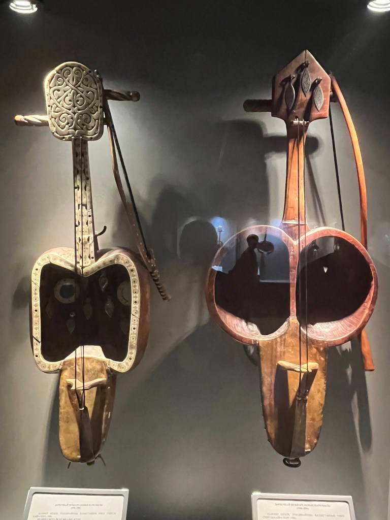 The most famous instruments are the the dombyra which is long-necked 2-stringed lute, the kobyz which is a bowed stringed instrument with a really interesting hollowed bowl shape, and finally the shankobyz which is held between the teeth and plucked with a finger. Our guide played a short piece of modern folks music that a local band called Arkaiym has produced using these instruments and it felt very modern and something you could easily listen to on the radio.