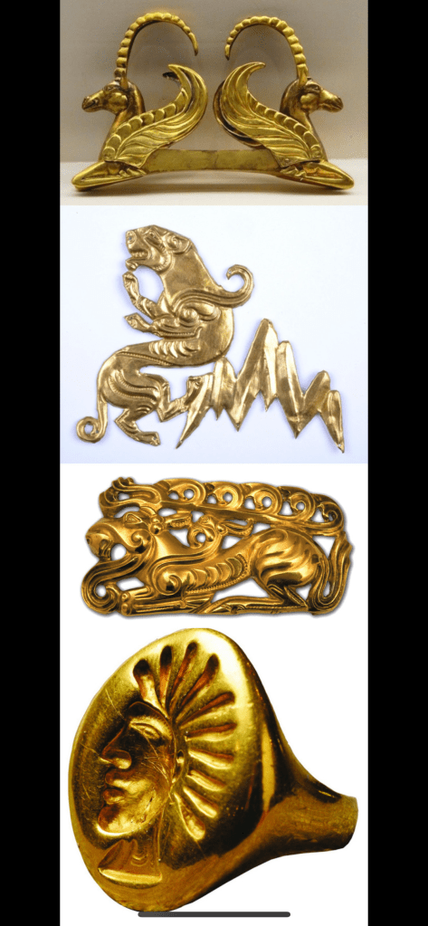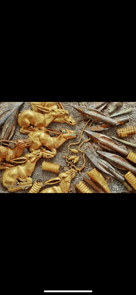 The Scythians were Iranian-speaking nomads across the Eurasian steppe from the 8th-3rd BC, who originated from earlier Indo-Iranian cultures. In Kazakhstan they are called the Saka. They moved with their herds of horses, sheep and cattle across the steppe, but they also cultivated crops in river valleys. And they were famous for horse-archery and mounted warriors. They were also regarded as master goldsmiths and mostly created gold objects with depictions of birds, snow leopards and deer. They had a belief system centered around the sky, sun and fire (early proto-Zoroastrian) mixed in with shamanistic practices, and burial was an important part of the process to reaching the afterlife. They were not a kingdom or empire, rather a confederation of nomadic tribes whose territory shifted and overlapped.