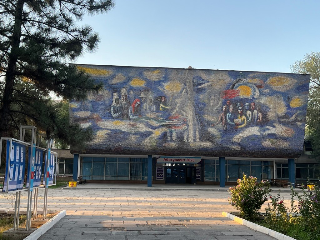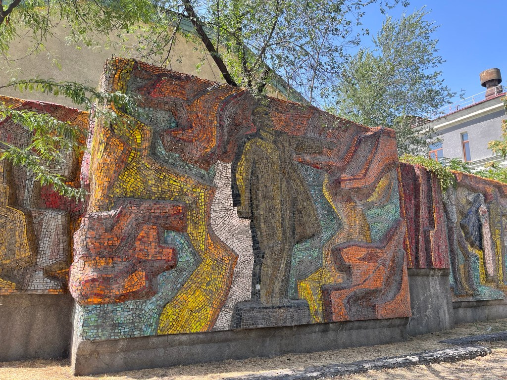 We then hopped onto our bus to see some of the Soviet mosaics that Bishkek is famous for. These are scattered across the city rather than being in prominent locations like the main squares. They were commissioned between the 1960s-80s to help beautify public spaces. A colored class tile called smalti, as well as ceramic and stone was used to create these mosaics. This style of art was chosen over painting because it would weather the harsh climate better. The style is a mix of socialist realism depicting workers and farmers combined with Kyrgyz folk art.