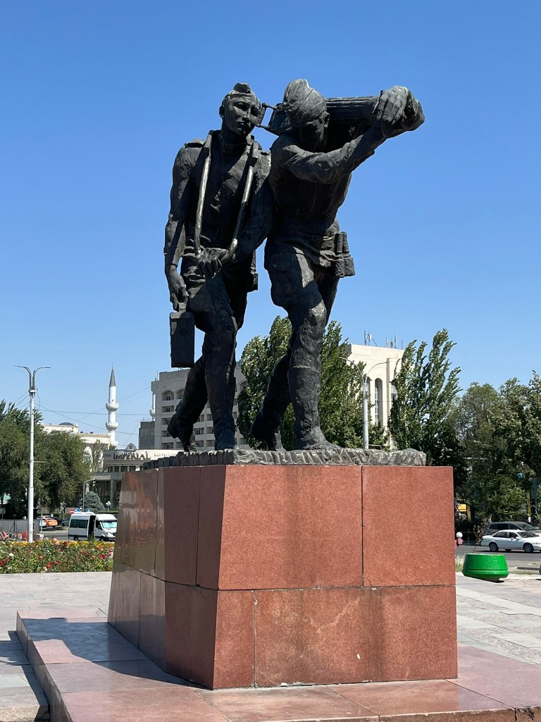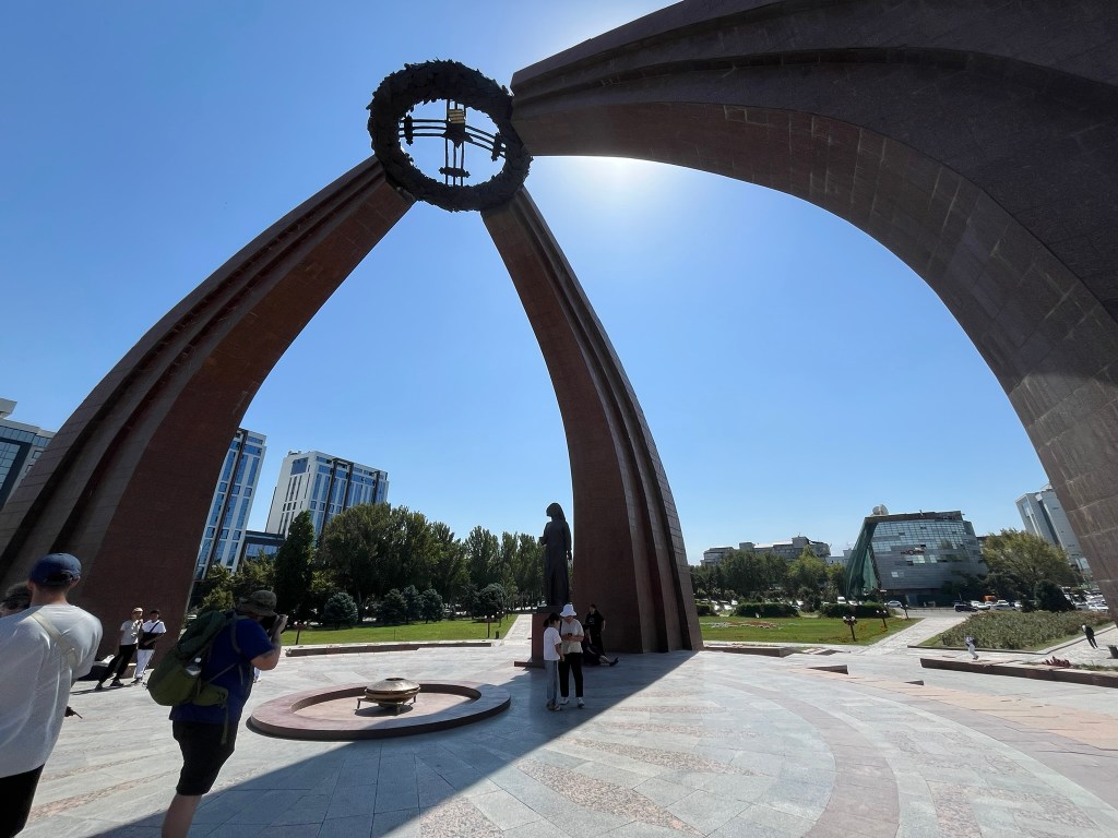We ended the walking part of the tour in Victory Square. Like most of the other monuments we had seen, this area was built in the 1980’s and dedicated to those involved in The Great Patriotic War. The three granite arches reach up into the sky like the ribs of a traditional yurt and bend inwards to connect to the central tunduk holding the yurt together (same thing as a shanyrak in Kazakhstan).
