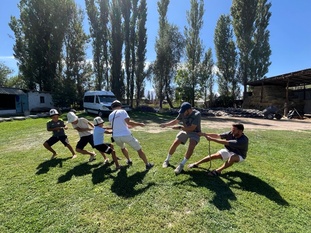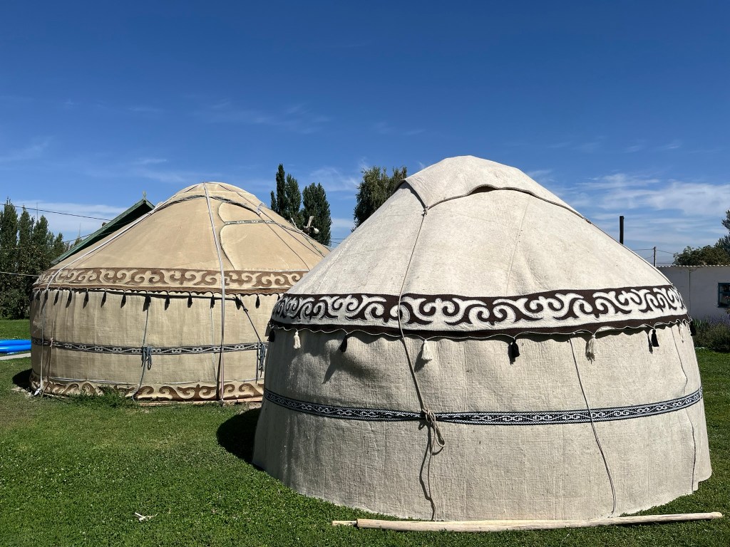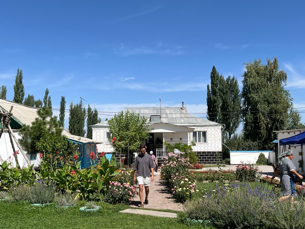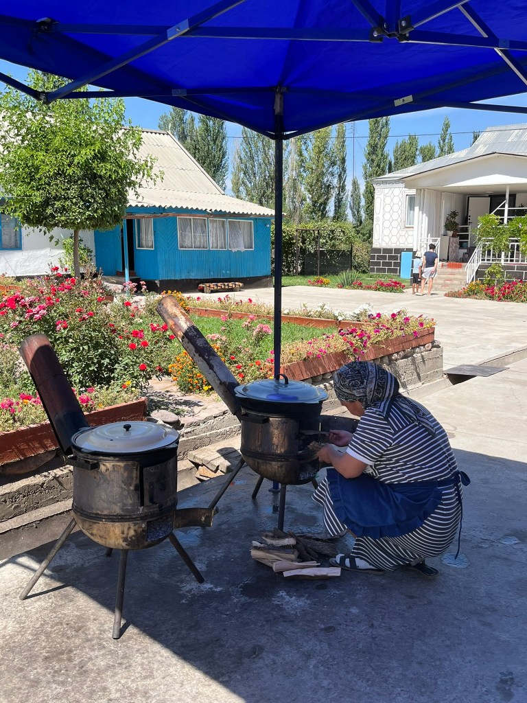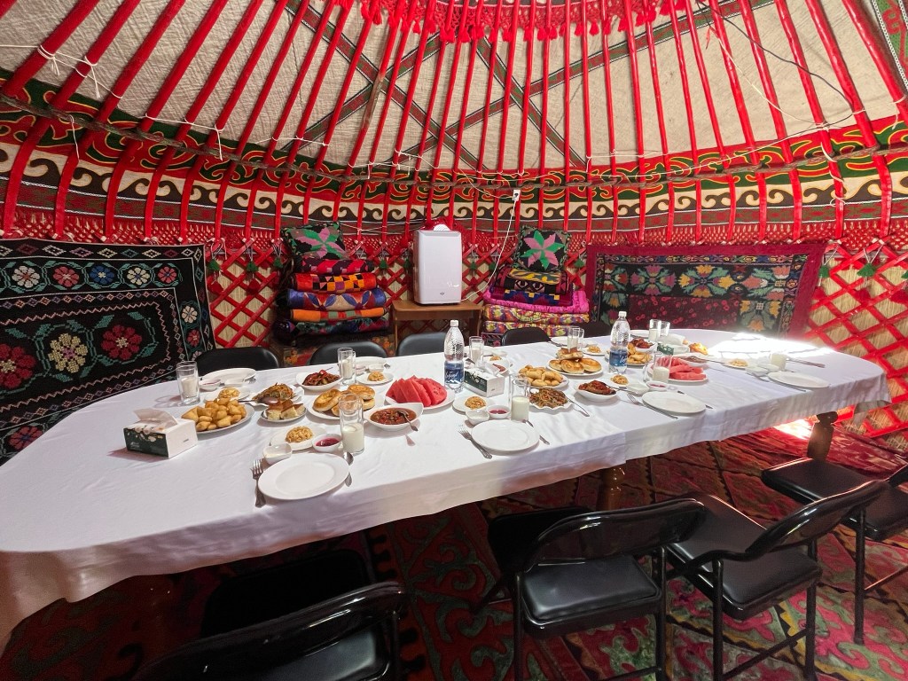 You only need about 30-45 minutes to visit the site but its a worthwhile stop. About 15 minutes drive from the tower we stopped for lunch at a local family’s home in the village of Don Aryk. They had a beautiful home with a big garden full of flowers and 2 yurts, one of which we had our lunch in. The family’s children wanted to play volleyball with us and the husband wanted to have a nail hitting competition into a big piece of wood. The women were all busy preparing our lunch in the kitchen.