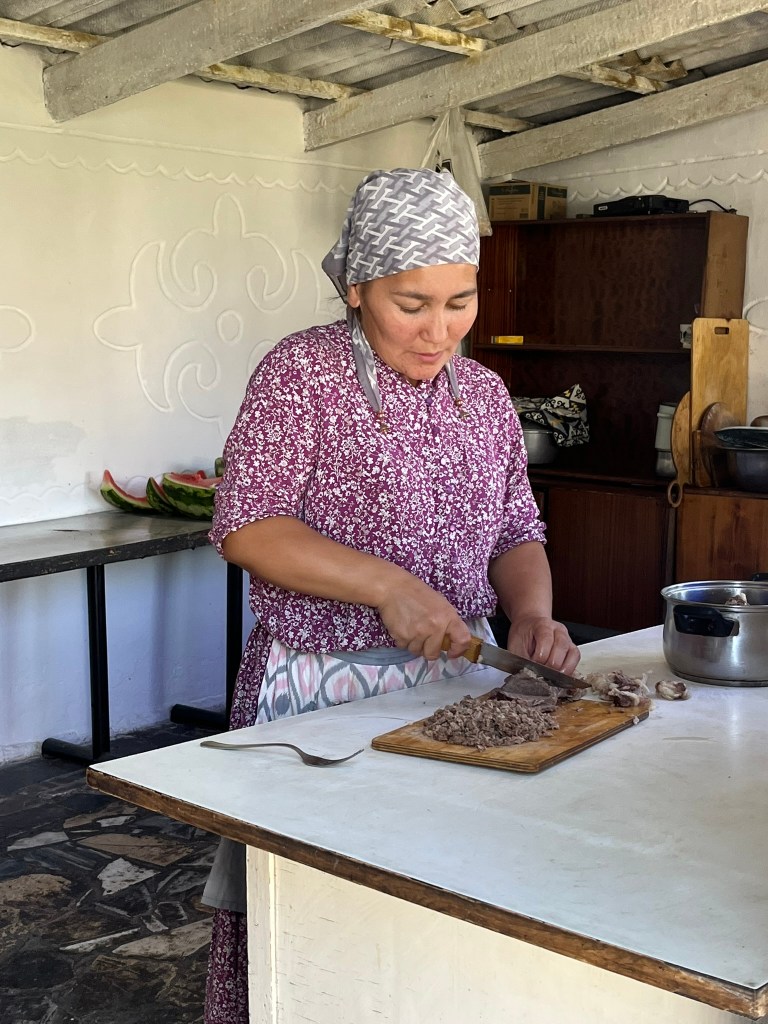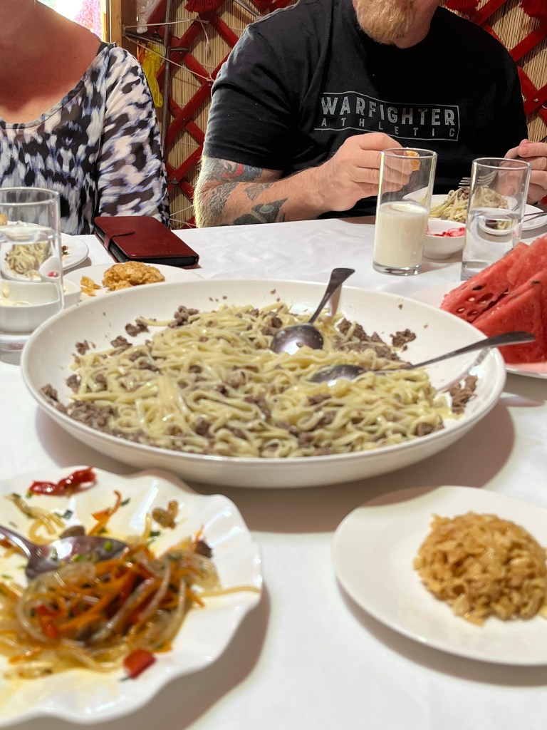 It was an amazing spread, with borsak (delicious pieces of fried bread with jam and cream), a variety of salads and the main event – beshbarmak. I had not had the chance to try this local dish until now – a combination of homemade noodles, stock and small pieces of meat, really delicious and filling. And great to try a traditional one made by a family rather than at a restaurant.