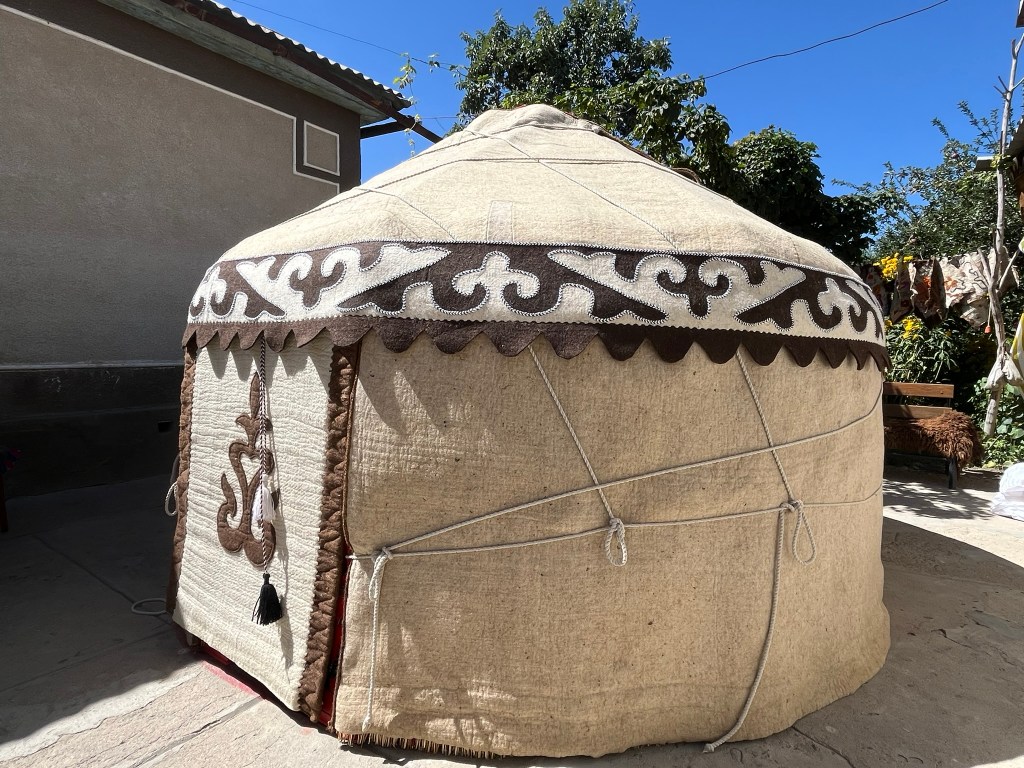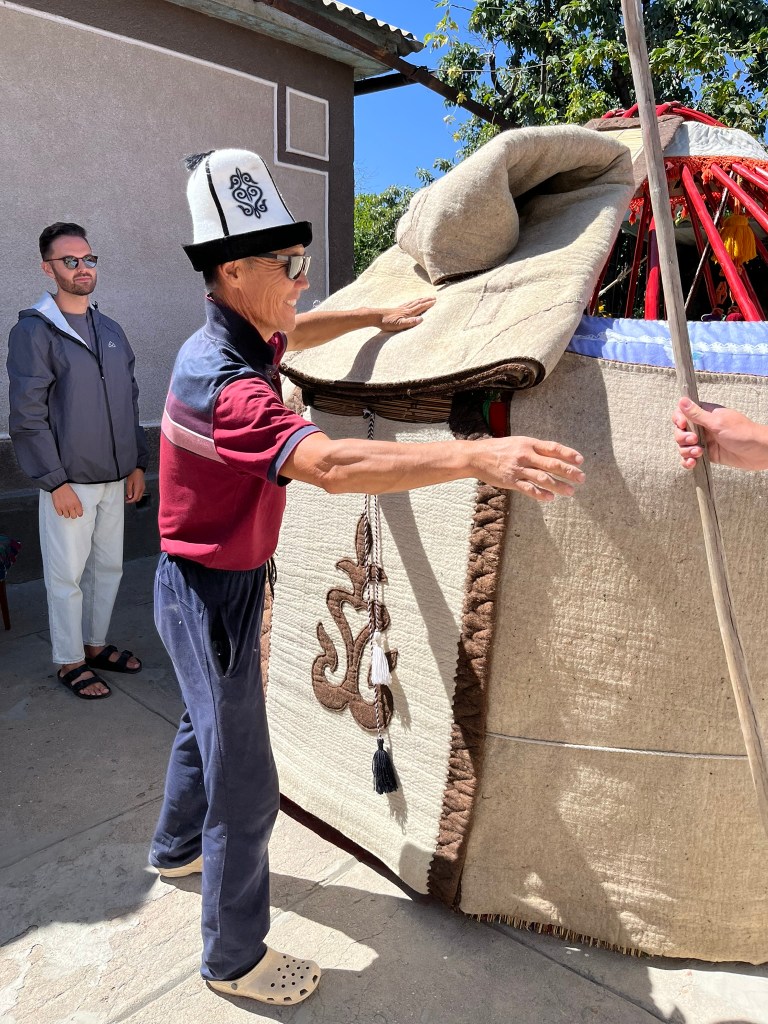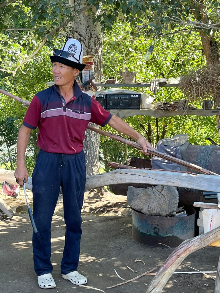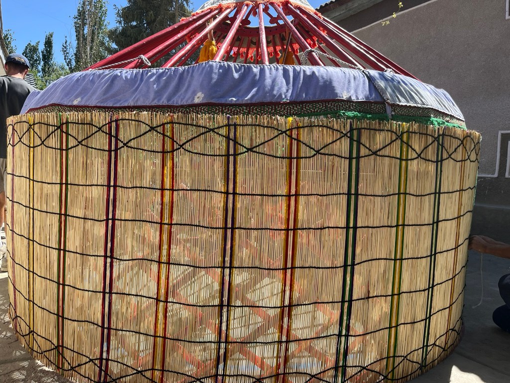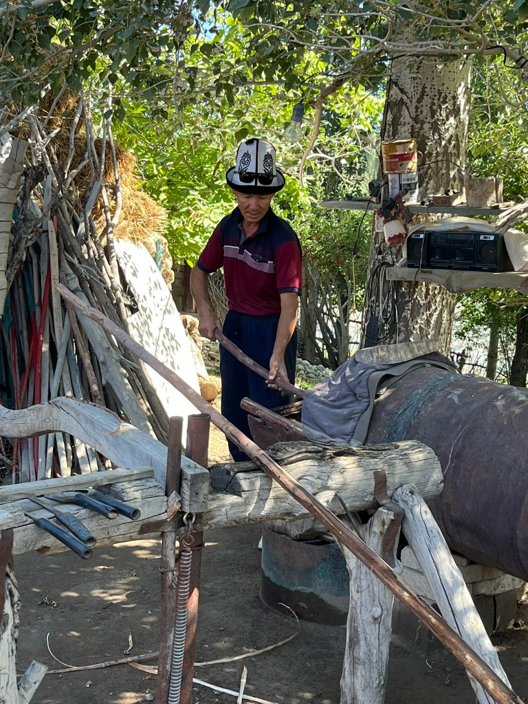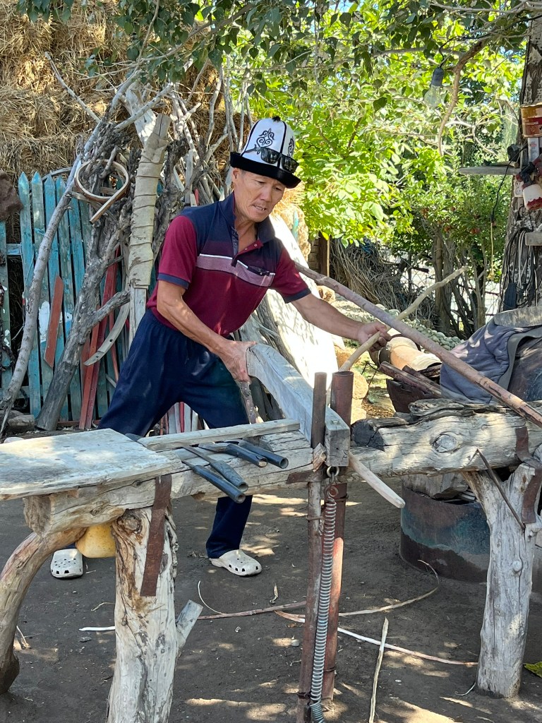 Our next stop was yurt making. We met our master yurt maker, Ruslan in his home in the village of Kyzl-Too. 80% of villagers here are involved in the yurt making industry and they take orders from all over the country. The village’s focus on yurt making is because during the Soviet Era there was a state-owned factory in the area that made yurts and when the USSR collapsed and all the factories closed down, the local workers started to make yurts themselves independently. Ruslan has been building yurts for 35 years.