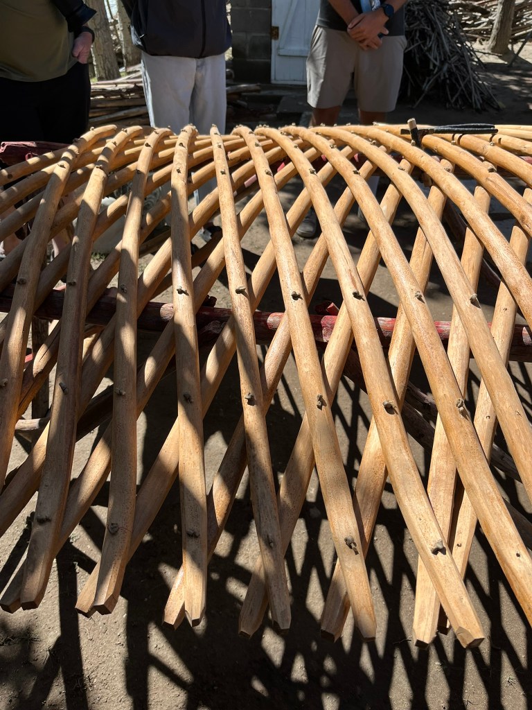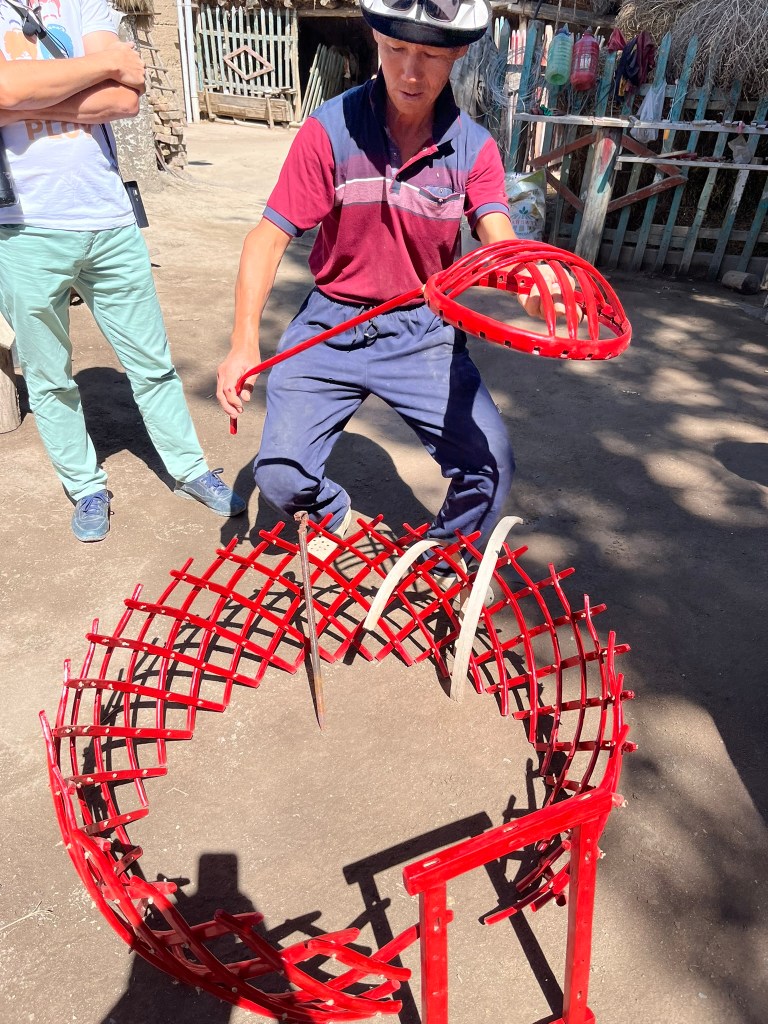 Ruslan has special tools that allow him strip the willow, get rid of any knobbly bits and if he wants to carve a pattern into the wood. To bend the wood into the exact shape each piece needs to be, he has a long series of barrels that he heats up and allows him to steam the wood. He then uses his tool to bend the wood to an exact angle. For the roof poles he needs long poles that are bent at a 60 degree angle at one end. For the wall lattice he needs a subtle bend on each piece. He then ties all the pieces together to create a lattice using cow skin as a super strong type of string.