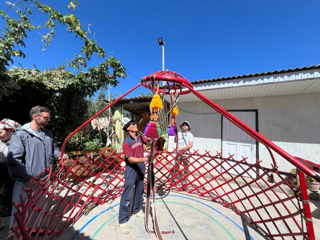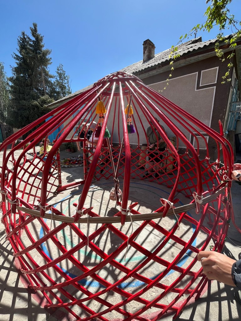 We then crossed the street to Ruslan’s house where he had a courtyard with a big circle painted onto the floor. This is where we were going to construct our yurt from scratch. A family of nomads could put up a medium-sized yurt at an every-day pace in under an hour. And at competitions a group could fully assemble one in 7-8 minutes.
