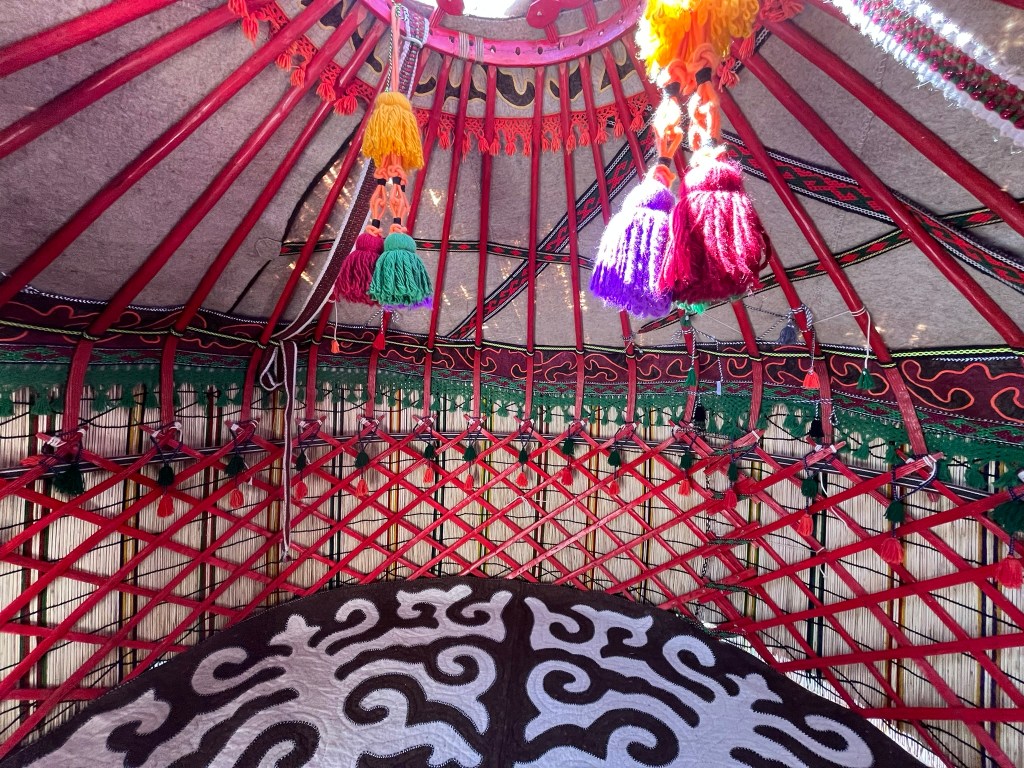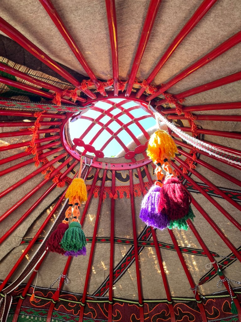 Next up we wrapped reed matting (the same as we saw how to make at the felt workshop) around the wall lattice. Then long panels of felt are wrapped around the wall and the roof. The felt provides warmth in winter and coolness in summer. All of this is tied down securely with more horsehair and woollen ties. Finally the door flap is secured, a small felt panel covers the sky window in the center of the tunduk and the inside and outside are decorated. The felt is water and wind-proof however nowadays an outer waterproof layer is sometimes added for extra protection.