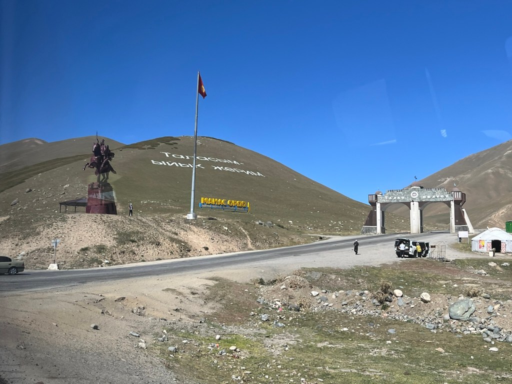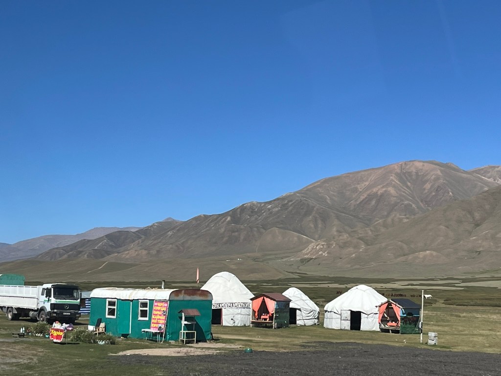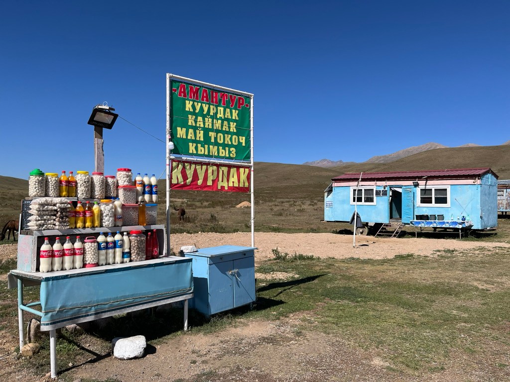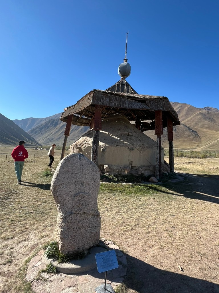 The road eventually opened out into the Suusamyr Valley, a wide high-altitude plateau. We made a couple of brief stops along the plateau. The obligatory service station stop for the toilets (which were given a minus 5* rating by the group) and to stock up on coffee and snacks. A lady selling a variety of dairy products baking in the sun, that I chose not to partake in tasting. And a small stone and mudbrick mausoleum for an individual called Baytik Baatyr. This mausoleum is not famous for the person who is buried there, but rather that he was friends with a legendary Kyrgyz strongman from the region called Kozhomkul. Reportedly he stood over 2.3 meters tall and legend says that he was able to carry a horse up a mountain with his bare hands. The 600kg stone that sits in from of Baytik Baatyr’s mausoleum was supposedly carried there by Kozhomkul to commemorate his friend. He is a folk hero for people in Kyrgyzstan.