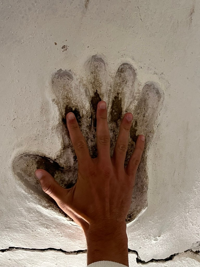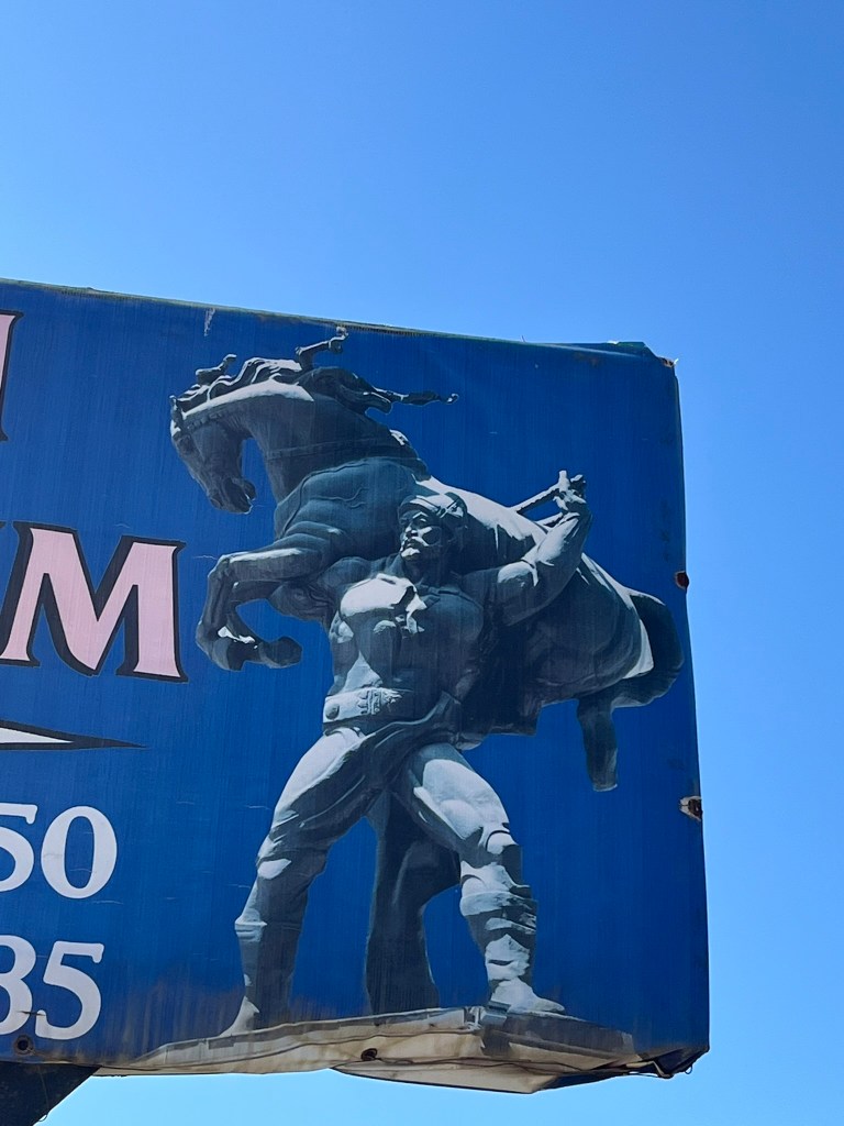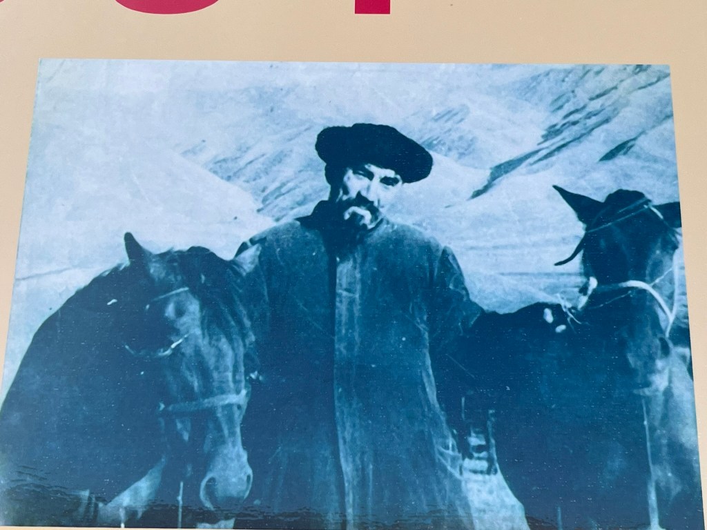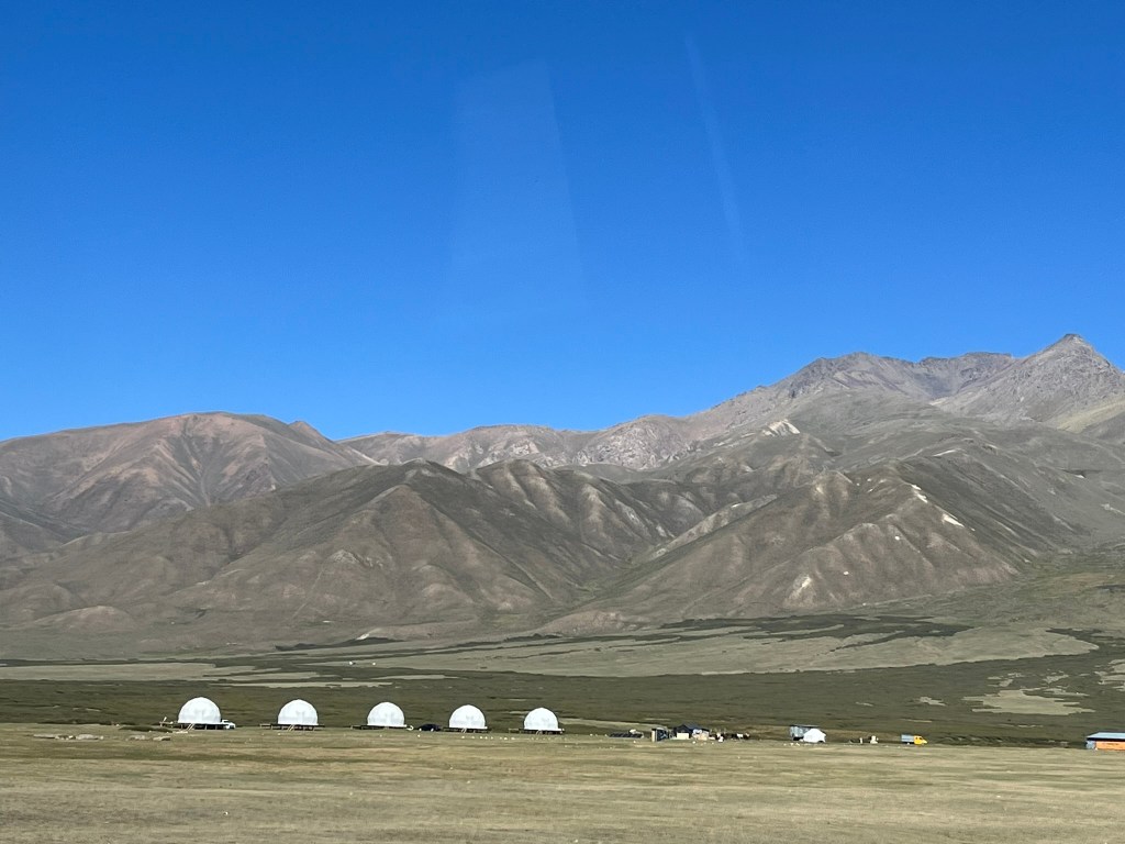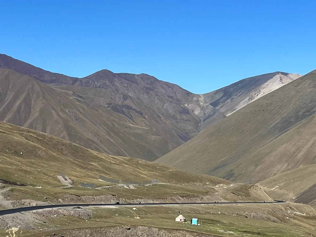 The road eventually opened out into the Suusamyr Valley, a wide high-altitude plateau. We made a couple of brief stops along the plateau. The obligatory service station stop for the toilets (which were given a minus 5* rating by the group) and to stock up on coffee and snacks. A lady selling a variety of dairy products baking in the sun, that I chose not to partake in tasting. And a small stone and mudbrick mausoleum for an individual called Baytik Baatyr. This mausoleum is not famous for the person who is buried there, but rather that he was friends with a legendary Kyrgyz strongman from the region called Kozhomkul. Reportedly he stood over 2.3 meters tall and legend says that he was able to carry a horse up a mountain with his bare hands. The 600kg stone that sits in from of Baytik Baatyr’s mausoleum was supposedly carried there by Kozhomkul to commemorate his friend. He is a folk hero for people in Kyrgyzstan.