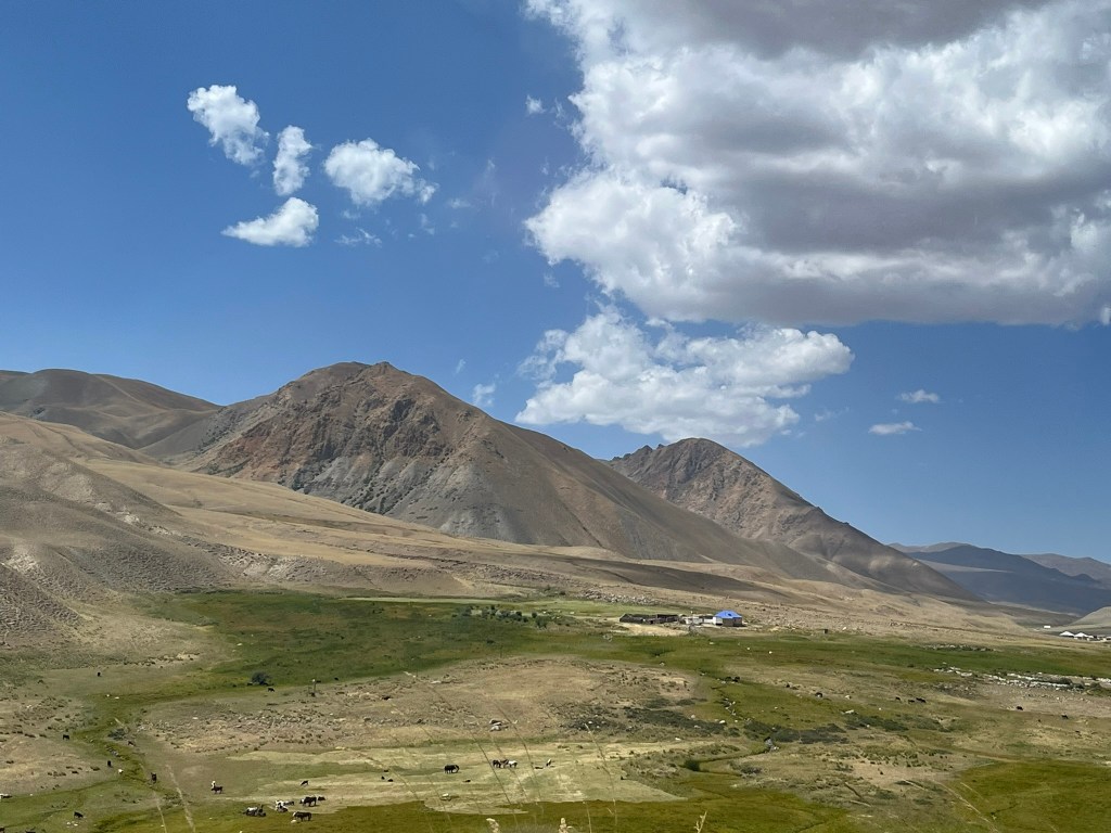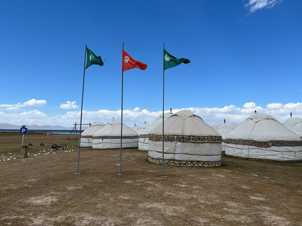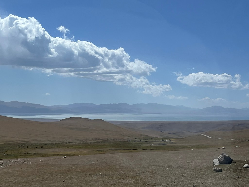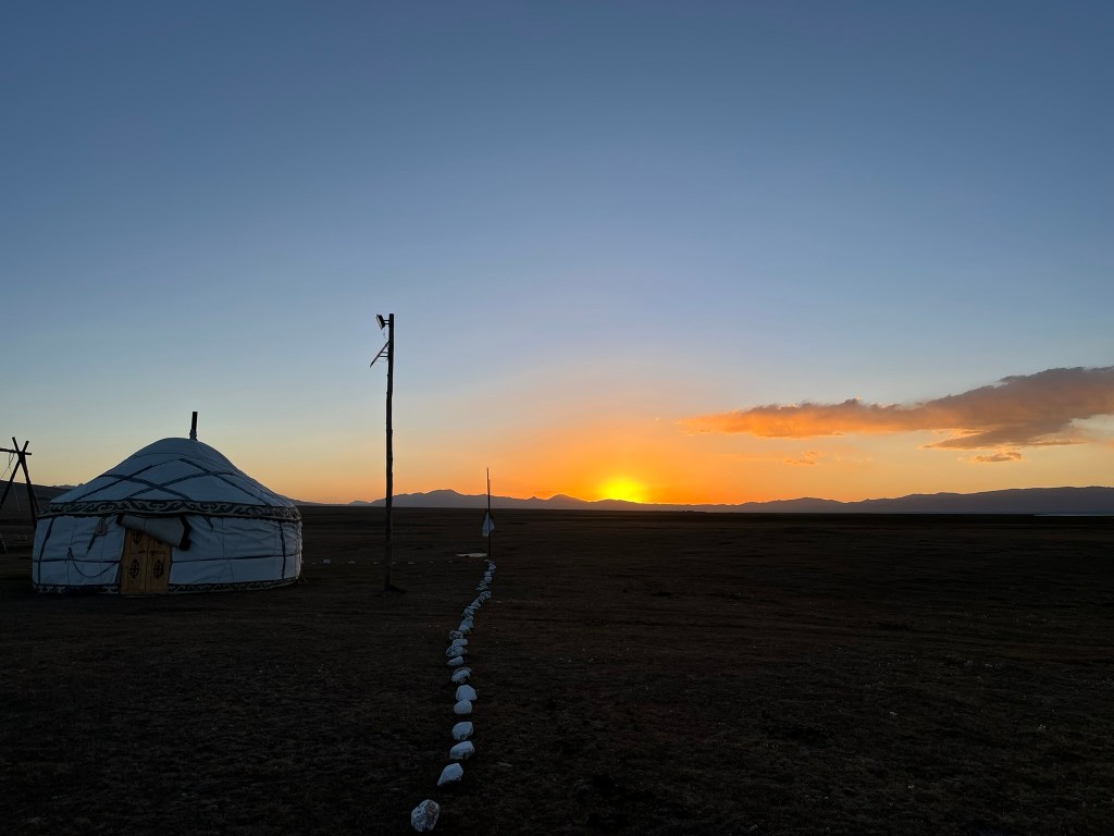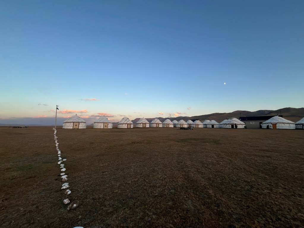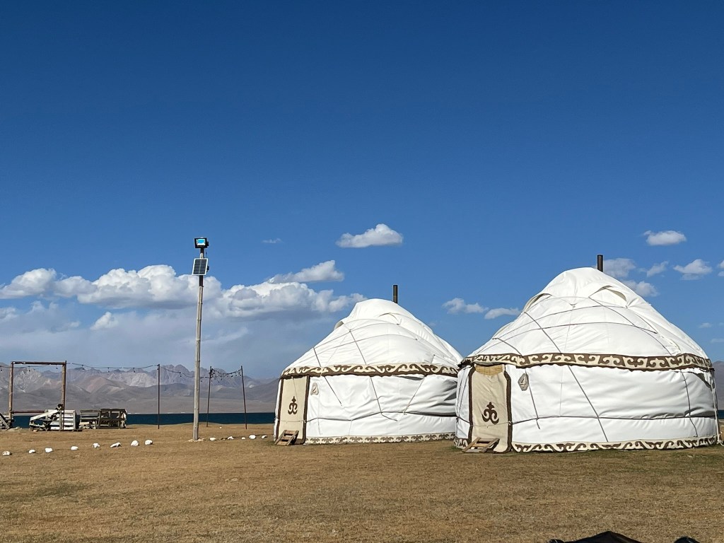 Our yurt camp sat right on the edge of the lake with almost nothing except scenic views in every direction. We arrived near the end of tourist season and had the camp to ourself. The owners said in the next few weeks they would be packing up the yurts and shutting up shop for the year. This camp was much more isolated than the one we stayed in at Issyk Kul lake. Other than a few other yurt camps by the lake shore, there are just grazing animals and a few shepherd yurts dotted around in the distance. My eSIM had no coverage and WIFI access was via a starlink satellite connection and not included. We had power via solar panels and this was only until 11pm and no hot water for the showers. That said the toilet facilities were still first class. The elevation meant it got much, much colder at night and we had to have a wood burning stove set up in the yurt for overnight. Considering we were in the middle of nowhere, it was pretty nice.