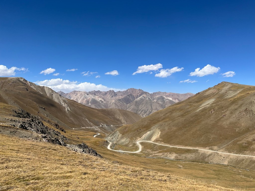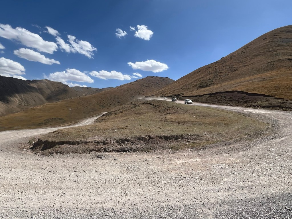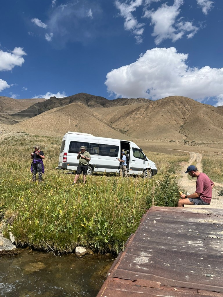 The drive to Son Kul lake is incredible and easily a highlight of the trip. The landscape is ever changing and the views looking back at the road we had slowly made our way up were brilliant. We had lunch by a stream just off the main road and our guide encouraged us to each have a shot of cold vodka to thin our blood and prepare us for the higher altitudes we were approaching. We stopped at another view point which was so windy that it was difficult to stand up and impossible to breathe when facing into the wind. A bit earlier we had seen 2 cyclists slowly making their way up the mountain pass and I’m really not sure how they were going to cycle through that strong wind.