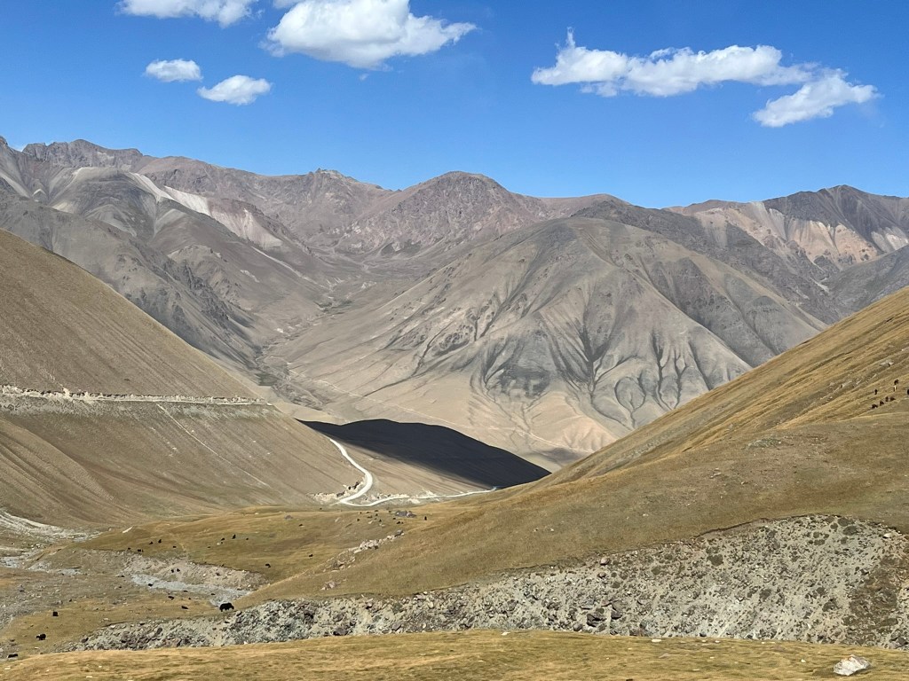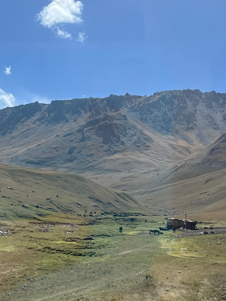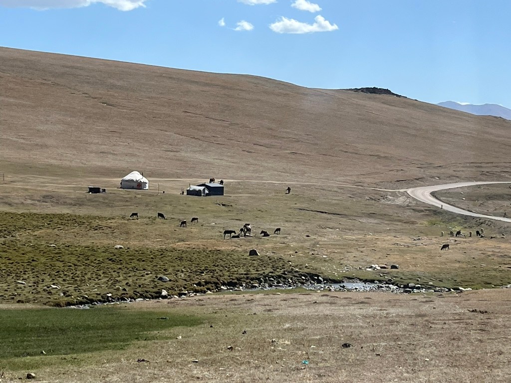 All along the route we saw grazing herds of cows, horses, yaks, sheep and goats. Sometimes you could spot the shepherds on their horses, following their herds but most of the time it seemed like the animals were alone. And there would be a yurt, here and there, to provide the shepherds shelter whilst they stayed up in the mountains searching for green pastures in the summer.