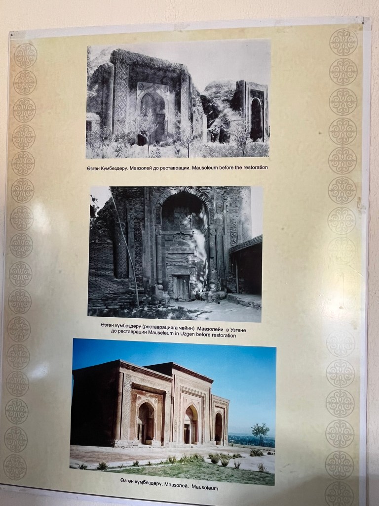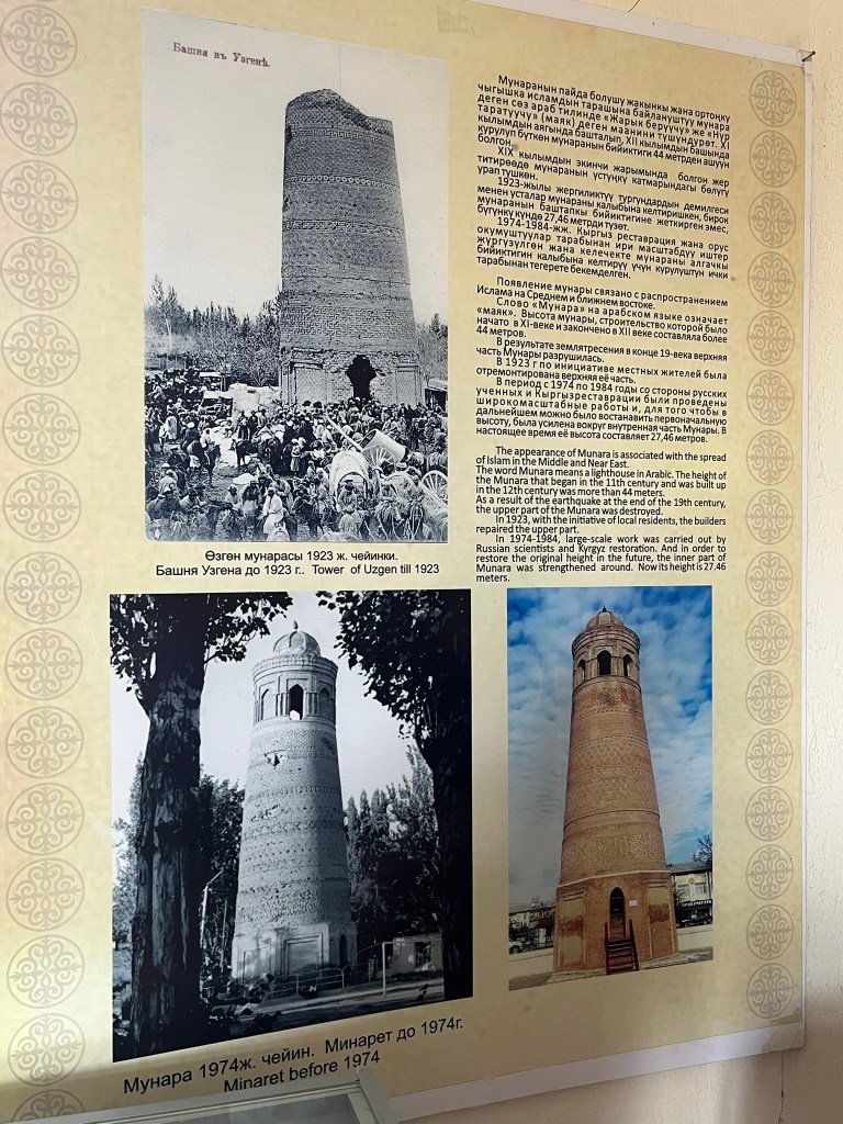 45 minutes at the minaret and mausoleum is plenty of time, There is a small museum that contains objects they have found in the town during construction works including some gigantic clay pots that would have been used to hold grain. And some good pictures of Uzgen during the turn of the 20th century. You can also climb up the minaret, although its good to note that similar to Burana Tower, it is no longer its original 45m height due to frequent earthquakes in the area.