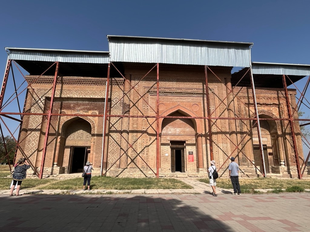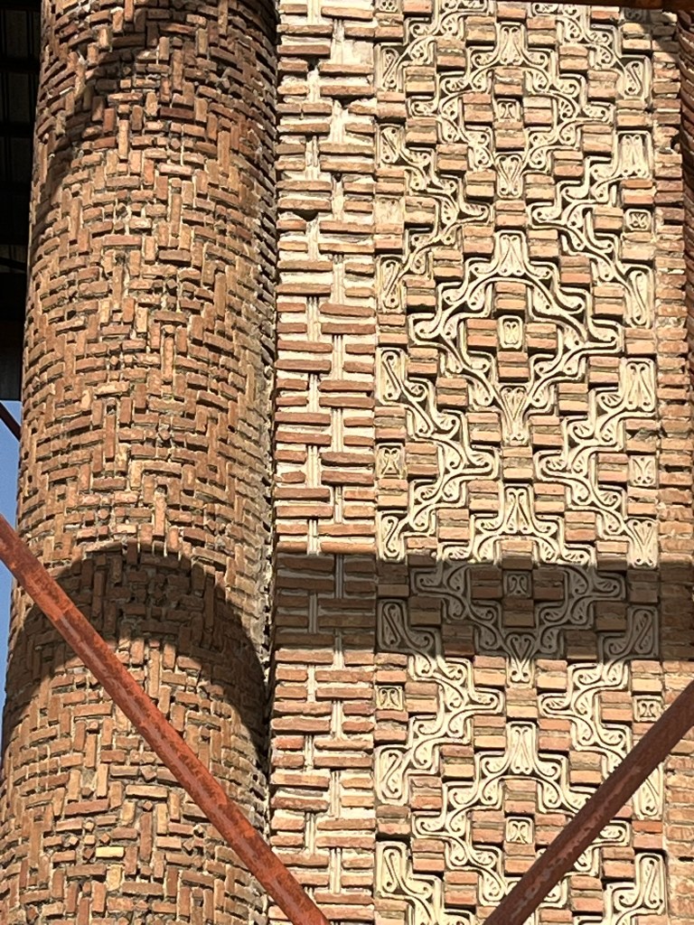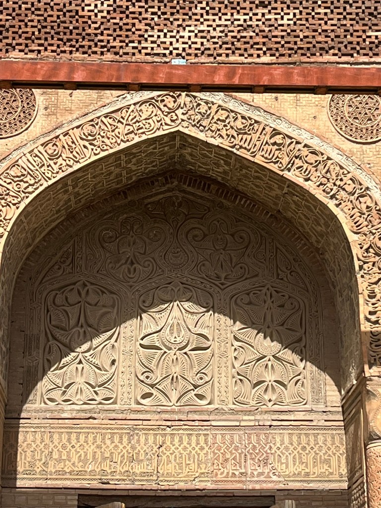 These Karakhanid remains are built of fired brick, which serve as both the structure and the ornaments themselves, using intricate brick patterns. The tradition of adding colourful tiles was not seen until much later in history. The mausoleums are interesting because of the range of patterns used for decoration. We saw geometric designs with zig zags, chevrons and star shapes, calligraphy with inscriptions and verses of the Quran carved into the brick work, and floral motifs. The variety of designs gives a good indication on how culturally mixed Uzgen must have been back then and how different religions, ideas and cultures must have arrived through the silk road. In just one mausoleum you can see the fusion of Persian influence, local Central Asian motifs and Turkic nomadic styles.