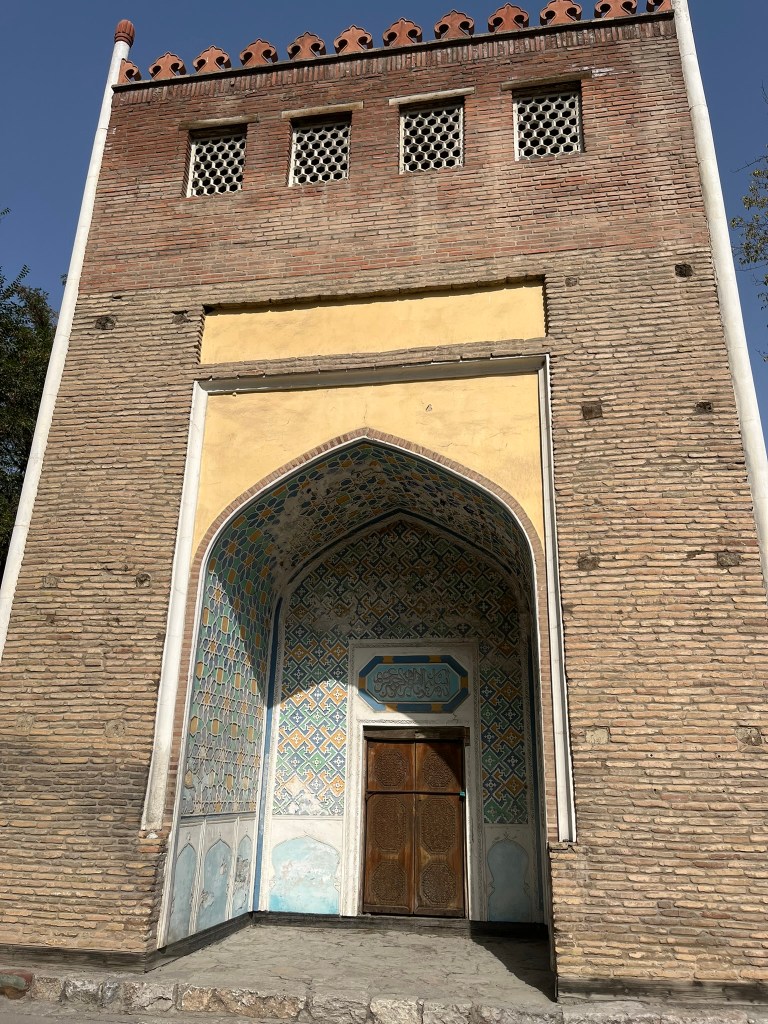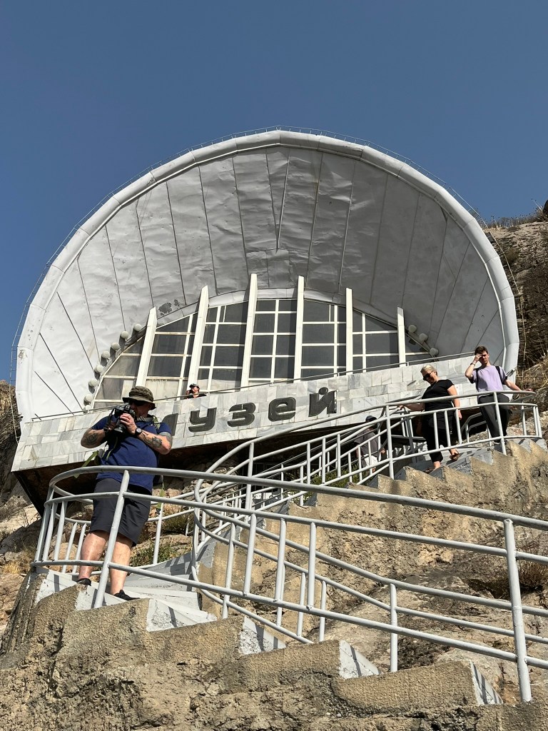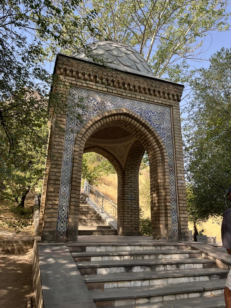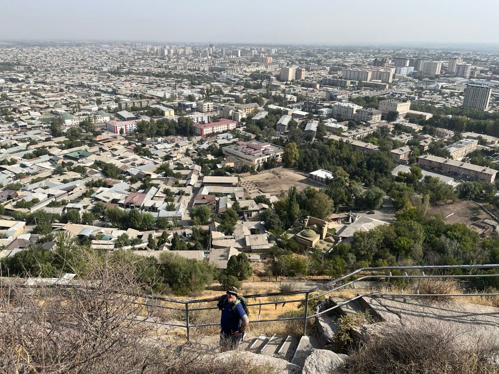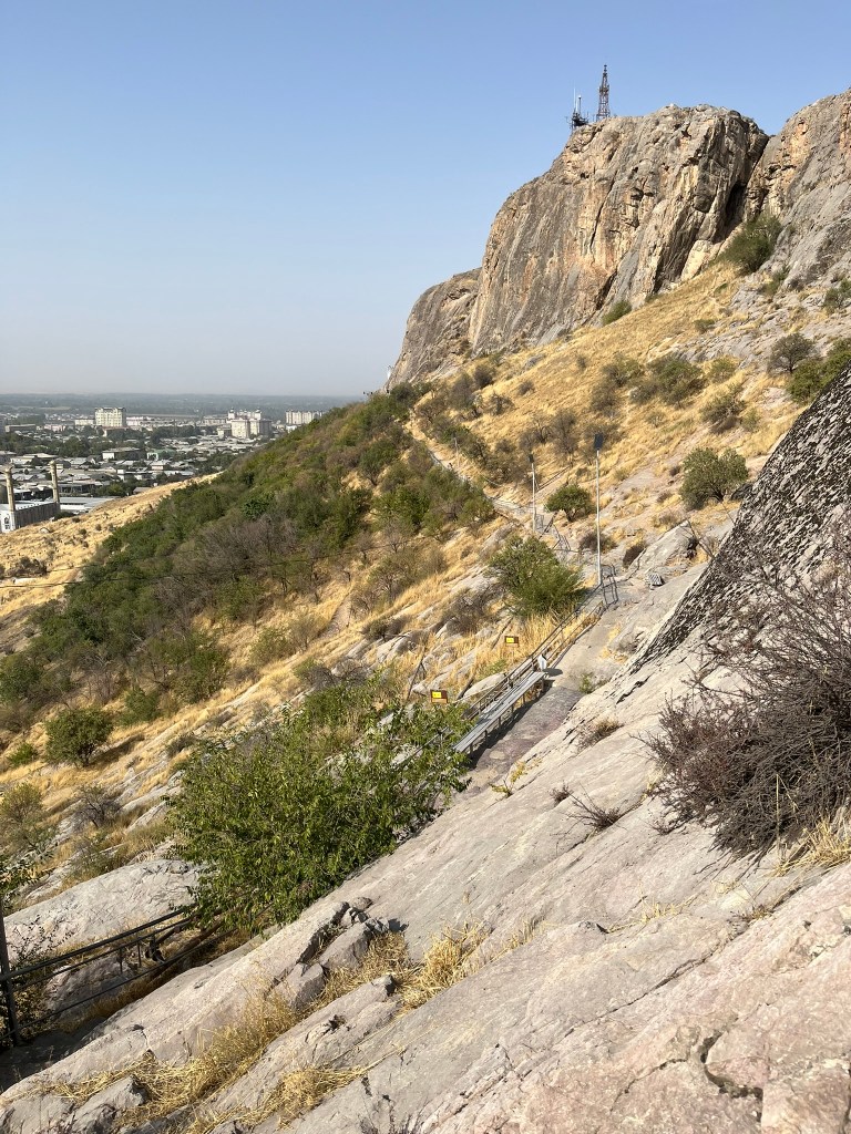 A visit to the mountain takes about 1 hour 45 minutes. You’ll start with a walk up to the museum, which is actually built into a cave. There is limited information here, but you get a nice view down onto the city of Osh. You’ll then take a walk that winds around the mountain giving you views of some of the sacred caves and polished stones until you reach a second much higher viewing platform on which a 16th century mosque sits. The walk involves a fair number of steps and is exposed to the sun so be prepared with a hat and water. You should also be able to see the rocky outcrop that is believed to be ‘Solomon’s Throne’ but I’m not sure where that was! From the top you descend via a much steeper set of steps on the other side of the mountain back to the road.
