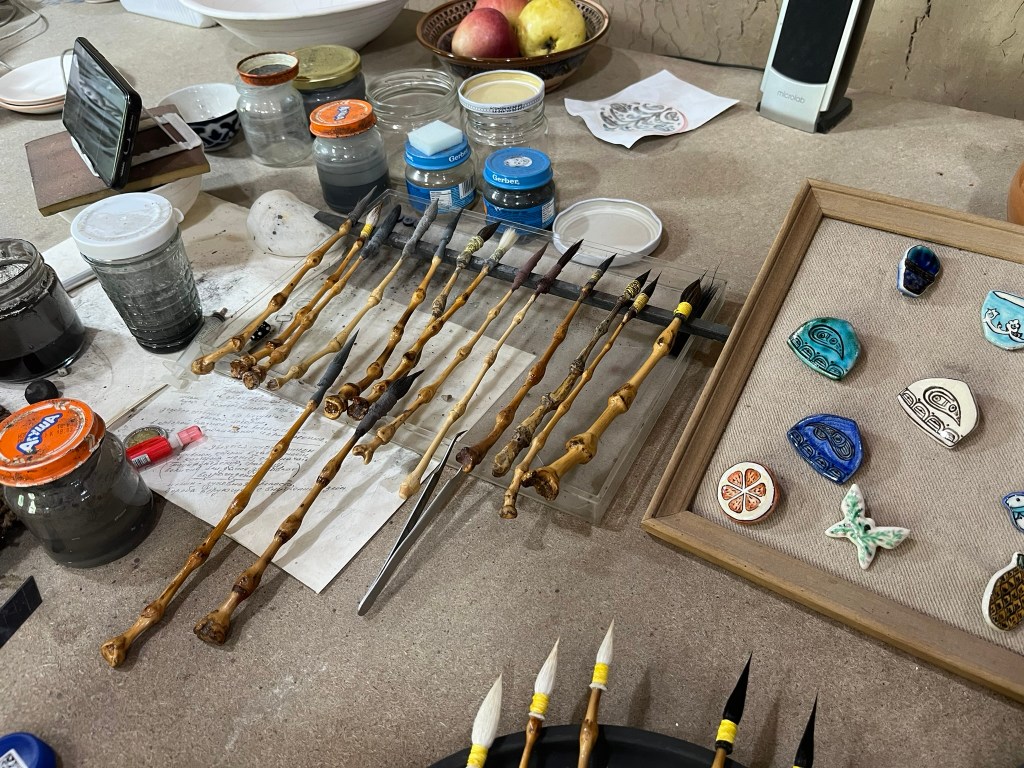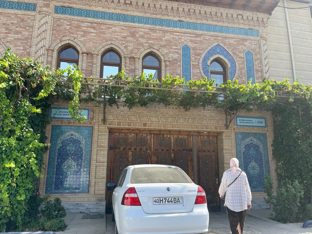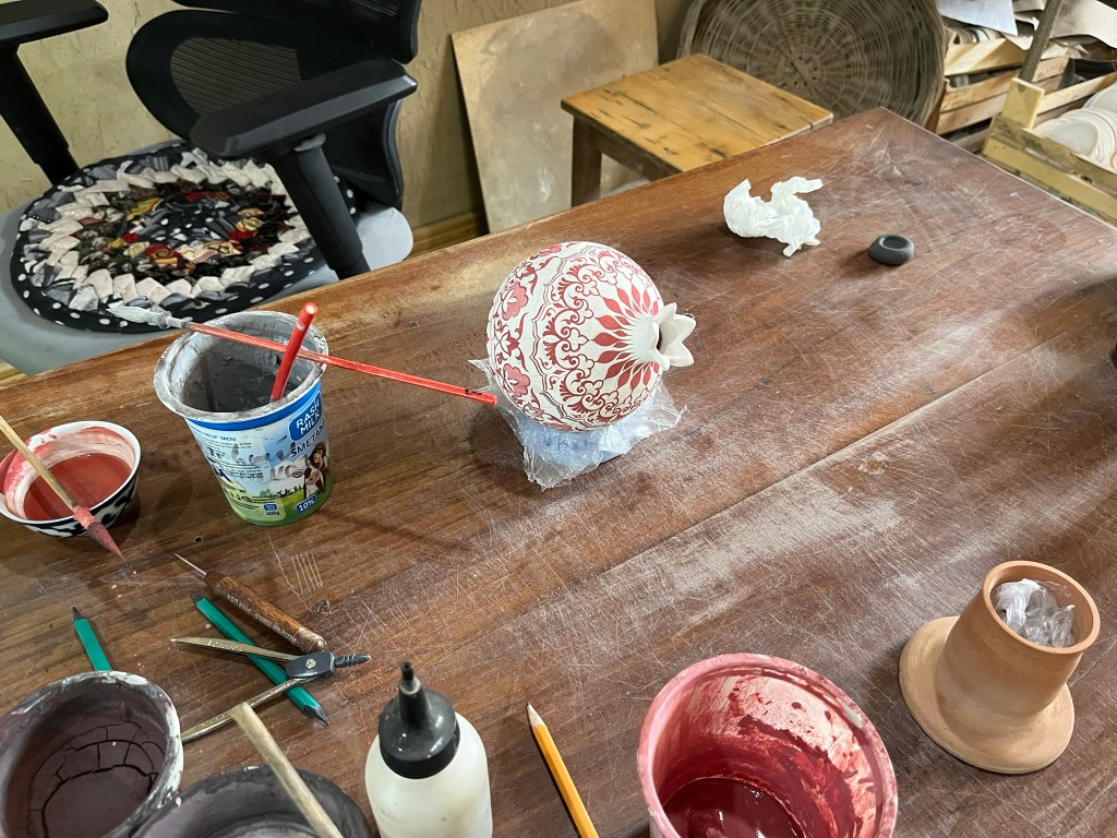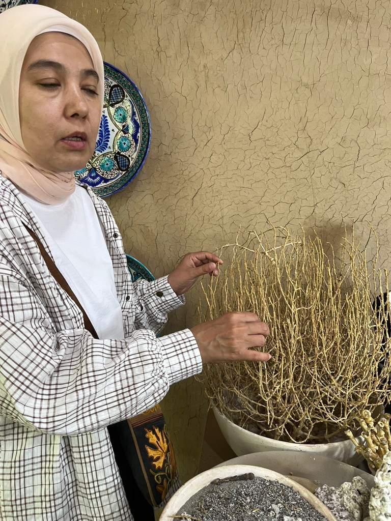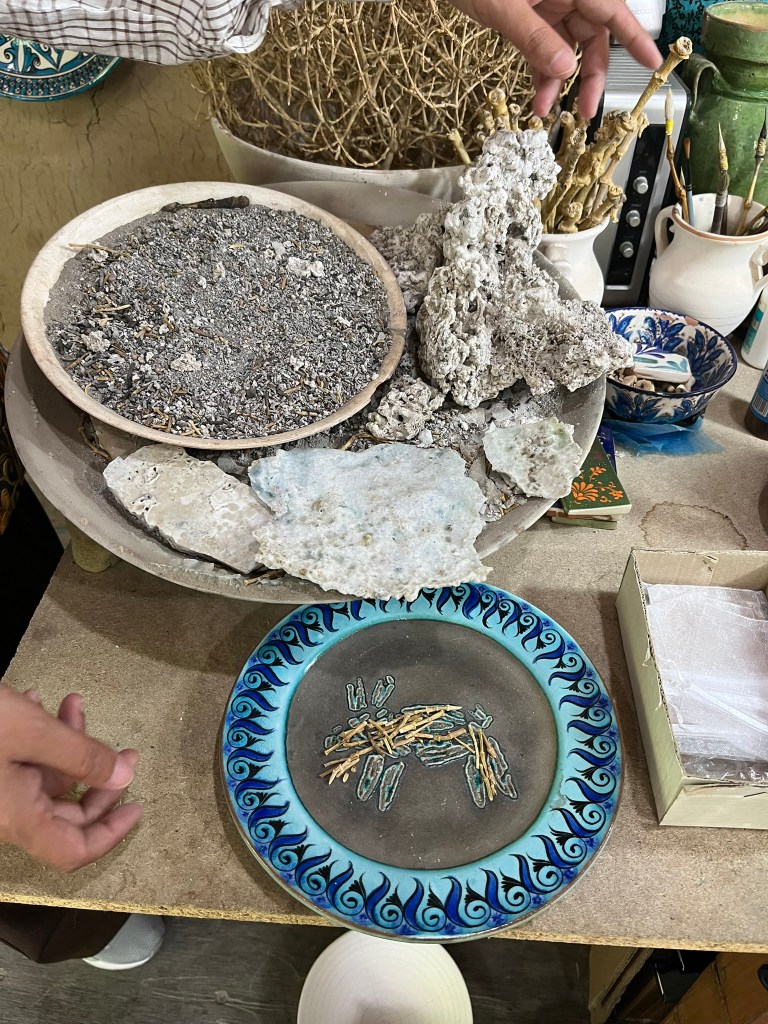 I was lucky enough to visit the workshop of Rustam Usmanov, a master ceramicist and often called ‘the guardian of the ishkor tradition’ in Uzbekistan. Through the unassuming doors on an unassuming street we entered a world of pottery, with a long courtyard filled with kilns, pottery wheels, drying racks and displays of finished works. This is not a factory, but a family home full of artisans at work. As we were taken around the space, we not only met masters at work but many of their family members busy cooking or looking after children.