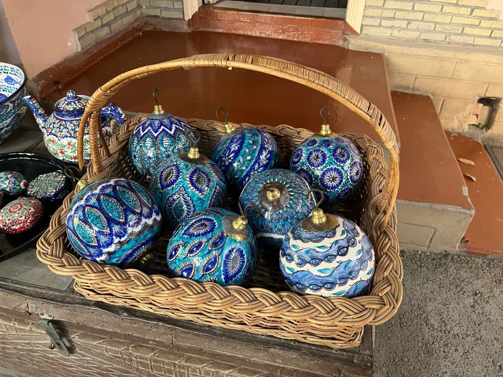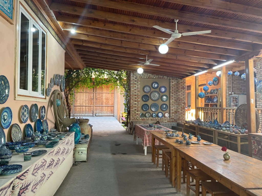 We then came downstairs to explore the courtyard and all the beautiful pieces they had available to purchase. Once I had chosen which pieces would be coming home with me, I enquired about who they typically sell to. I assumed they would say that the pieces went off to areas like Samarkand and Bukhara to sell in tourist shops. But to my surprise they said what is produced in this workshop goes off to museums and private collections all over the world. And they they produce complete sets for Embassies (I assume they meant Uzbek embassies in other parts of the world) and they had a big client in France who orders thousands of pieces every year. I feel quite lucky to own such a special piece of pottery!