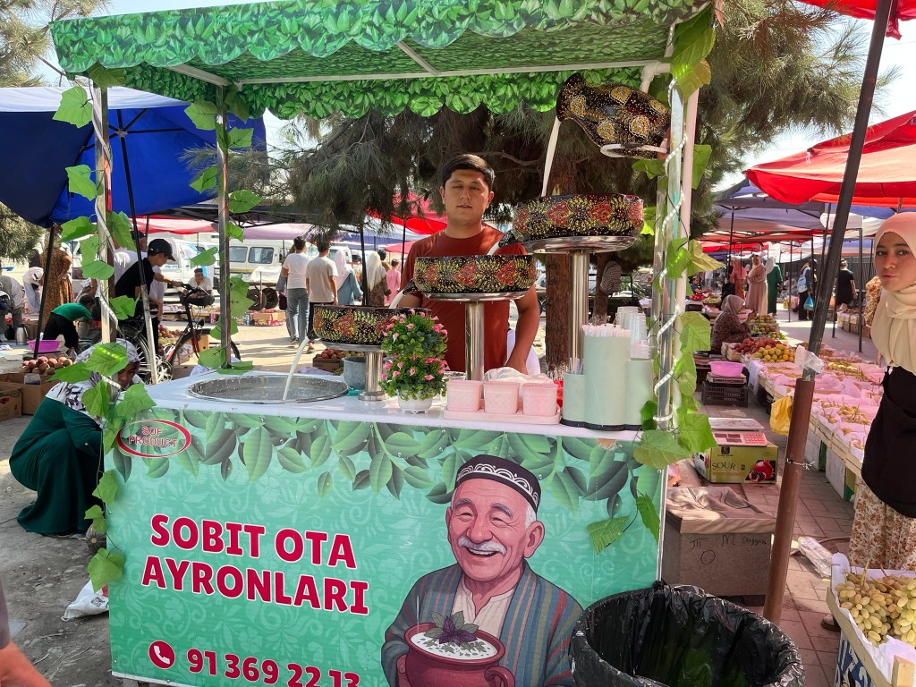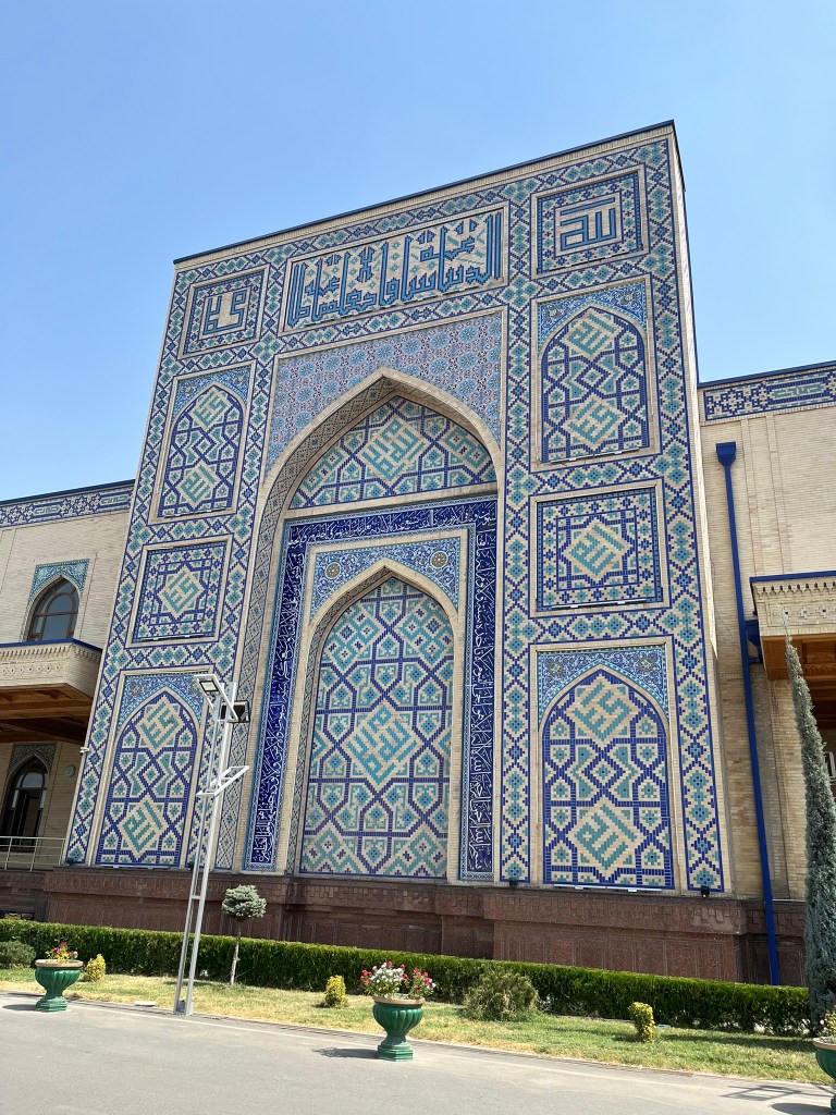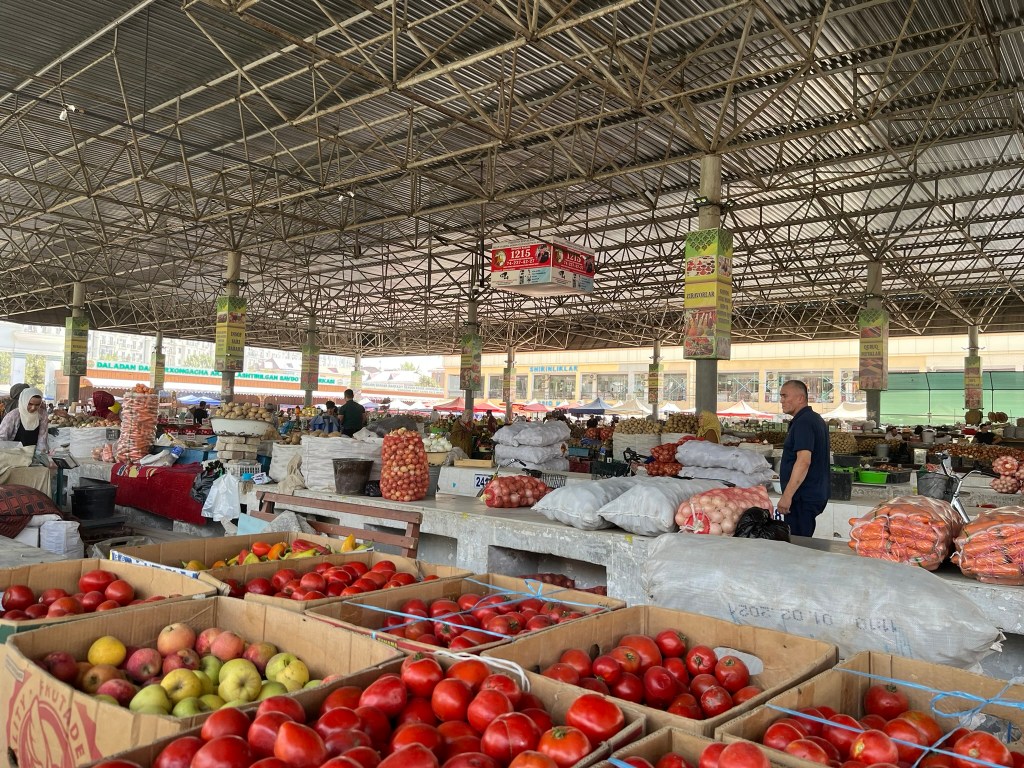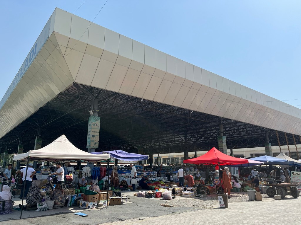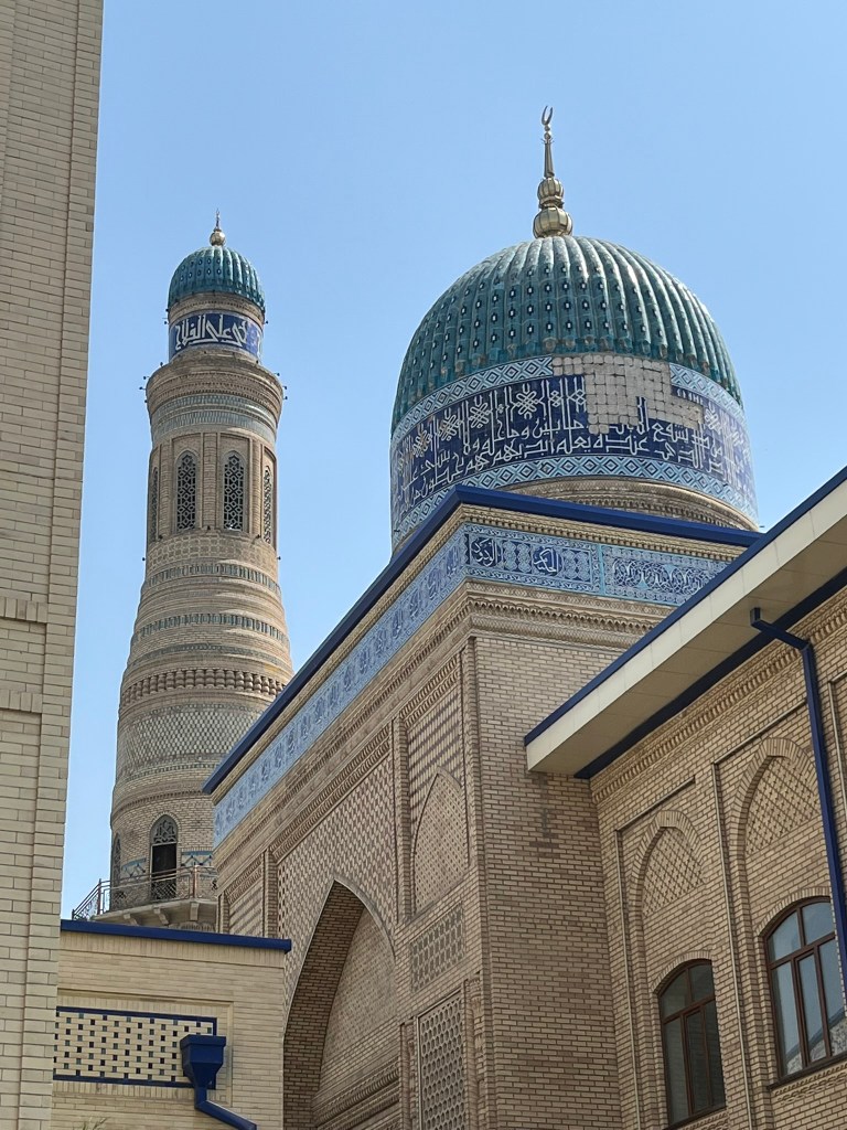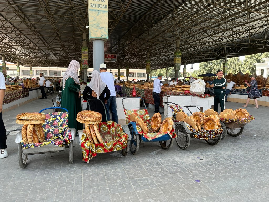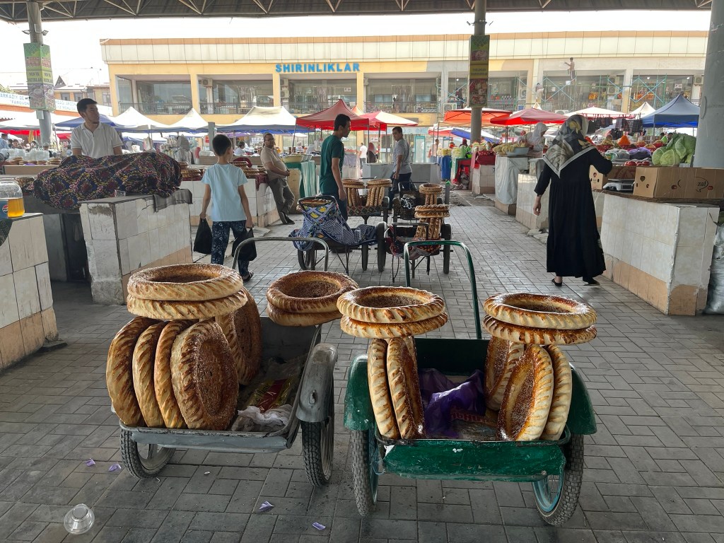 Before we got on the train we had a little explore of Andijan. This is one of the oldest cities in the Fergana Valley and the administrative capital of the region. It was another important stop on the silk road and today sits very close to the border with Kyrgyzstan. It has a population of 400,000 people and its main industries are automobile assembly (GM has a big factory here producing Chevrolet cars for the region), textiles and cotton processing. We visited the city bazaar which was bustling with people and had some of the biggest rounds of bread that I have ever seen! And the newly built Devonaboy Mosque covered in elegant blue tiles that sits opposite the bazaar.
