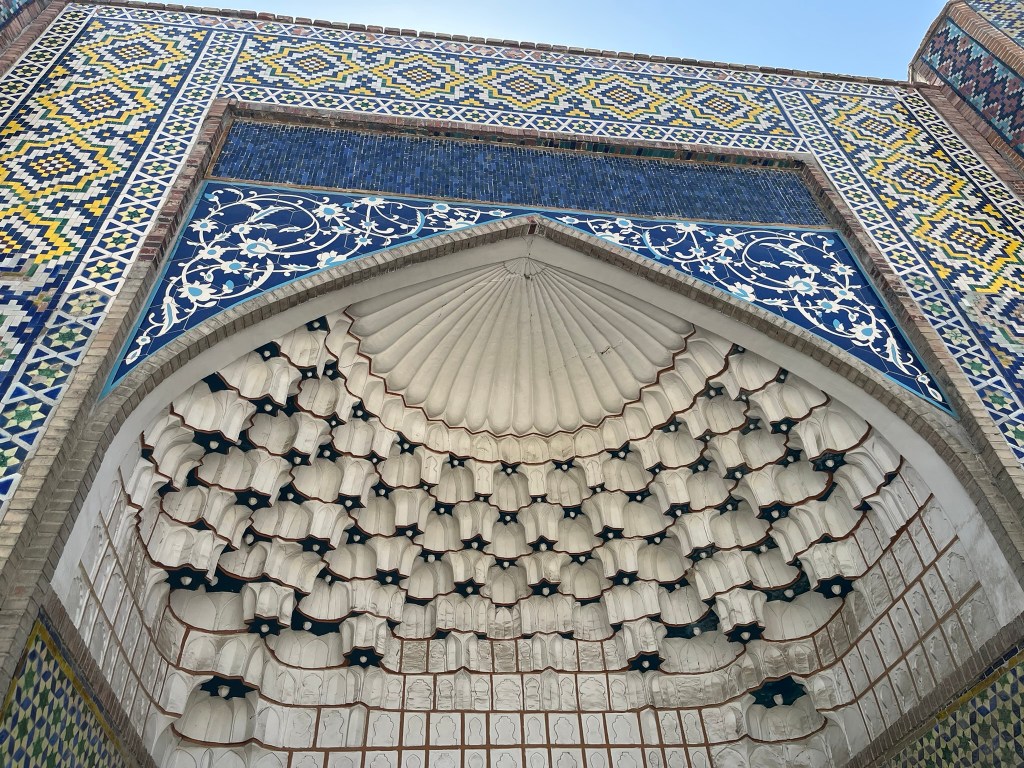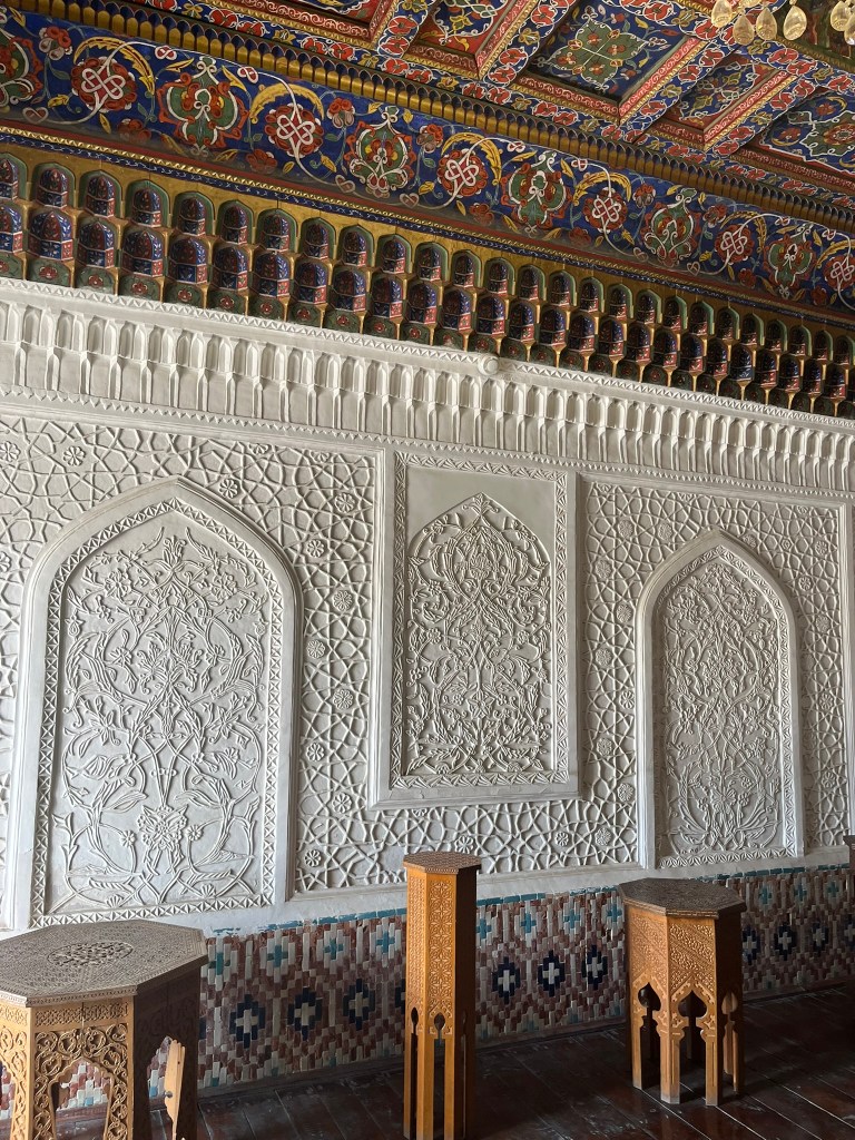 The final major sight to see is Khudayar Khan’s palace, built in the 1860’s and once one of the largest royal residences in Central Asia. Of the original 7 courtyards and 113 rooms, only 20 survive. The main entrance has spectacular tile work with each part having different designs and usage of color. I really liked how eclectic it was. And inside each of the rooms there is incredible stucco work on the walls, paintings on the ceiling and intricately carved wood work. I was actually quite surprised at just how good it was, as this city gets far far fewer visitors than those on the classic Uzbekistan loop.