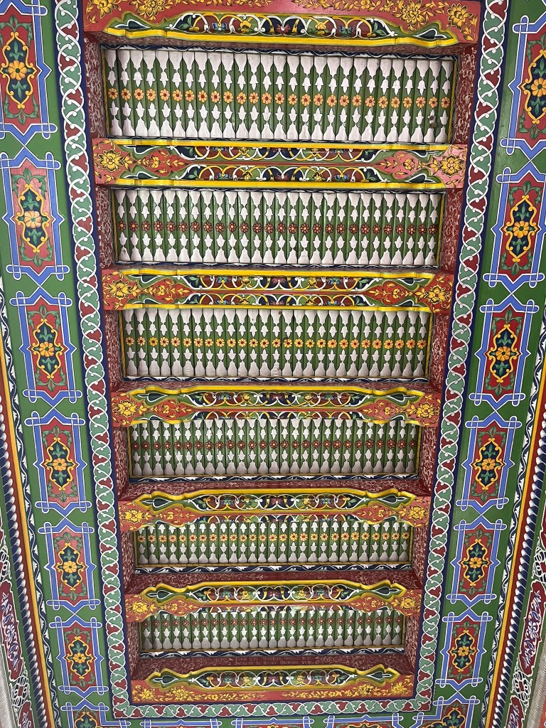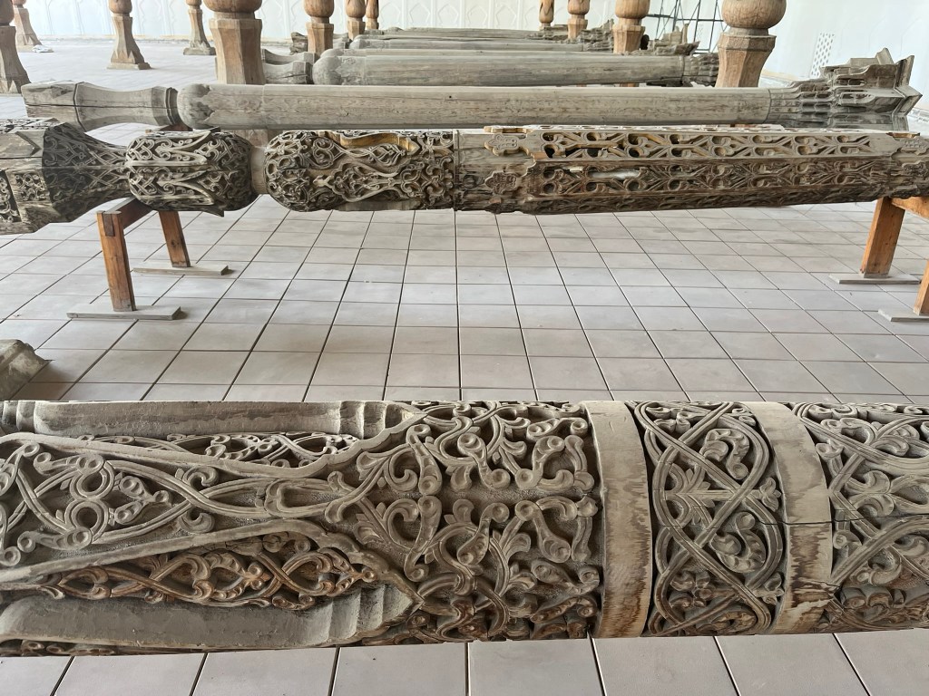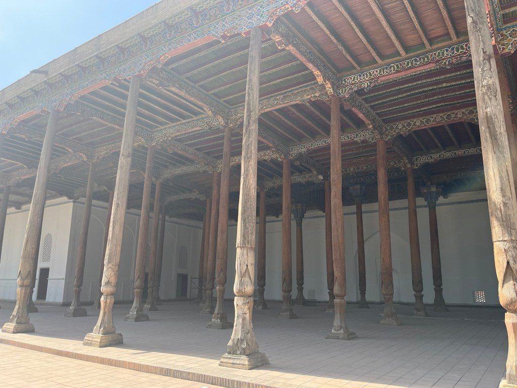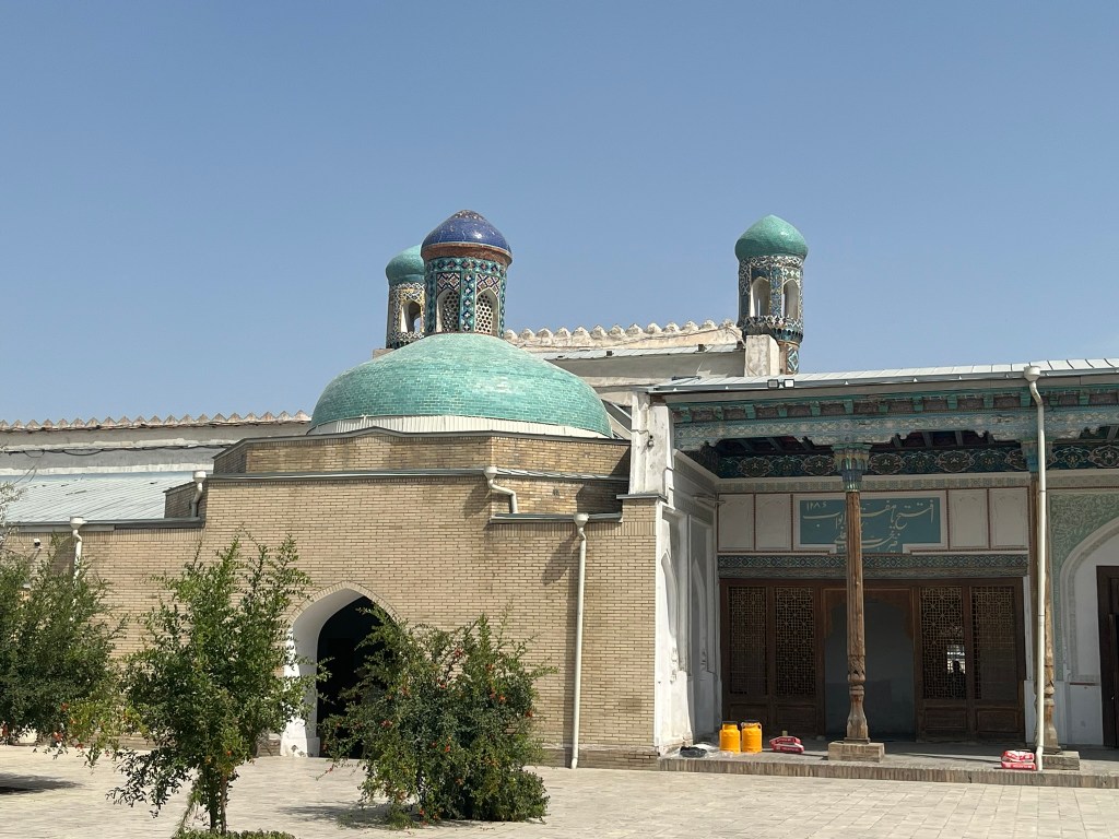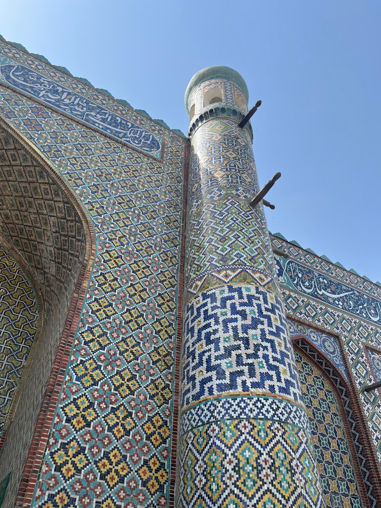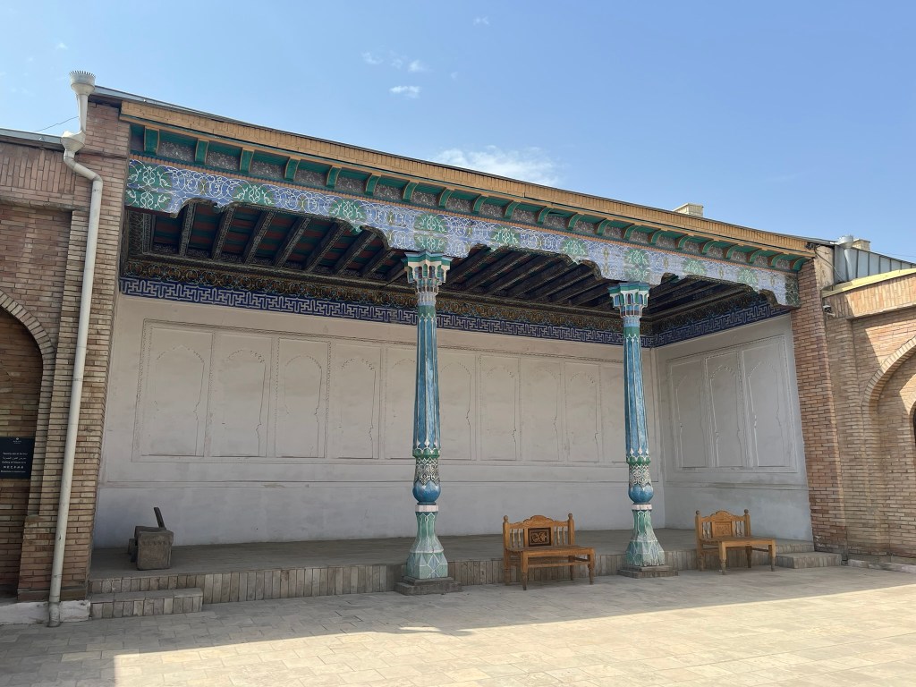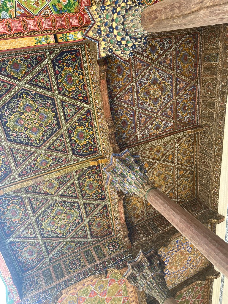 The Jami Mosque was built in the early 19th century and has a vast open courtyard with a minaret at its center. It was built by Umar Khan who wanted to make Kokond a spiritual capital in the Fergana Valley. The most striking feature of the mosque is the intricately carved wooden columns and the brightly painted ceiling. Again, the greens, yellows and reds dominate the color palette, typical of Fergana Valley and different from the blue-dominated Timurid style you see in Samarkand and Bukhara.