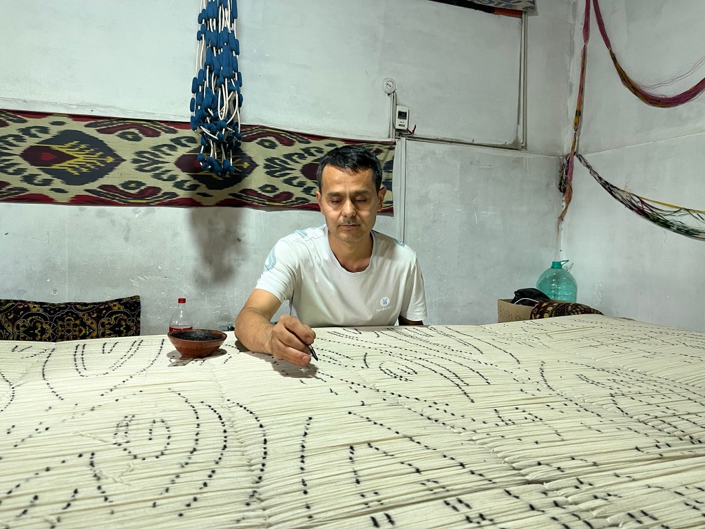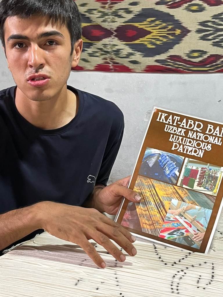 And this was the reason I had come to Margilan today – to see a silk factory that still creates textiles using traditional methods and be taken through the process step by step. And of course there was a great shop at the end stuffed full of lovely fabrics for me to take home. The silk factory (well, more like where they take tourists around) was about 15 minutes drive from Margilan train station and I was met enthusiastically by my guide Abdul-Assiz who would show me the 4 major steps to making silk fabric. The place I was visiting was a family-run business with everyone specialising in different stages in the silk-making processing, with a master weaver running the show and teaching apprentices. Abdul-Assiz was a master binder – an expert at wrapping the warp with cotton (they have modernised and now use sticky tape) to resist against the dye. Their business extends to many women working at home on their own looms who then bring their work to the main factory. And their main business comes from orders from outside Uzbekistan. They particularly work with French businesses who send over their designs to be made here in the Fergana Valley.
