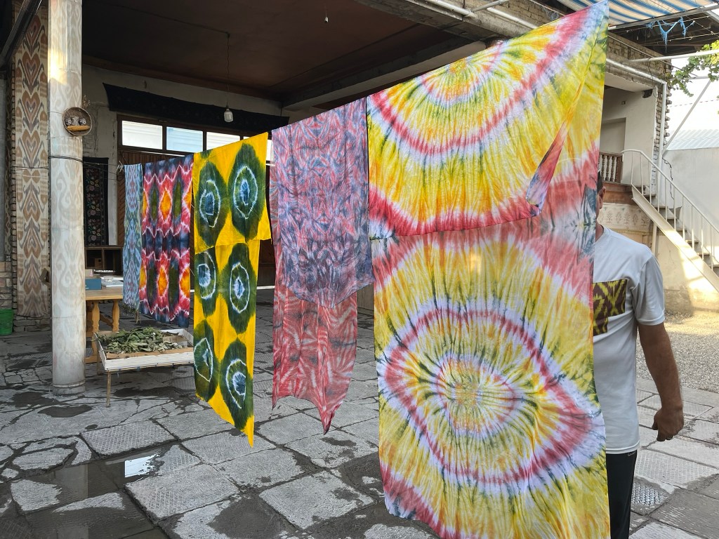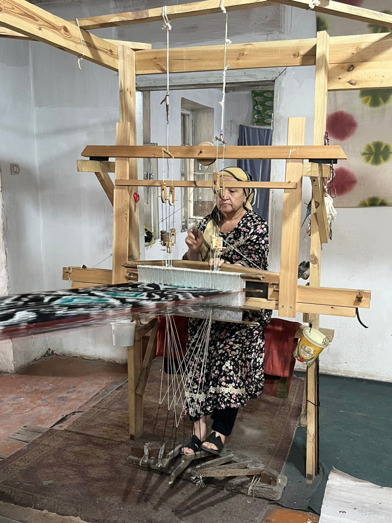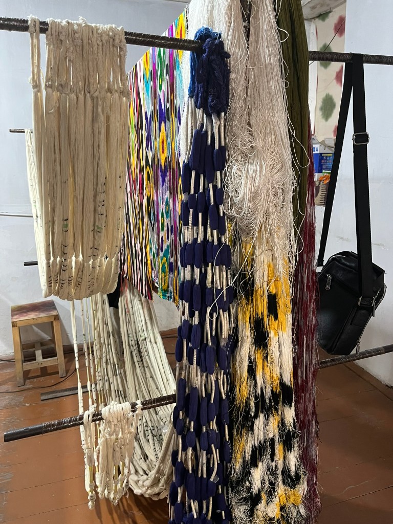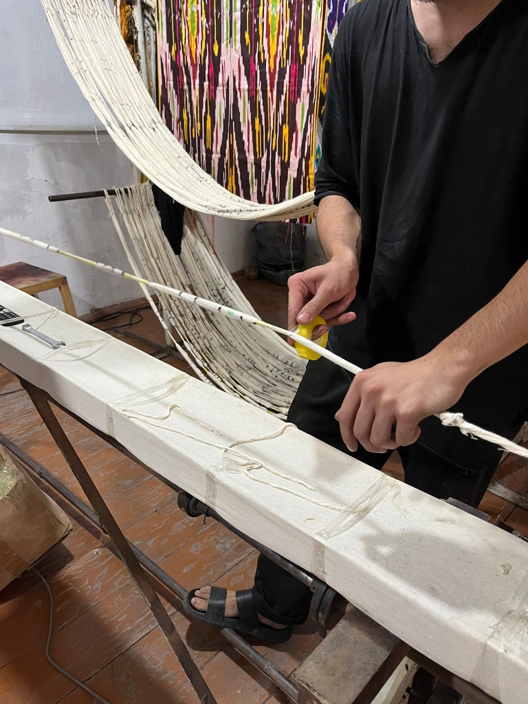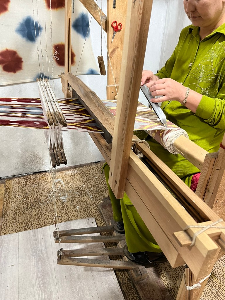 There are 2 types of fabric typically produced in Uzbekistan. Khan-Atlas is the most famous product – a brightly coloured silk ikat fabric with cloud or flame-like motifs. And Adras, which is a silk-cotton blend, lighter in colour and much more affordable. There are 2 types of loom set up here – 2 pedals and 8 pedals. The pedals of a loom determine which warp threads are lifted as the waft is passed through the gap and so different types of fabrics can be made on each. The 2 pedal loom creates a simple 2-sided plain weave and is traditionally used to create adras fabric. The 8 pedal loom allows for much more complexity and is reserved for atlas weaving. It creates glossy flowing fabrics with a soft drape – the fabric that Uzbekistan is most famous for. It was crazy to see the 8 pedal loom in practice – I don’t know how the weavers remember the sequence of pedals to use whilst also passing the waft back and forth.