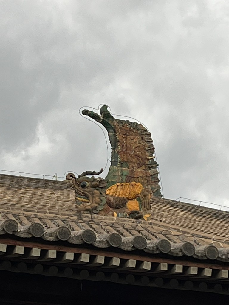 On top of the roof a pair of chiwen (dragon-fish), also known as roof dragons sit. They are a traditional part of Chinese architecture. The fish design is supposed to symbolize water and protect against fire. The dragon represents power. The pair that sit on top of the Huayan Temple are particularly famous for their size and brilliant green and yellow glazes. They also have a structural function and are not just for decoration. Their weight at each end, stabilizes the long roof ridges, shields the joints of the roof tiles from rainwater and deflects wind uplift.