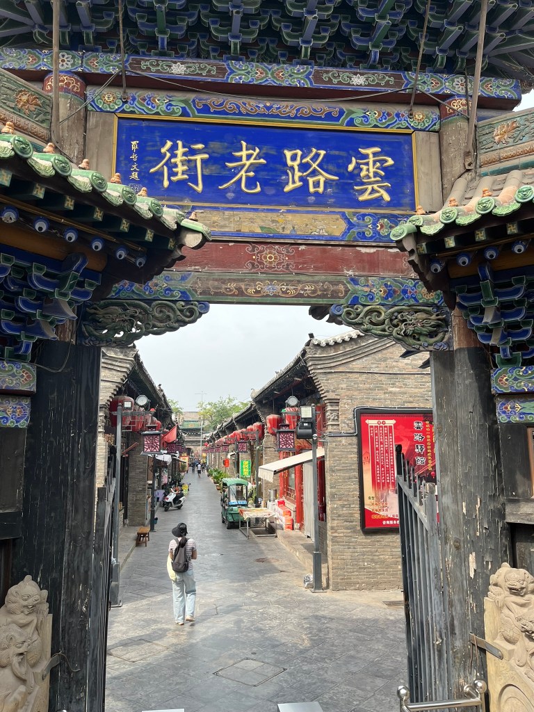We entering the walled city via the West Gate walking along one of the 2 main arteries of the city – West Street. Cars cannot enter the walled city and in the center it is pedestrian-only stopping the golf carts ferrying passengers to hotels and small scooters from clogging up the streets. This was the financial heart of Pingyao, and the street is lined with Qing-era merchant courtyards, banks and shops. The facades preserve their traditional grey brick design and wooden signage. The city is small and to get to the central intersection where the city tower lies between West and South street takes about 15 minutes at a slow pace. South street is the more commercial street in Pingyao, but retains its charm with original Ming-Qing era signage and shop fronts.