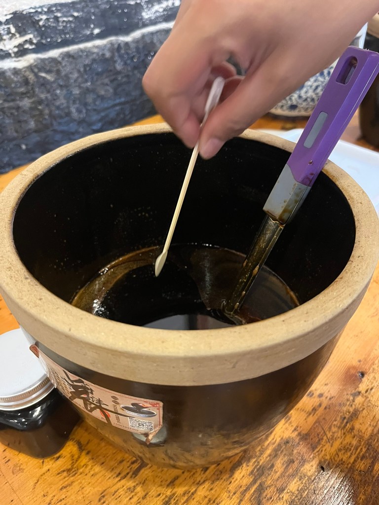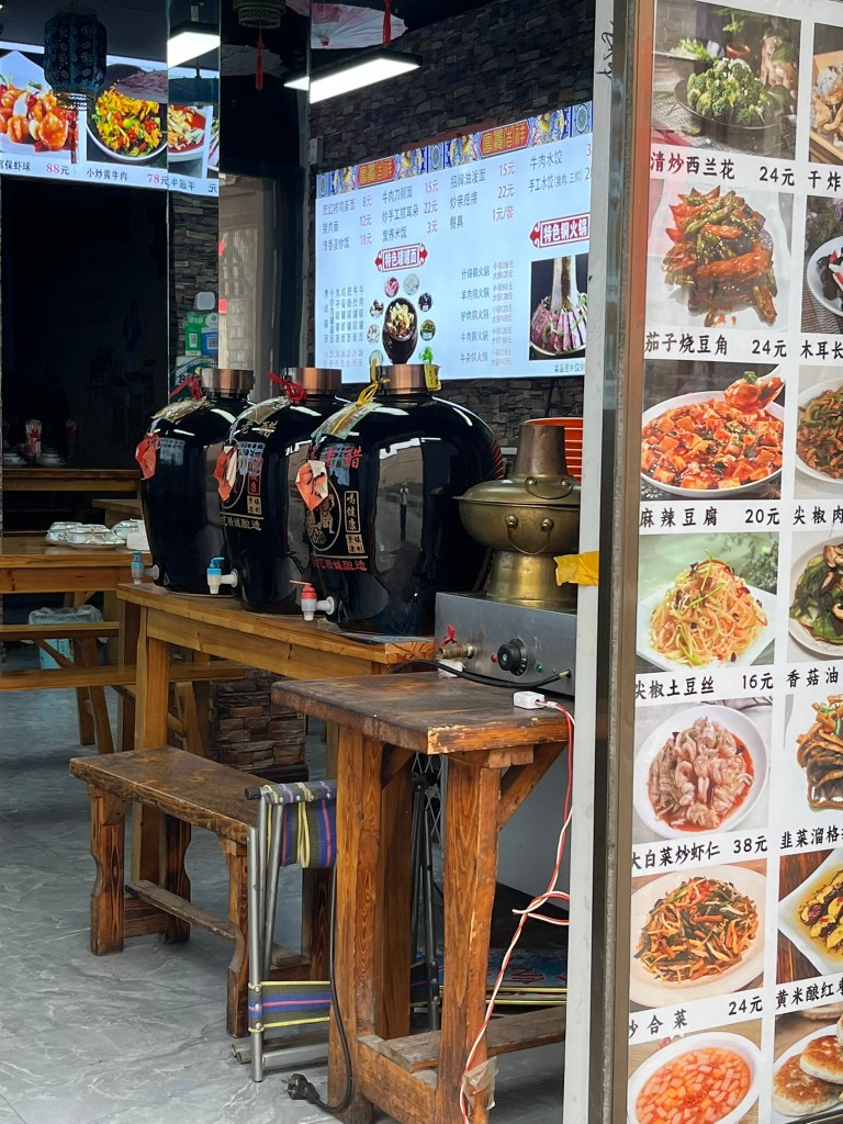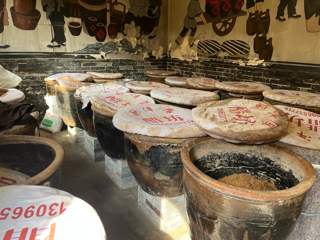 The primary ingredient is sorghum, sometimes mixed with barley and bran, which is steamed and then formed into bricks. It is then transferred to big pots and mixed with a fermentation starter to break down the starch into sugars and then alcohol. It is then exposed to a type of bacteria that turns the alcohol into acetic acid, producing vinegar. Unlike the vinegar we are used to in Europe, Shanxi vinegar is smoked and then aged outdoors in open pots allowing the sun to further ferment the mixture. Typically the mixture is fermented for up to 3 years before it is sold. I got to try a type of vinegar paste in the brewery, which is like a thick syrup that has had ginger, dates and medicinal herbs added to it. It was really good, but I wasn’t going to lug around a bottle of vinegar for 6 weeks, so I didn’t buy any!