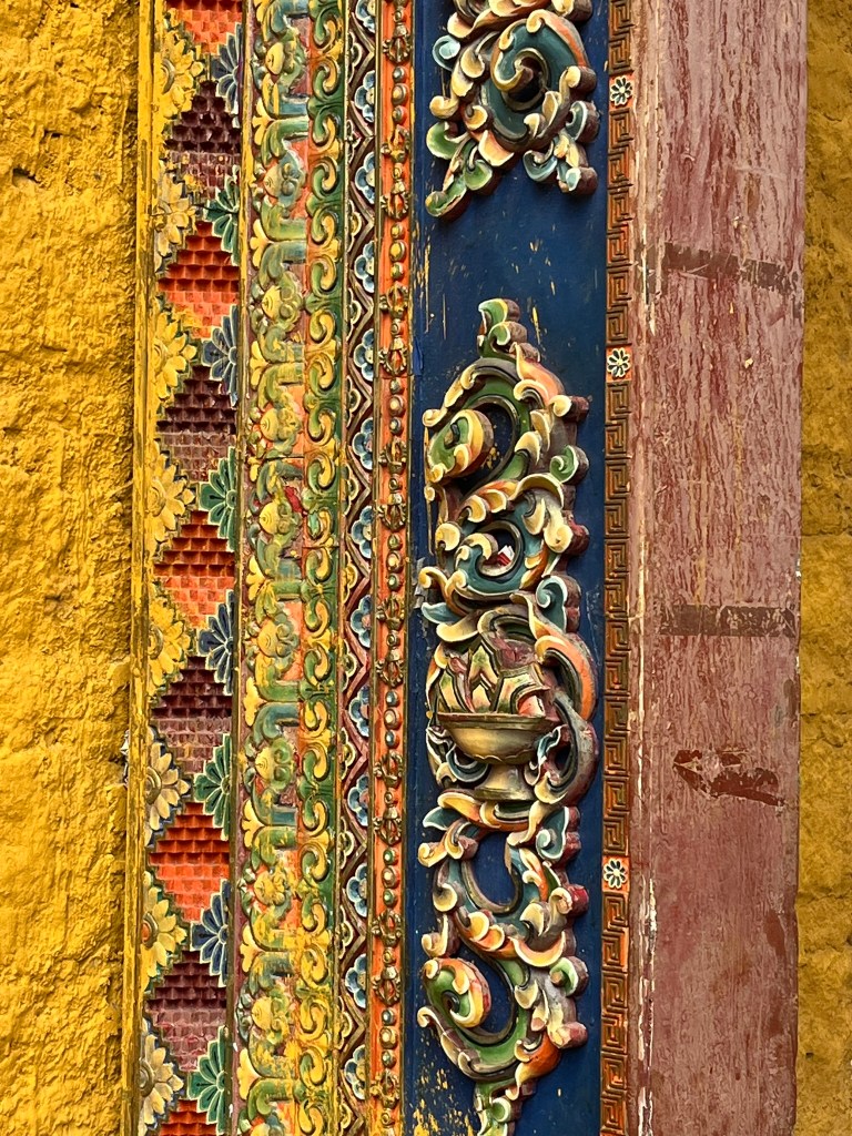 All of the buildings are white-washed, with beautifully carved and painted windows. Before we entered any buildings we talked a little bit about the traditional architecture that we were seeing in the monastery but had also seen along the main street near our hotel. Whether it is a family home and or palace, there is a specific architectural style used that is influenced by the climate, geography and culture of the region. The buildings are made of granite stone (readily available in the area) and rammed earth and made thick to insulate against extreme cold and intense sun. They are typically rectangular with in-ward facing compounds and the walls are thicker at the top than at the bottom. The walls slope in-ward just a tad, adding stability against earthquakes and strong winds.
