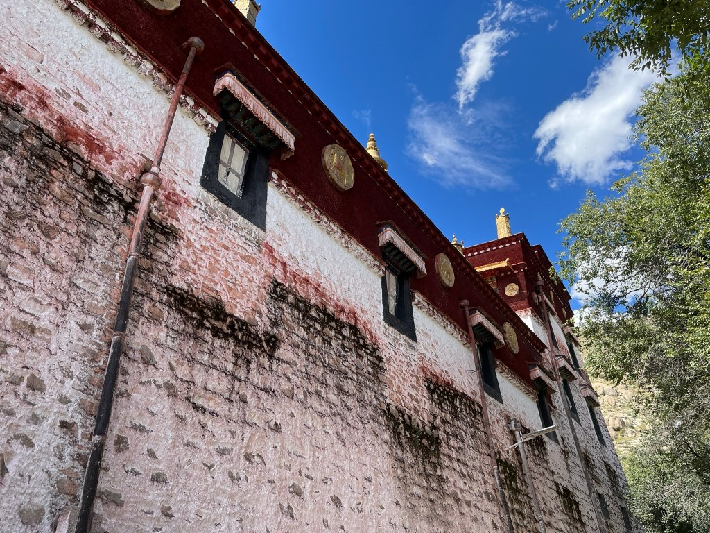 On the prayer halls there were red second floors and roofs. Traditionally branches and twigs are bundled together and tied with yak skin rope. These bundles are then shaped to form the upper stories of the prayer halls and painted red using iron-rich clay. A layer of earth and clay is packed over the top to make the roof flat and solid. This makes the upper stories of these buildings much lighter and absorbs some of the strong winds experienced in the region. Originally this design was purely practical but over time the red wash has become ritualised and a mark of a sacred building.
