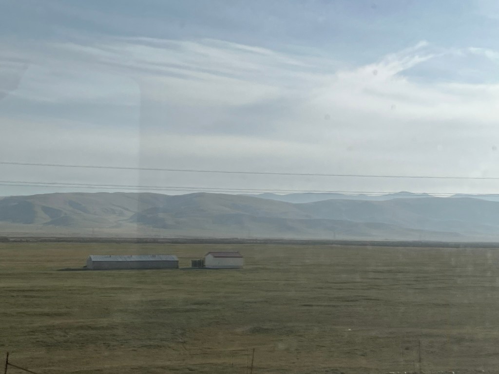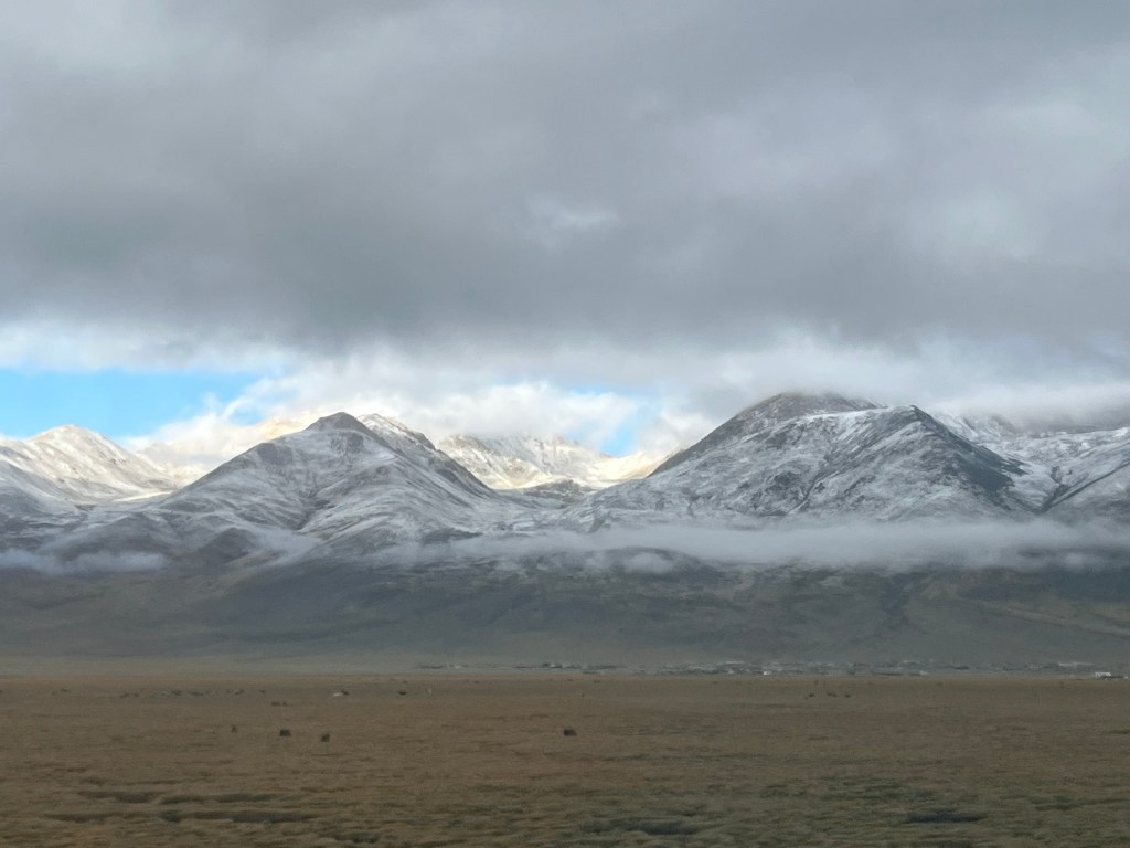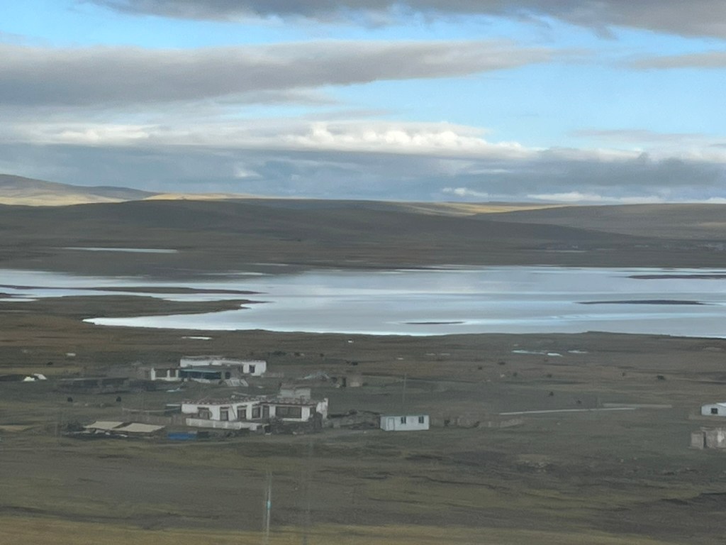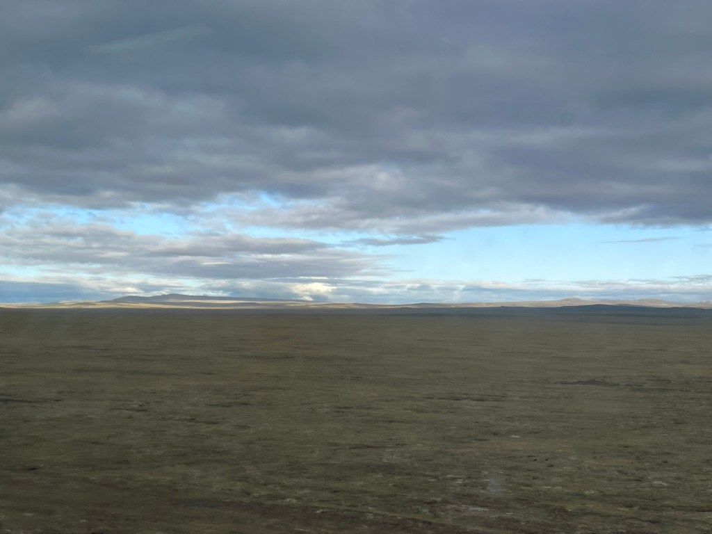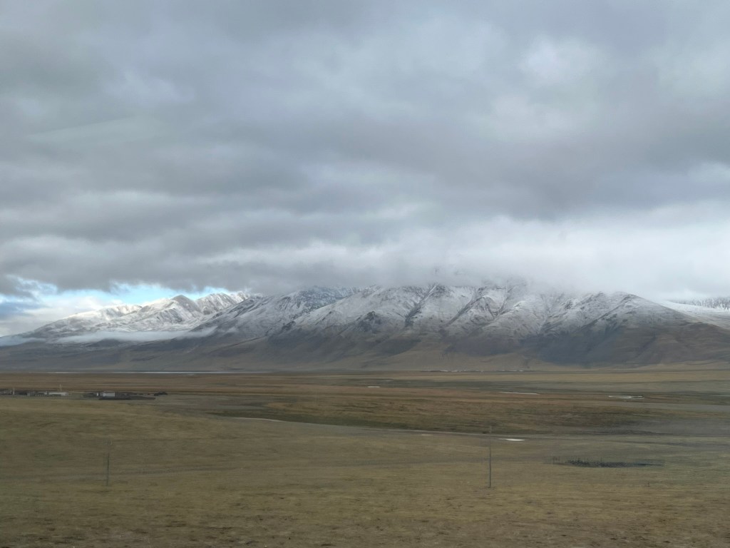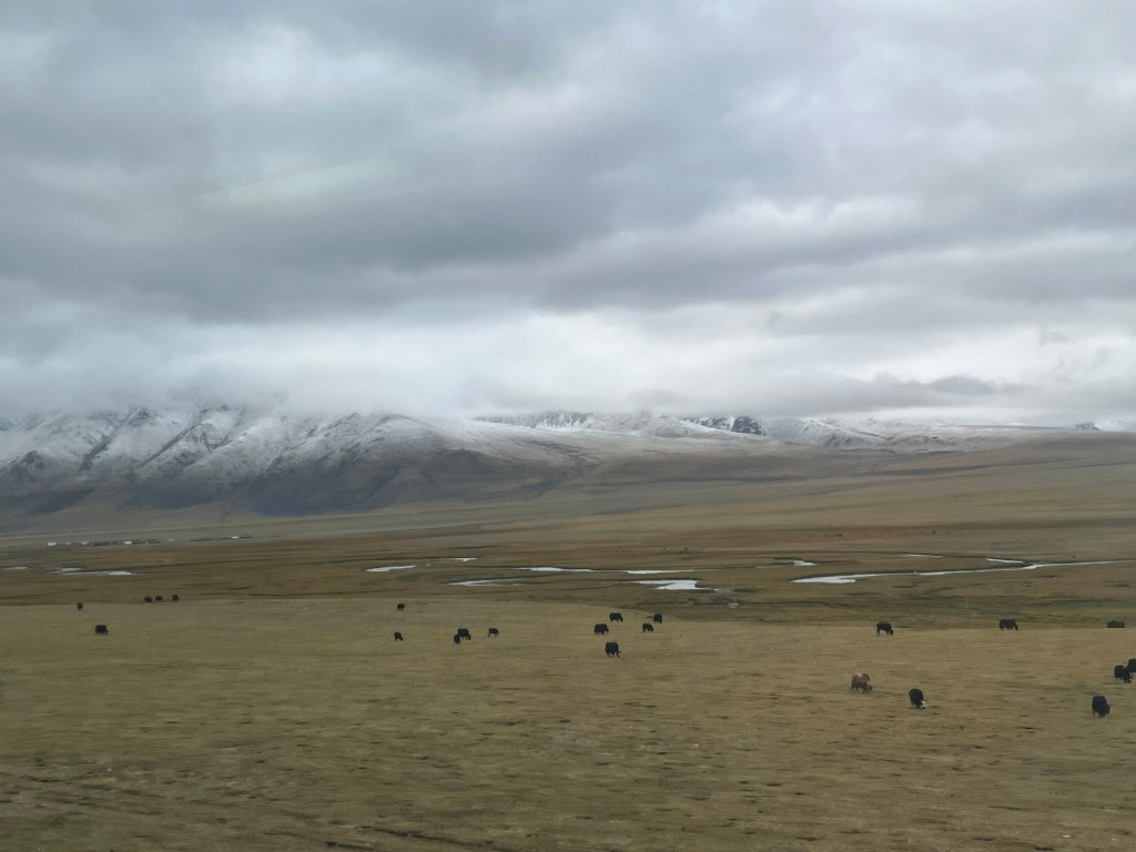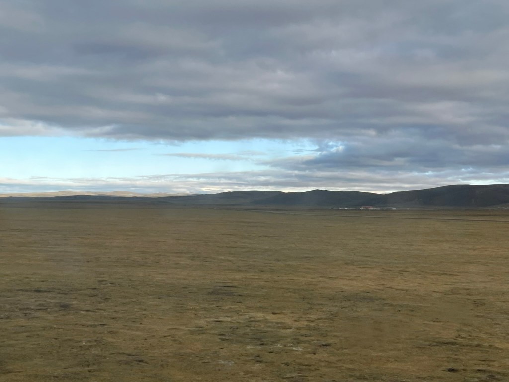 As night fell for our second overnight on the train we reached the city of Golmud, the last big city before we would start our ascent up to the highest parts of the plateau. At this point, a second engine was hooked on to the train to help us get up the steepest parts of the journey. And the oxygen was switched on. Although it was dark, it was easy to feel whilst lying in bed that sometimes we were going up very steep slopes and other times we were making long slow turns, presumably switch backs to make our way up to Tanggula Pass, the highest point we would travel through.