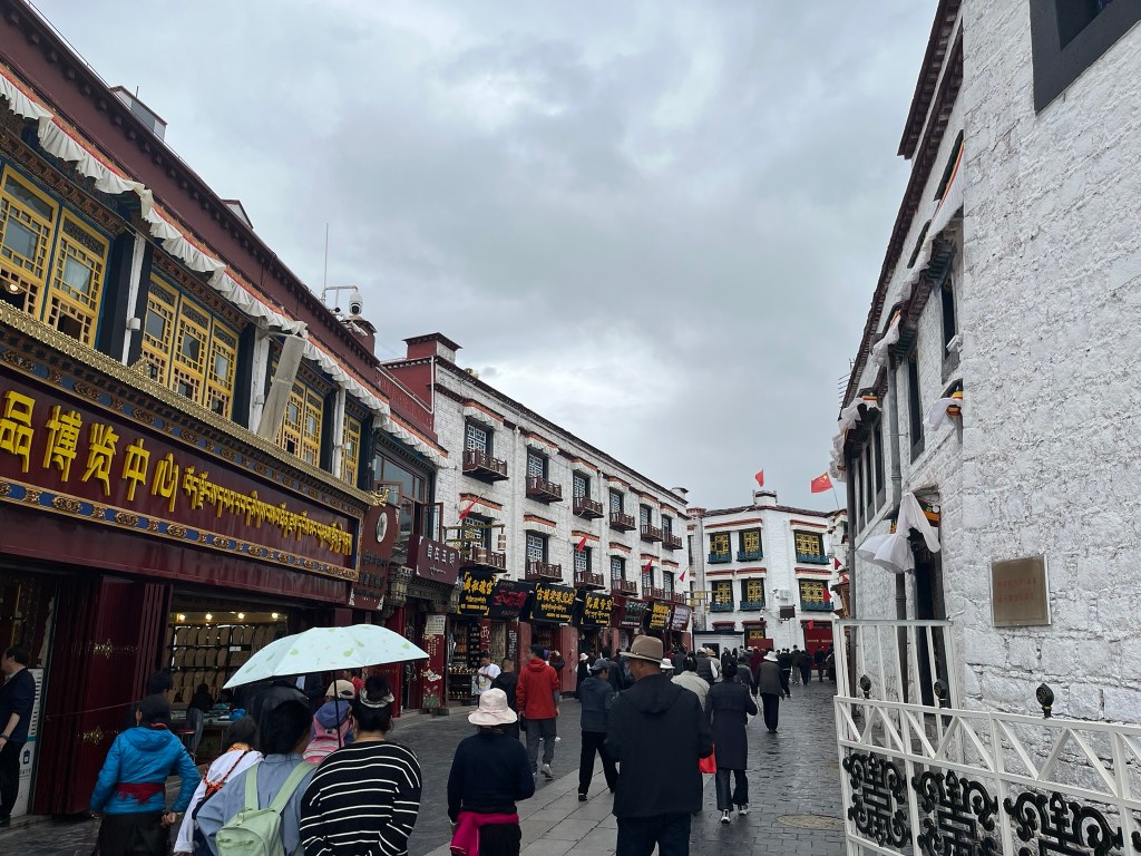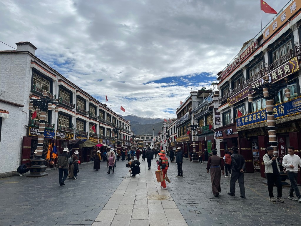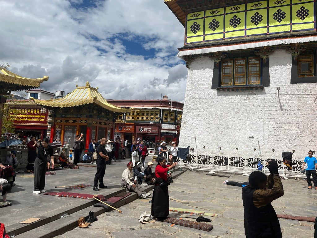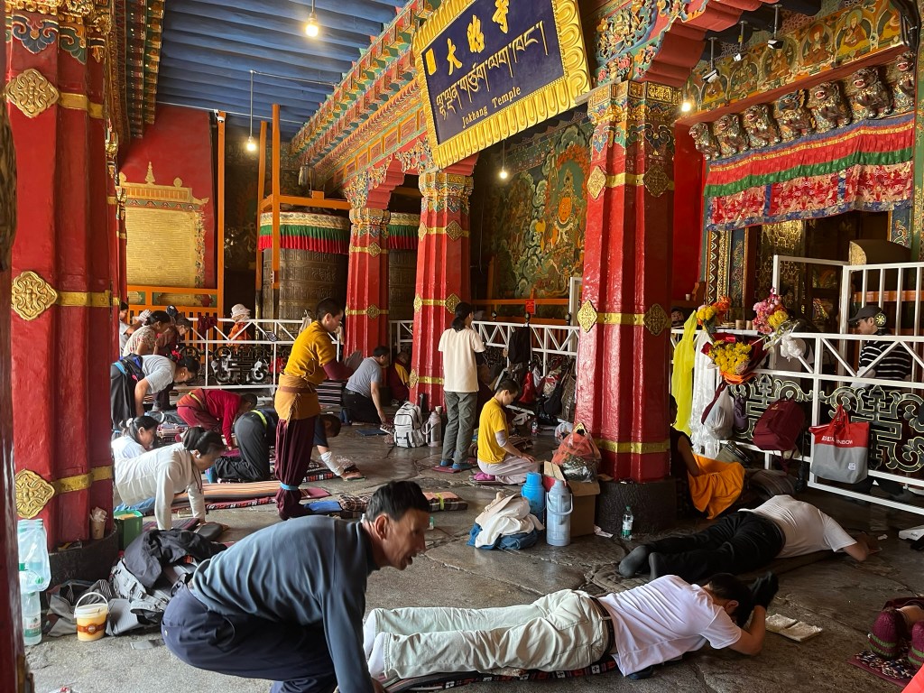 The other important part of any pilgrimage to Jokhang Temple is to complete a kora around the Barkhor circuit, travelling clockwise around the streets that encircle the temple. We saw hundreds of people completing their kora, reciting mantras, spinning their handheld prayer wheels and some even slowly making there way around doing prostrations. The Barkhor circuit is also a great place to go shopping, which feels a bit odd to say about a pilgrimage circuit. But the streets are lined with shops selling everything from prayer beads, to monks clothing and all the equipment like kneepads you might need if you are planning to prostrate.