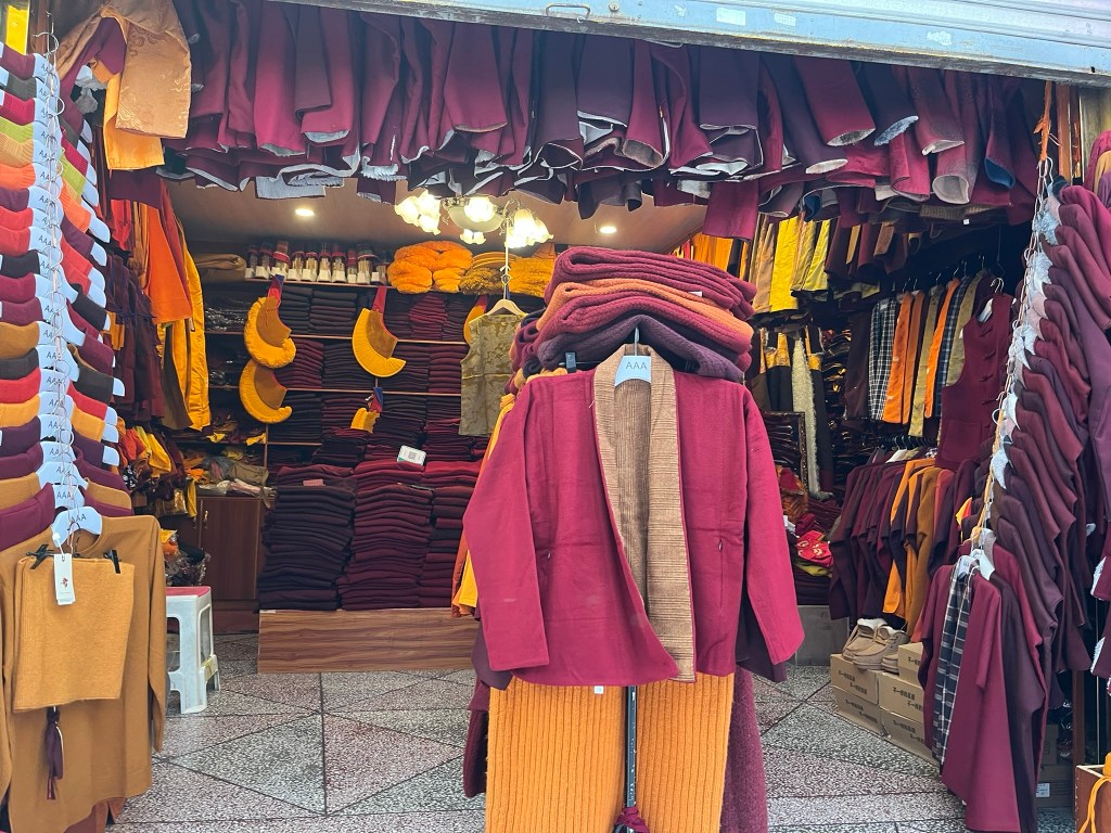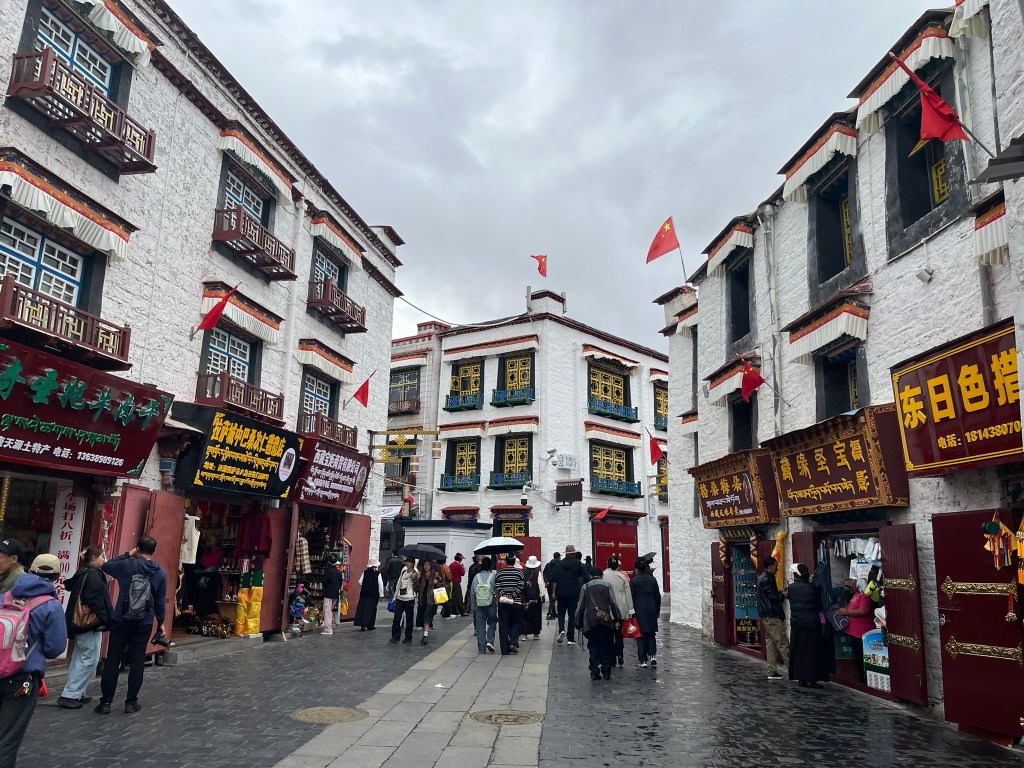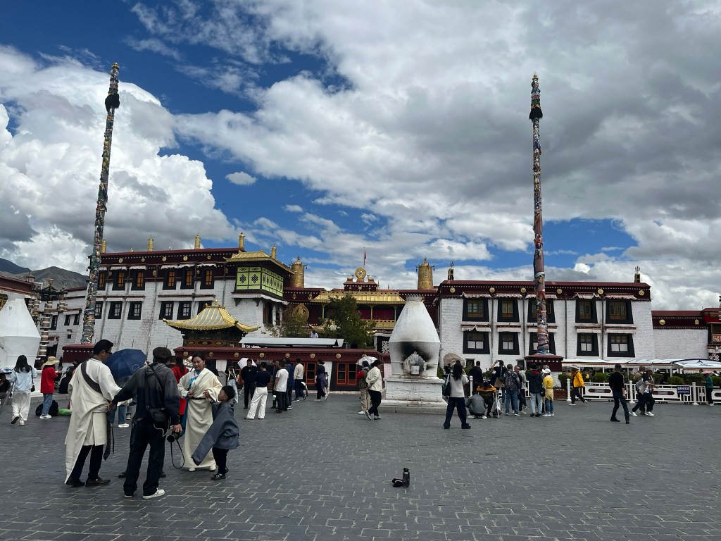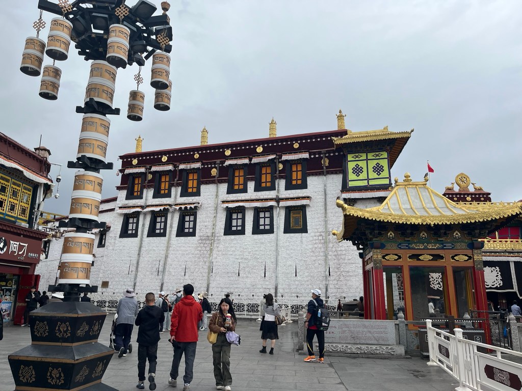 The other important part of any pilgrimage to Jokhang Temple is to complete a kora around the Barkhor circuit, travelling clockwise around the streets that encircle the temple. We saw hundreds of people completing their kora, reciting mantras, spinning their handheld prayer wheels and some even slowly making there way around doing prostrations. The Barkhor circuit is also a great place to go shopping, which feels a bit odd to say about a pilgrimage circuit. But the streets are lined with shops selling everything from prayer beads, to monks clothing and all the equipment like kneepads you might need if you are planning to prostrate.