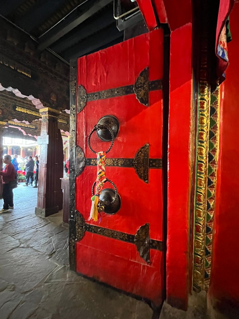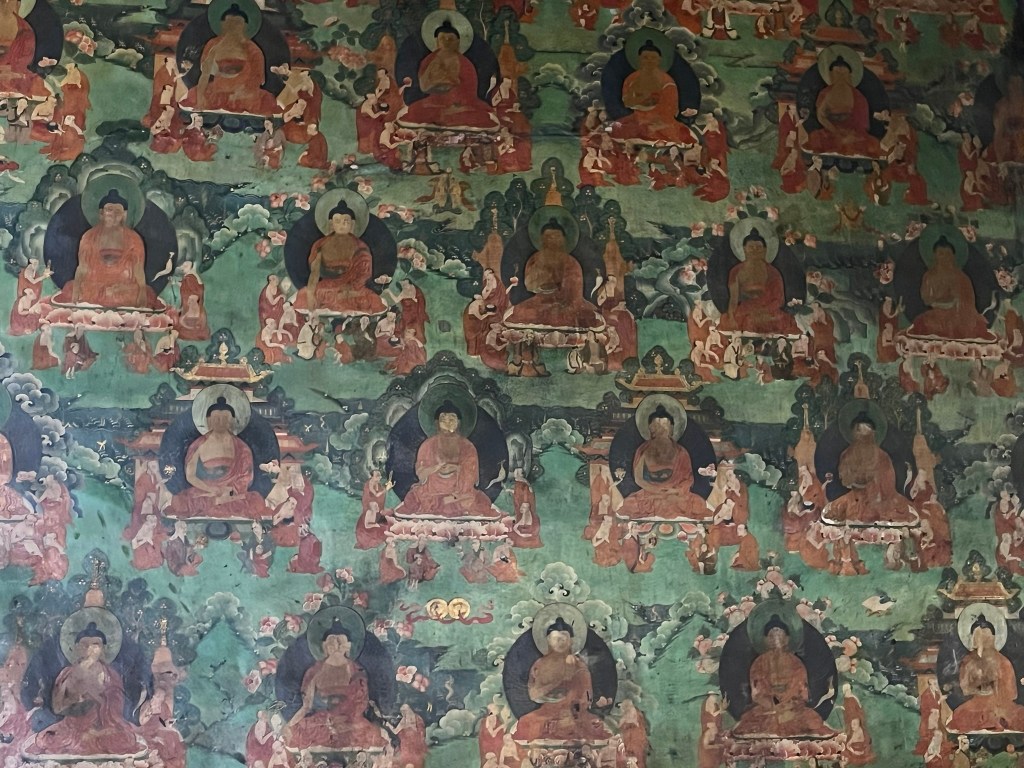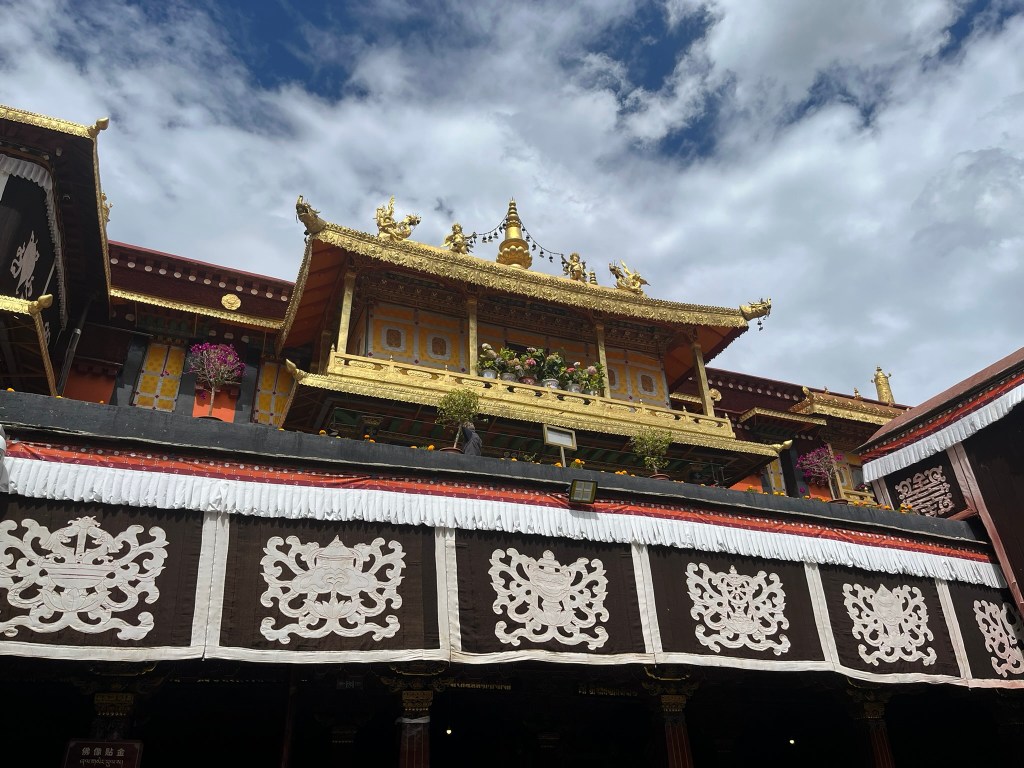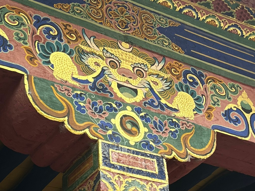 We were able to take photos inside the first courtyard and inner kora route but not in the temple itself, which is absolutely stuffed full of paintings, statues and giant mandalas. The temple style is a unique blend of Indian, Nepalese and Chinese Tang influences, with whitewashed walls, gilded roofs and intricately carved wood work.