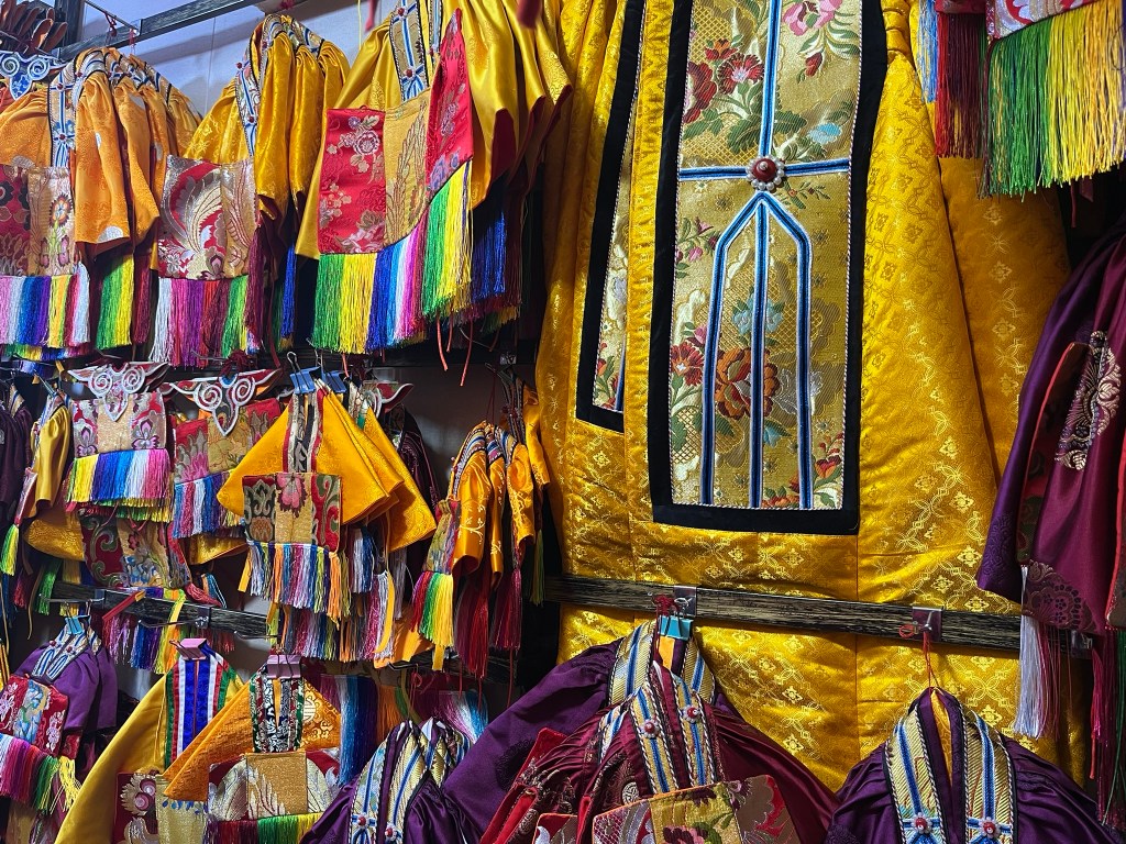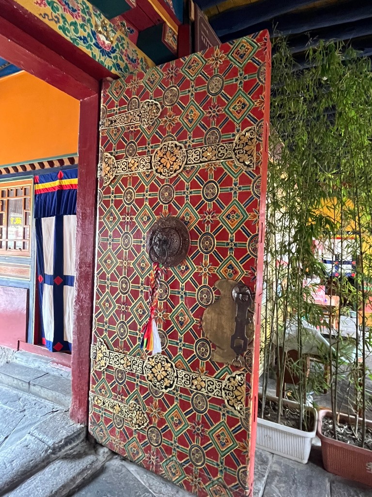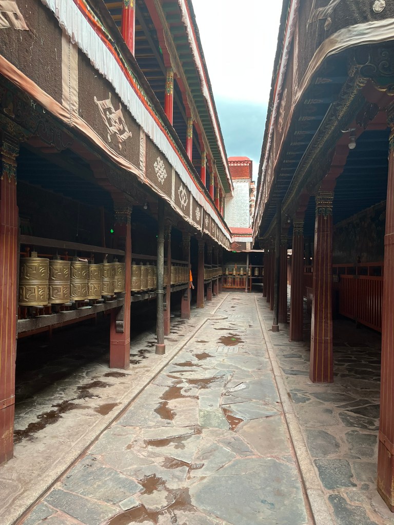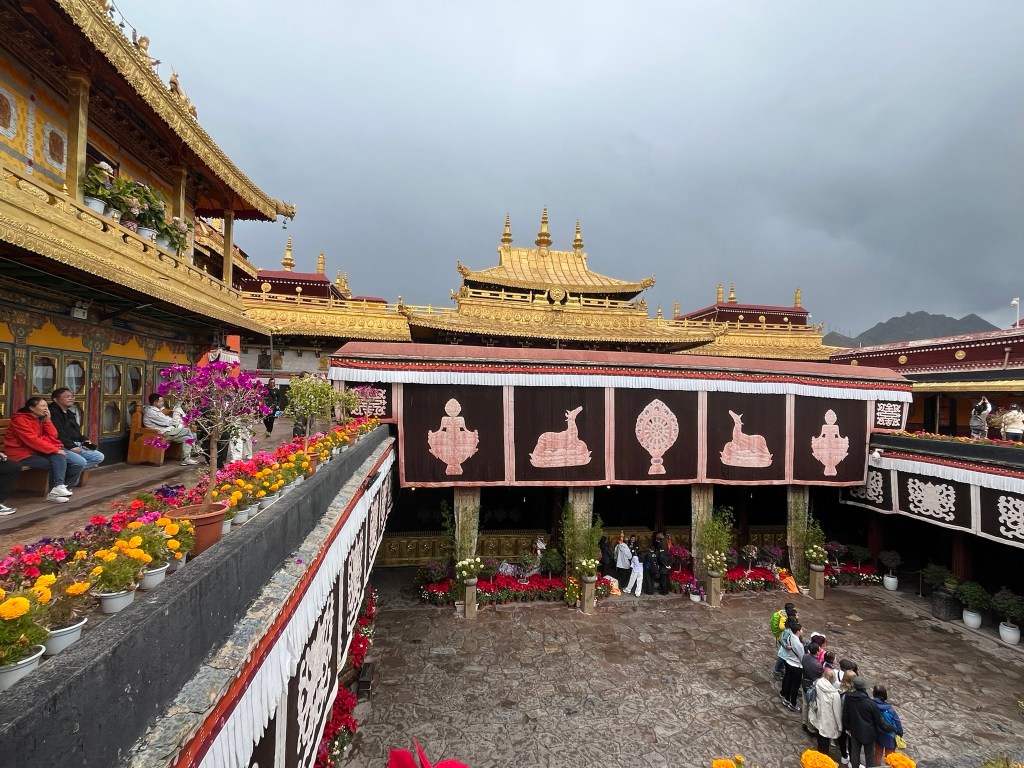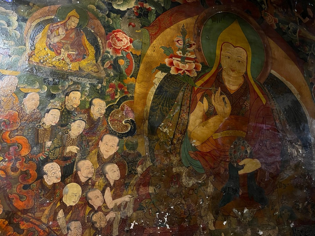 We were able to take photos inside the first courtyard and inner kora route but not in the temple itself, which is absolutely stuffed full of paintings, statues and giant mandalas. The temple style is a unique blend of Indian, Nepalese and Chinese Tang influences, with whitewashed walls, gilded roofs and intricately carved wood work.