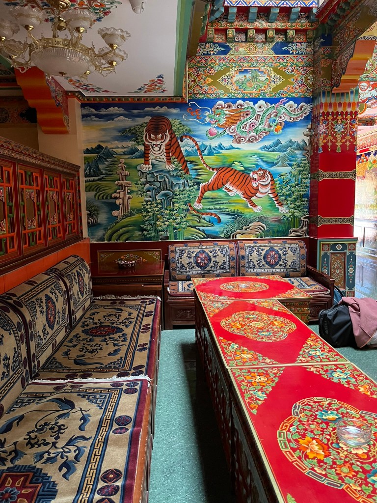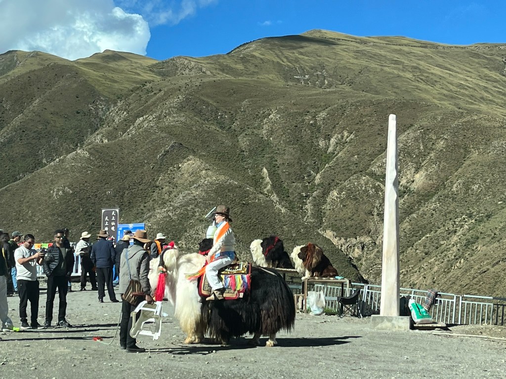 Along the drive, we saw many photo-stops where locals were offering tourists to take photos sitting on decorated yaks or sitting with the giant Tibetan Mastiff dogs, who oddly had sunglasses on. We didn’t participate in this as it’s a negative form of tourism. The dogs looked amazing and had really thick, gigantic fur. But you could see in their eyes how sad they were sitting on little pedestals waiting for photos to be taken of them. They are guard dogs by nature, used to looking after herds of yaks.