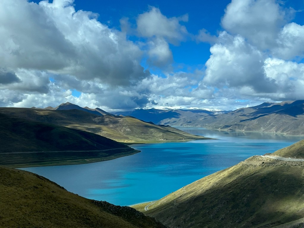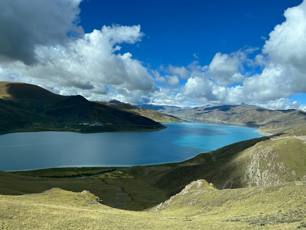 At the top of Kamba La Pass, we then started to head down to Yamdrok Tso lake, a huge sacred turquoise lake said to resemble a scorpion or the earring of a Buddha. We could only see a small part of it as we made our descent because its curved shape hid its full extent. It is believed to be the life-spirit of Tibet and if it were to dry up, then Tibet would become unhabitable. We drove down to a quiet spot on the lakeshore away and took a break from driving to have ginger-lemon tea and coffee.