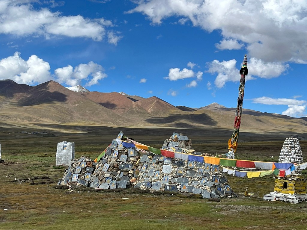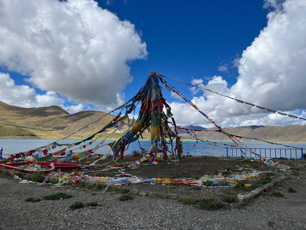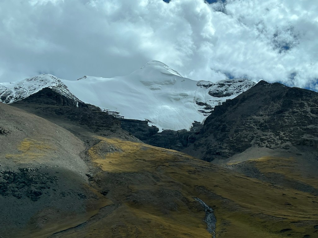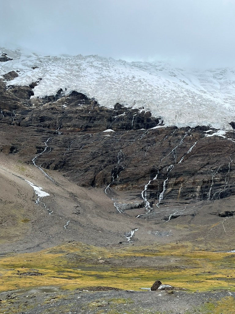 As we descended from our second pass of the day, this time the Karo La Pass at 5,045m, we were met with the sight of the hanging Karo Le Glacier tumbling steeply down the mountain literally almost onto the roadside, from Mount Nyenchen Khangsar. Both the glacier and the pass are considered spiritually significant, and there are stupa and prayer flags everywhere. Like many glaciers on the Tibetan plateau, this glacier has been retreating due to climate change, and visitors say that since the 80’s and 90’s the edge of the glacier is much further from the road than it used to be.