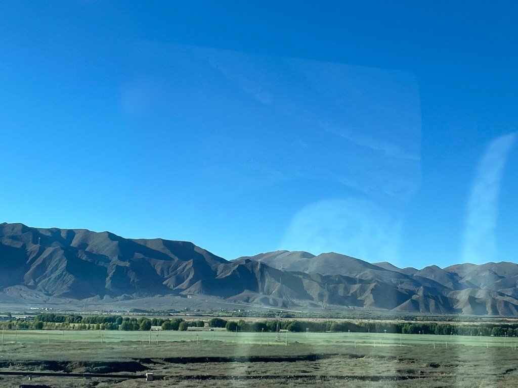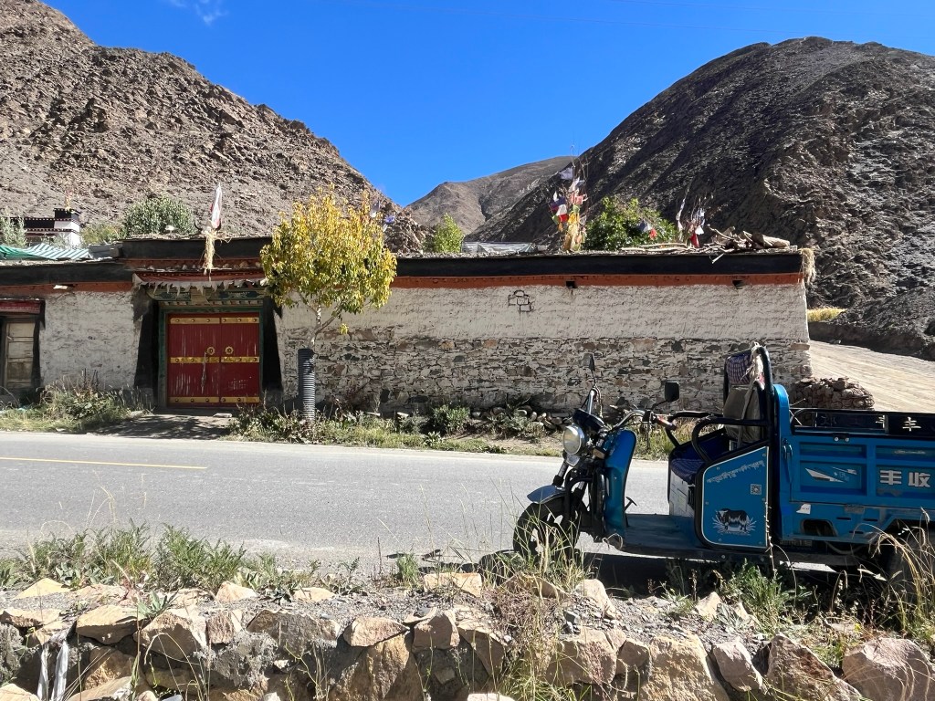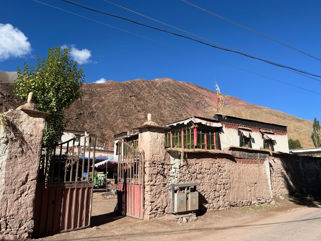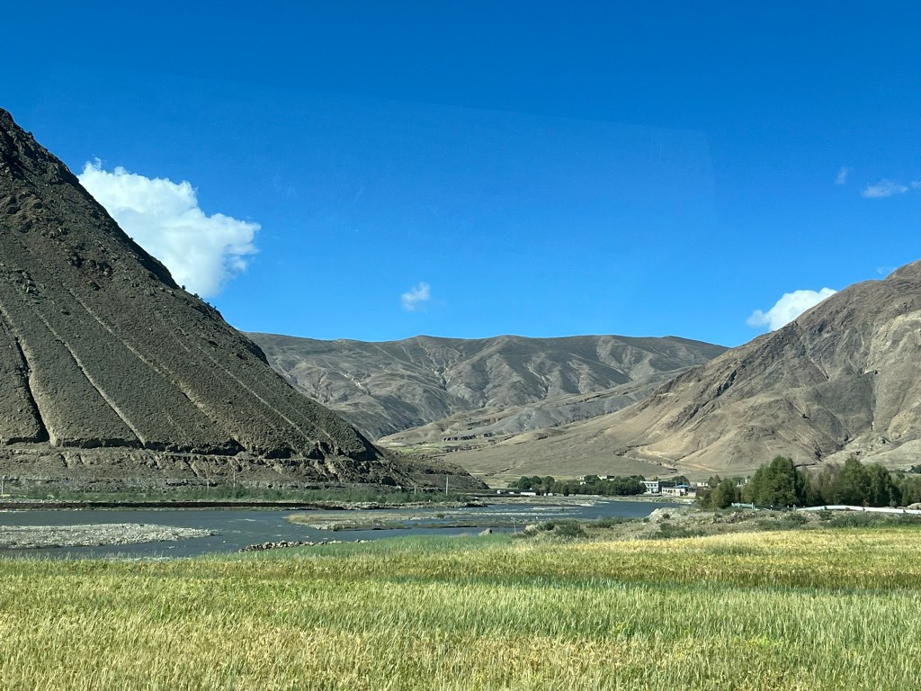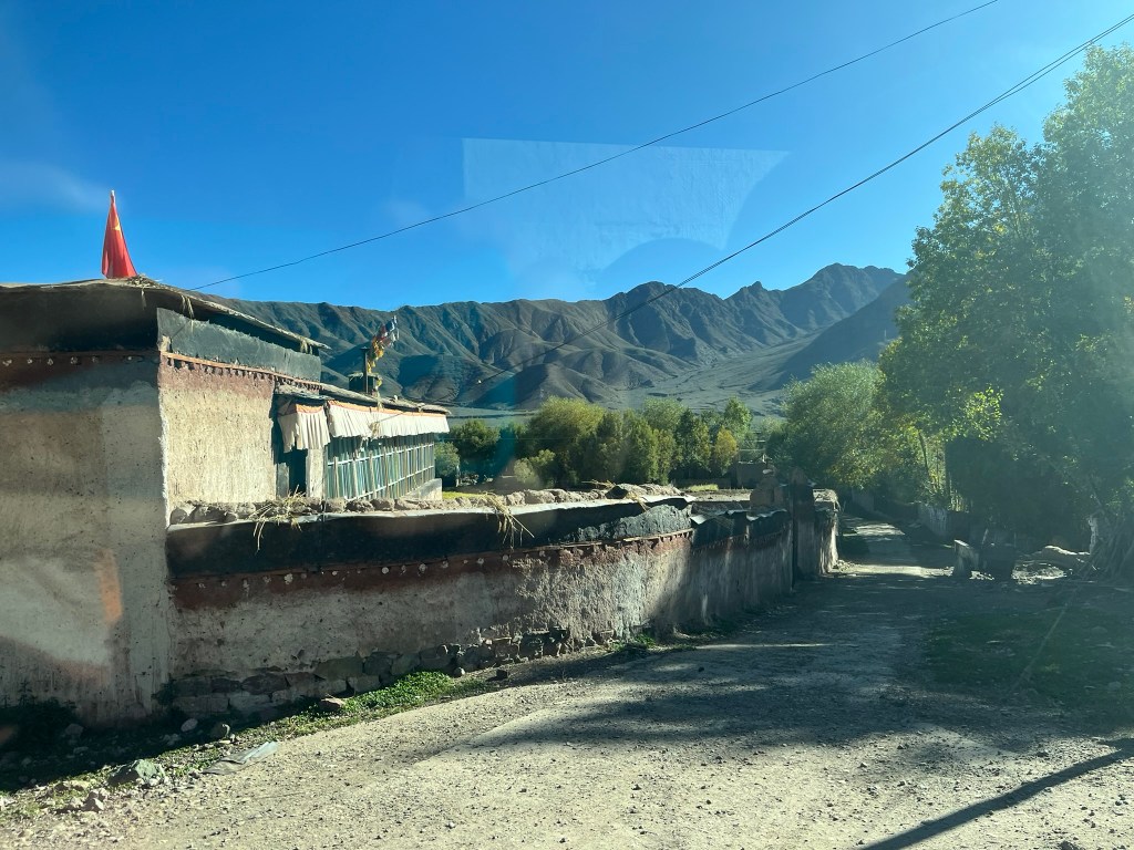 As we descended the mountains turn a much more grey-ish brown and look more slate like. But the fields of barley and herds of sheep and goats continued. We passed a number of villages that seemed to be in a state of disrepair, with a lot of construction materials on the side of the roads and many temporary tent structures. Our guide said that these villages had been affected by the 6.8Mw Tingri earthquake that happened in January this year. It was good to see that the new construction was mostly in the same design as traditional Tibetan homes although it looked like it was using modern materials rather than granite stones and rammed earth.
