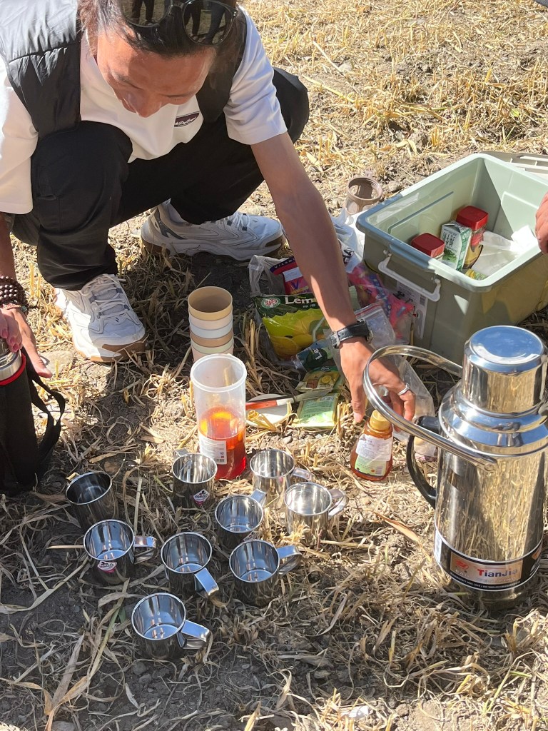 Our next stop was to have tea and coffee by the side of the road. We stopped by some recently cut barley fields by a river and asked the lady if we could sit in her field to take our break. She sat with us as our guide made fresh ginger and lemon tea.
